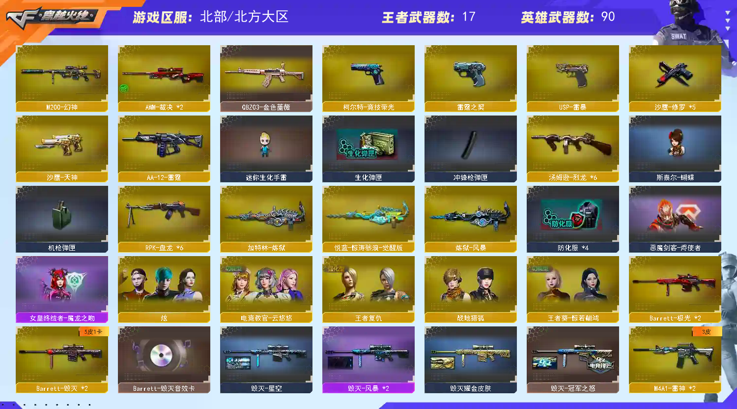 生化爆破双全装 双四防角色 生化爆破双属性 9a91烈火 巴雷特朱雀 火麒麟/雷神/毁灭/3音效卡 毁灭冠军之怒 火麒麟传奇even 雷神白鲨 佣兵觉醒6烈斯泰尔蝴蝶6盘炼狱惊涛骇浪不换弹!! 大区是北部战区里边的北方大区 老板选区时请注意;USP-雷暴,电竞教官-云悠悠,RPK-盘龙,QBZ03-金色蔷薇,M200-幻神,