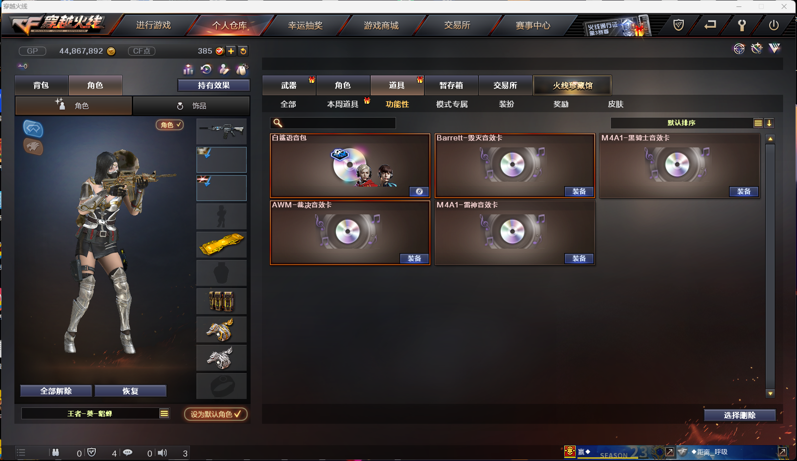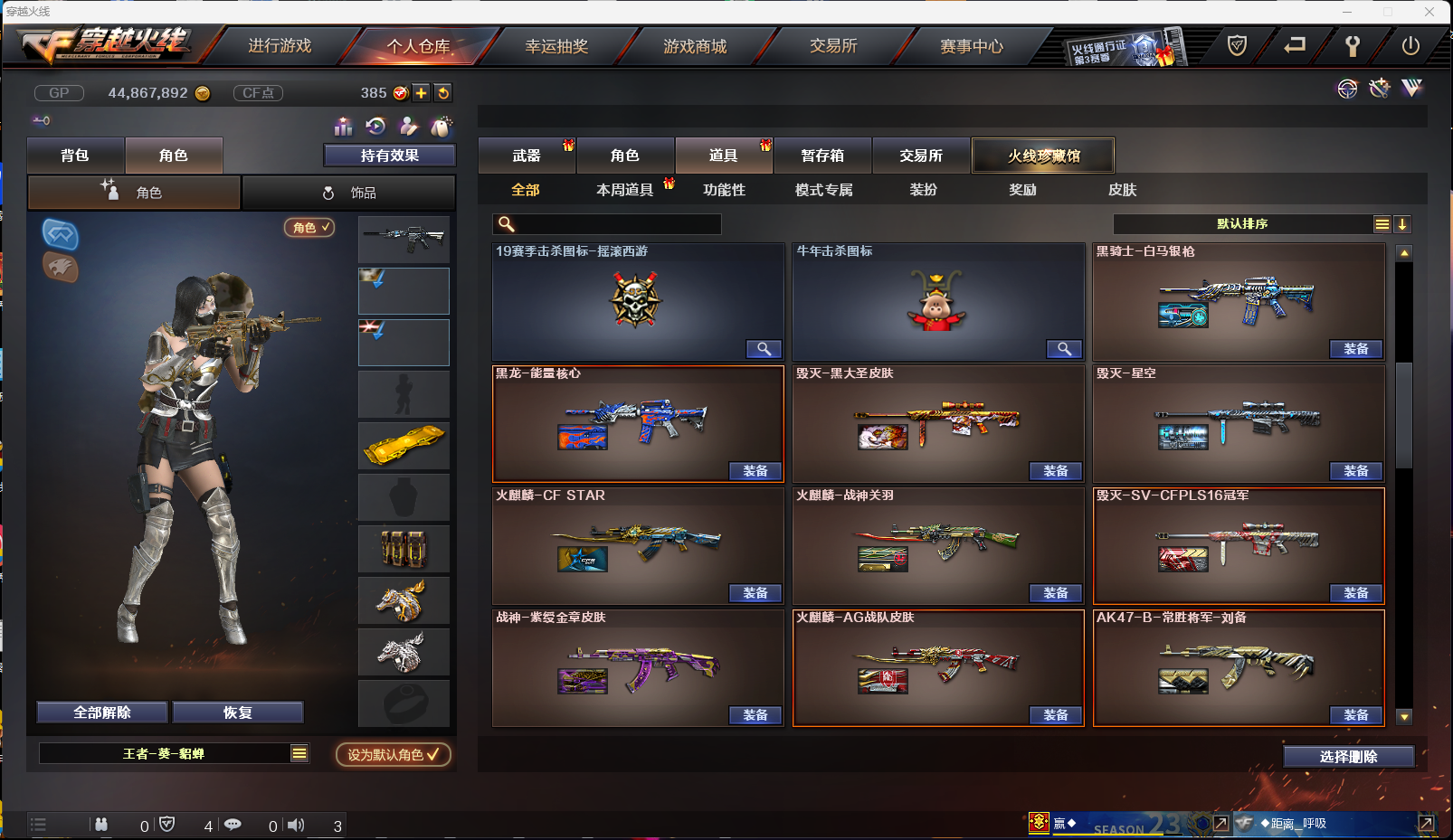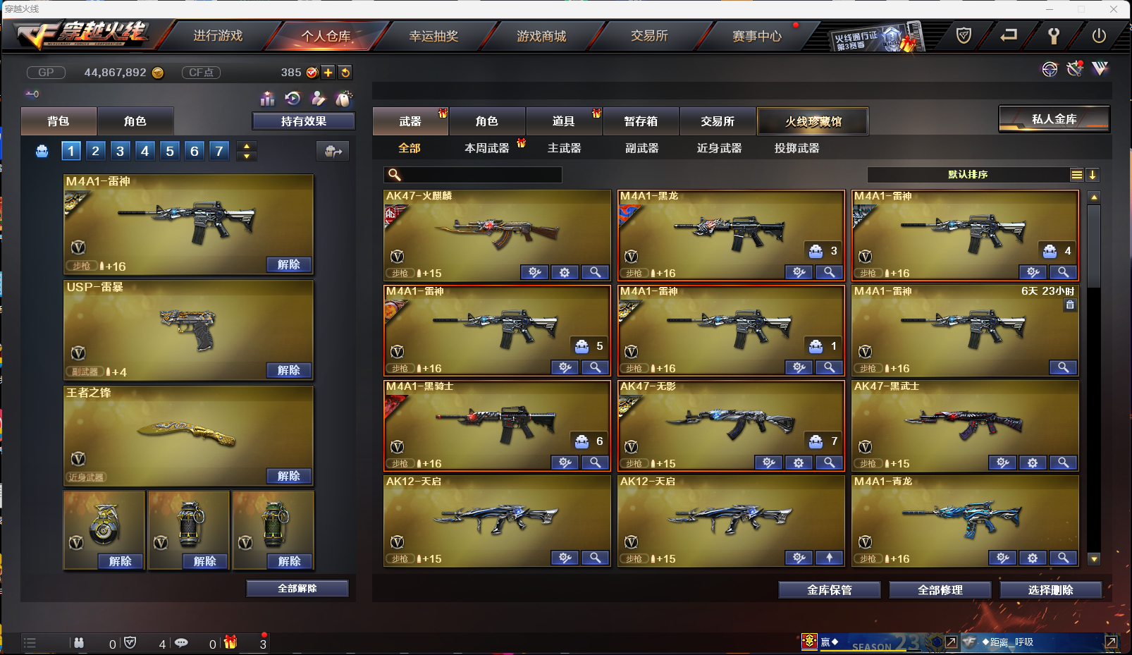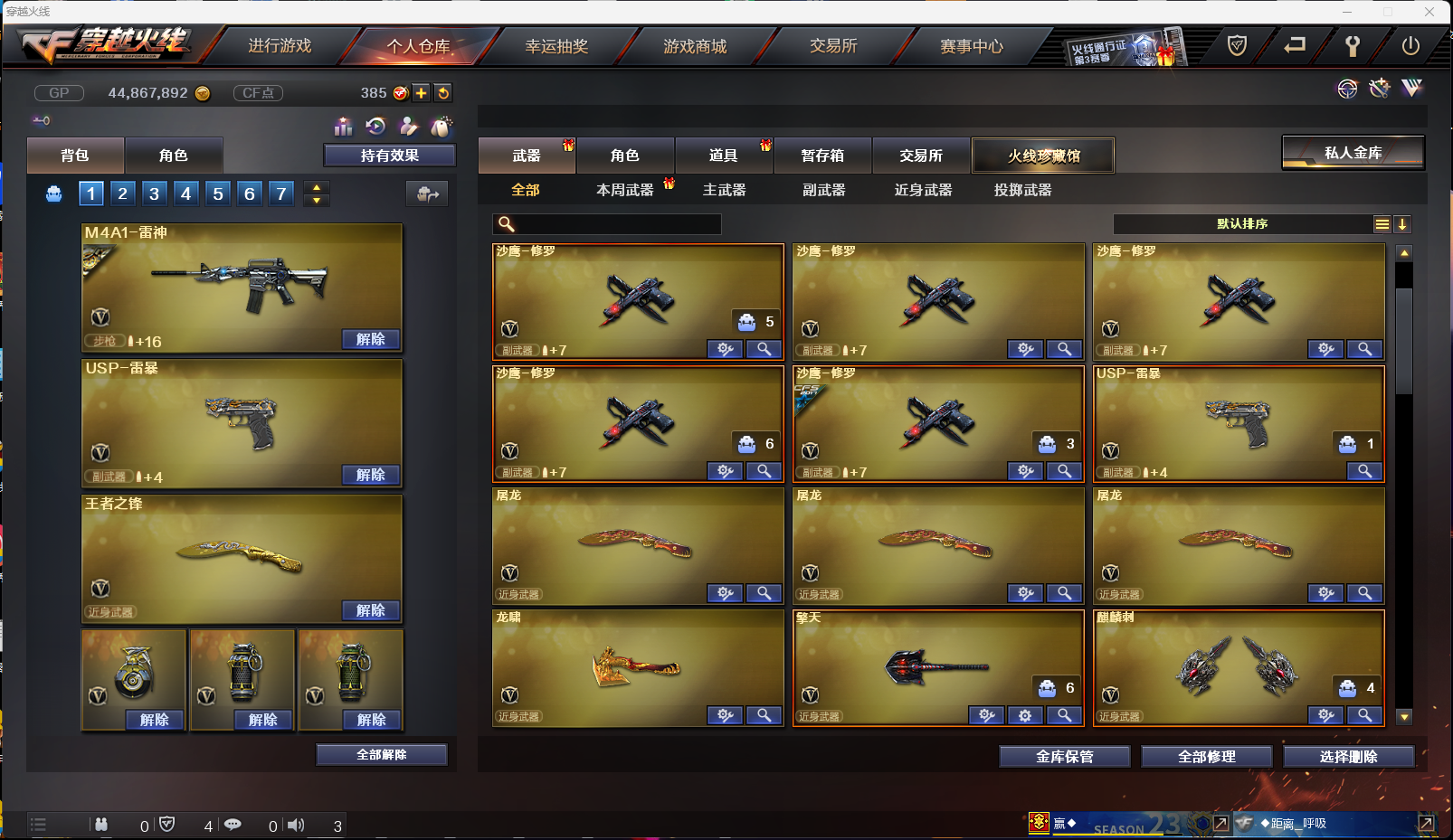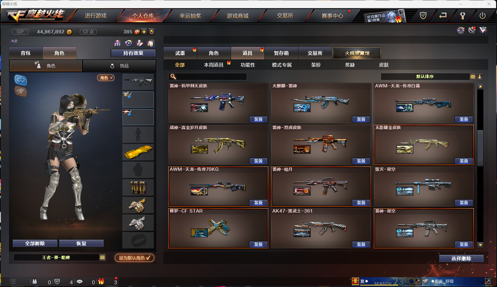 【西部战区】(四川一二 重庆一区 云南一区 陕西一区 合区) 83V VIP6 幻神/Scar白虎/青龙/qbz03金色蔷薇/火麒麟/黑龙/雷神/黑骑士/无影/黑武士/天启/王者之心/qbz03-王者蔷薇觉醒/天龙/裁决/毁灭/极光/2盘龙3炼狱/6烈龙斯泰尔蝴蝶/AA12雷霆等等 USP雷暴/5修罗/Colt 1911-大黄蜂/USP黑大圣/等等 3屠龙/龙啸/擎天/麒麟刺/尼泊尔雷霆/战神刀雷暴/王者之锋/王者之啸/王者之击/猫猫手套/轻型军用手斧镜等等 7套投掷/爆破全装永久 王者葵貂蝉/樱/初恋灵狐/职业选手/青霞仙子/烟雾头护目镜5000+天/XROCK炫彩背包/ESTAR炫彩背包等等 毁灭音效卡/黑骑士音效卡/裁决音效卡/雷神音效卡/白鲨语音包 雷神星空/雷神耀金/火麒麟CF star/修罗CF star/毁灭星空/雷神烈虎皮肤/黑武士361/无影耀金/黑骑士地狱火/火麒麟AG/毁灭SV/火麒麟战神关羽/火麒麟雷神/毁灭黑大圣/雷神机甲刑天/等等;USP-雷暴,RPK-盘龙,QBZ03-金色蔷薇,M200-幻神,Scar Light-白虎,
