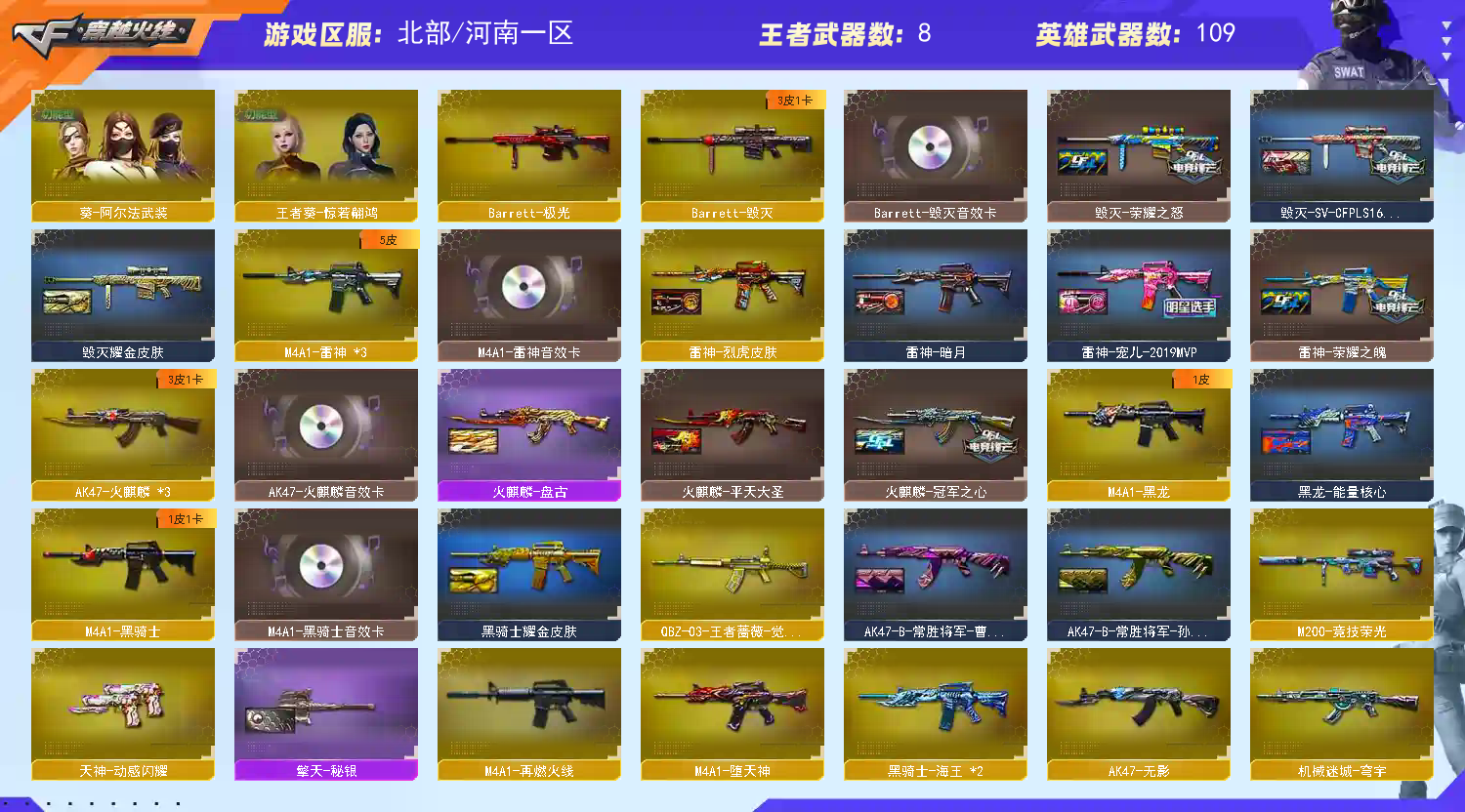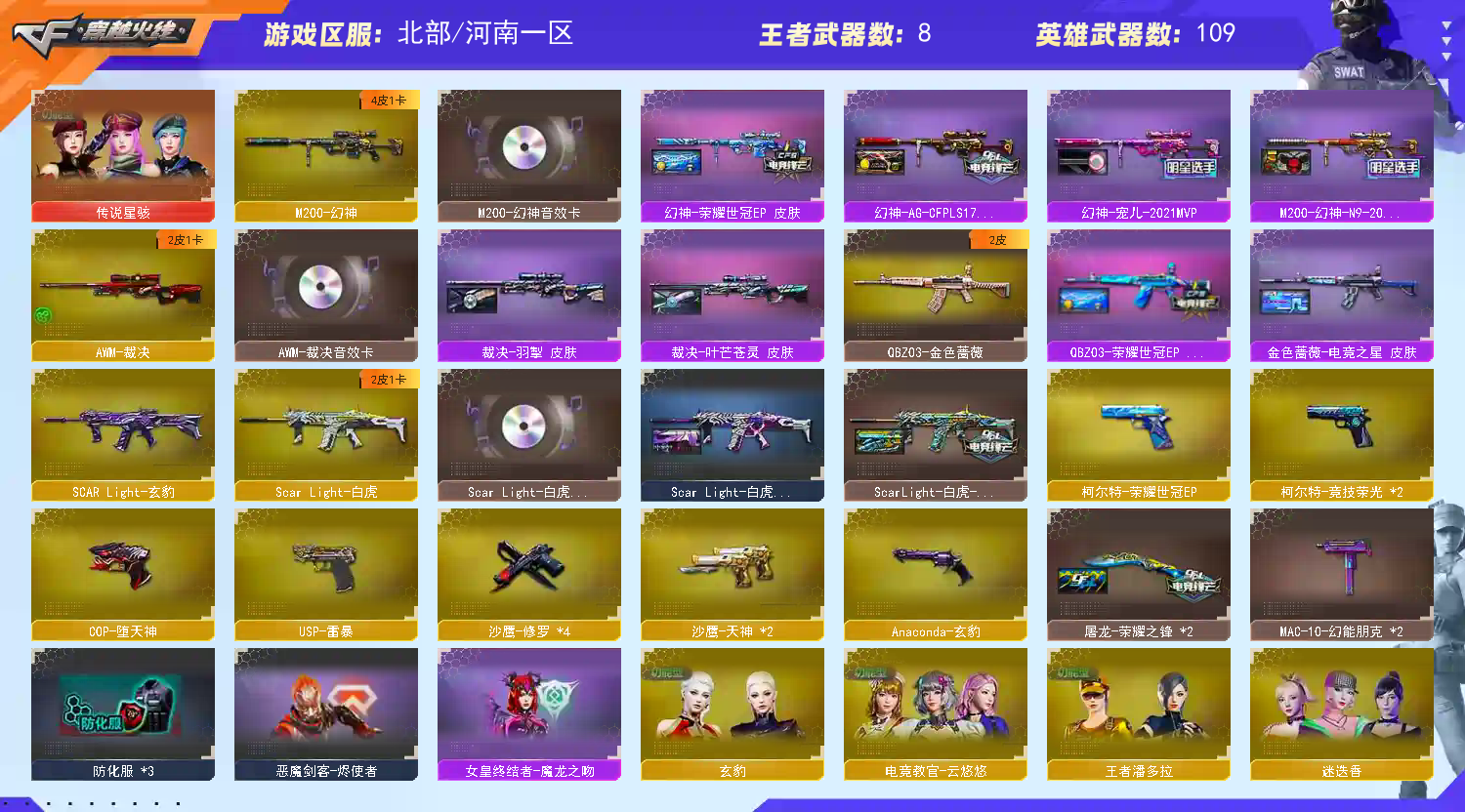 传说角色 幻神4皮带卡 白虎三件套 裁决三件套 】【四防传说星骇 】【m200幻神+音效卡+n9皮肤+ag17冠军+荣耀世冠ep+宠儿】【m200竞技荣光+usp雷暴+四防云悠悠 】【scar白虎+卡+暗星+冠军之虎】【qbz金色蔷薇+荣耀世冠ep+电竞之星】【朱雀】【火麒麟+卡+冠军之心】【黑龙】【雷神+卡+宠儿+荣耀之魄】【黑骑士+卡】【毁灭+卡+sv16冠军+ag15冠军+荣耀之怒】【极光】【裁决+卡+叶芒苍灵 】【堕天神套】【武器:堕天神 玄豹 海王 qbz王者蔷薇 王者之烈 】【12手枪:修罗*3 天神*2 雷暴 堕天神 竞技荣光 玄豹 荣耀世冠ep】【18刀具:屠龙*2 擎天*5 堕天神 幻灵之峰 竞技荣光 王者之锋 王者之击 】【7雷套:堕天神雷*7】【小人枪:雷神精英刀锋 】【音效卡:白虎音效卡 毁灭音效卡 雷神音效卡 裁决音效卡 幻神音效卡 火麒麟音效卡 黑骑士音效卡 幻神动感闪耀音效卡】【四防角色:云悠悠 王者葵惊若翩鸿 王者潘多拉 樱青春偶像 EP;USP-雷暴,传说星骇,电竞教官-云悠悠,QBZ03-金色蔷薇,M200-幻神,Scar Light-白虎,