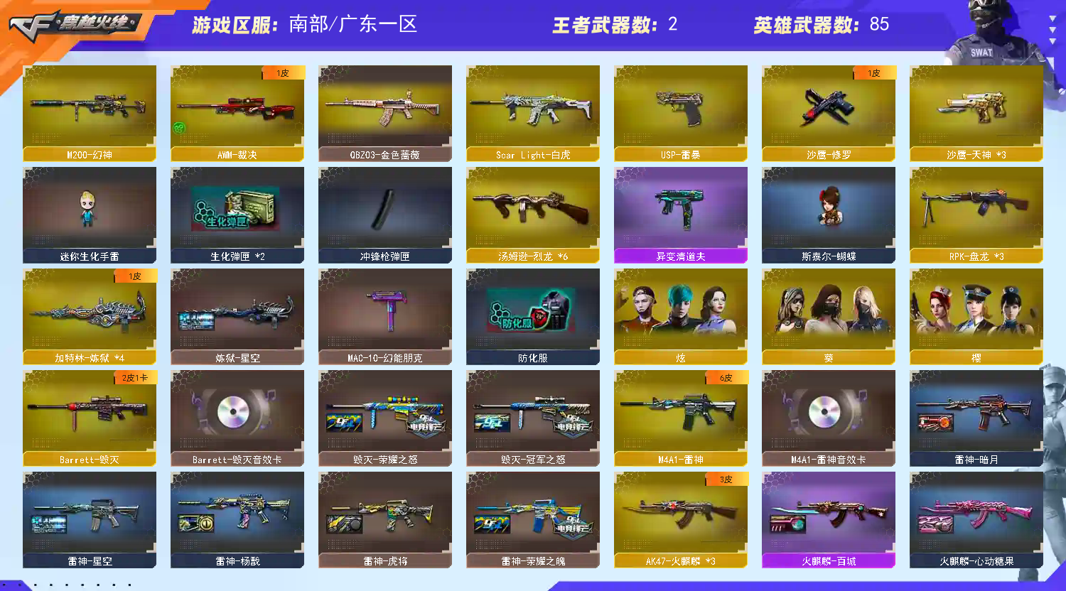 幻神/白虎/朱雀/QBZ03-金色蔷薇/6烈龙+斯泰尔蝴蝶+异变清道夫/3盘龙+4炼狱 USP雷暴/修罗/3天神/天神-动感闪耀 屠龙/4龙啸/麒麟刺/尼泊尔-雷霆/斩神刀-雷暴/马来剑-夜魔/幻灵之锋/屠龙-动感闪耀/王者之击 炫/葵/樱/潘多拉X 雷神音效卡/毁灭音效卡 毁灭-冠军之怒/火麒麟-轻羽/雷神-虎将/火麒麟-雷神/火麒麟-AG战队/雷神-杨戬等等;USP-雷暴,RPK-盘龙,QBZ03-金色蔷薇,M200-幻神,Scar Light-白虎,
