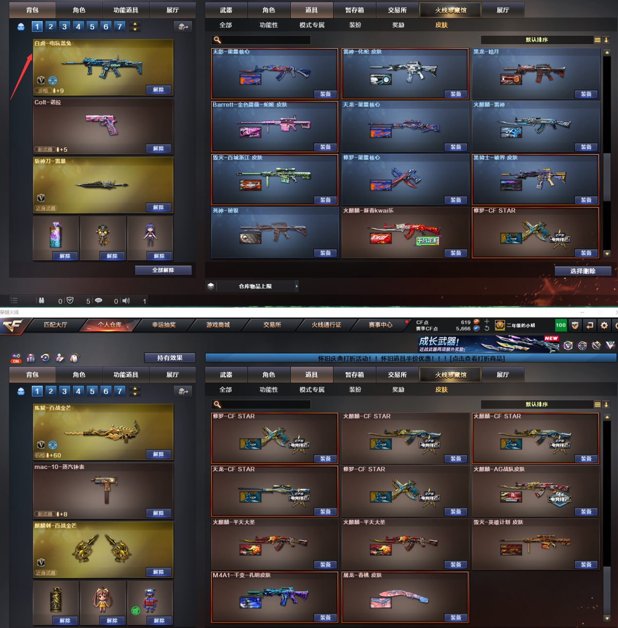 西部战区:云南一区、陕西一区、四川一区、四川二区、重庆一区,都是同一个服务器里面玩的。 【生化】:斯泰尔-蝴蝶🦋、毒蜂、HK21-领域力场、双面神、生存之眼、死亡之眼、轻型军用手斧-镜、(VEPR-12-宙斯、Glock-18-宙斯、宙斯权杖)、MK5-炽火炎龙、黑龙吞噬者、黄金生化钩 神秘方块-红色生化、机械猎手-幻灵猎姬、圣拳猎手-炽雪、救世主-黑桃战神、钢铁终结者-湮灭之柱、终极猎手-秦魂将军、恶魔剑客-烬使者、终极猎手-荒漠刀客、虚空终结者-暗域熔岩、女皇终结者-魔龙之吻、时空猎手-幻影猎人、 迷你生化手雷、迷你生化手雷-黑桃战神、生化手雷-小钢、生化手雷-机甲核心、生化手雷、雄黄酒手雷、 妖姬、伪装幽灵、变异宝贝、疯狂宝贝、绿色巨人、灵魂忍者、迷雾幽灵、夺命之镰、生化弹匣、防化服、减少停顿道具(不退包)、6盘6烈 华(捕食者之眼、佣兵觉醒:无需装弹、移动速度提升、生化背包变更、) 关小雨(捕食者之眼、佣兵觉醒:无需装弹、生化觉醒:狂暴化、生化背包变更、) 超能女侍·觉(移动速度提升、捕食者之眼、佣兵觉醒:无需装弹、生化背包变更、) 【王者】:凤吟之魄、王者之心、王者之城、王者之圣、王者之武*2、王者蔷薇、王者之光*4、王者之刺、王者之瞳、玫瑰精灵悦动、 【音效】:擎天-云海游龙音效卡、天神-动感闪耀音效卡、修罗-云海游龙音效卡、烈龙-云海游龙音效卡、 【皮肤】:白虎-热带奇洋皮肤、龙啸-蛇姬皮肤、雷神-机甲刑天皮肤、死神-机甲核心皮肤、雷神-宇航兔皮肤、炼狱-电子连击皮肤、雷神-源计划2.0专属皮肤、炼狱-迷彩皮肤、白虎-百战金芒皮肤、屠龙-惊鸿皮肤、火麒麟-百城、裁决-运输船皮肤、火麒麟-雷神、毁灭-神秘黑洞皮肤、炼狱-玩具枪皮肤、雷神-暗月、黑龙-暗月、火麒麟-心动糖果、死神-秘银、毁灭-百城浙江皮肤、雷神-化蛇皮肤、黑骑士-破界皮肤、Barrett-金色蔷薇-蛇姬皮肤、火麒麟-新春kwai乐、火麒麟-AG战队皮肤、火麒麟-平天大圣、毁灭-英雄计划皮肤、屠龙-春桃皮肤、M4A1-千变-孔明皮肤、龙啸-青青莓果皮肤、裁决-胜者为王皮肤、火麒麟-CFSTAR、天龙-CFSTAR、修罗-CFSTAR、 (天龙-能量核心、无影-能量核心、黑龙-能量核心、极光-能量核心、雷神-能量核心、修罗-能量核心、) 【挑战】:《主武器》:冰龙粉碎者-白马银枪、激光毁灭者Ⅲ、激光毁灭者Ⅲ-白马银枪、乱世-超越2、神圣爆裂者-末日Ⅲ、征服者-超越2、M240B-苍雷、末日裁决者、《副武》:巡航者、《近武》:等离切割者、末日之拳、双龙、斩神刀、冰火魔兽、夺魂、迷你波特博士、迷你深渊冰龙、魔能环、魔能镰刀、萨拉坦铁棍、死亡之珠、唐刀-大唐荣耀、《投掷》:反应堆手榴弹、魔花手雷、深渊终结者手雷、手雷-波特魔方、无尽虚空手雷、 【英雄武器】:零、葵、蝴蝶、关小雨、华、M4A1-千变、AK47-火麒麟*3、M4A1-黑龙、M4A1-雷神*4、M4A1-黑骑士、AK47-无影、M4A1-死神、AK12-天启、AN94-超新星、M4A1-武圣、AK47-机械迷城、AK47-黑鲨、无影-神兵利器、G36C-幻影、QBZ03-云龙、黑骑士-锦绣游龙、超新星-热带奇洋、M4A1-凌龙-Ⅳ、死神-雪域霜狐、机械迷城-穹宇、HK417-朱雀-电竞之星、M4A1-玫瑰精灵、QBZ95-幻兽、QBZ03-金色蔷薇、烈火-动感闪耀、AK-47-猩红传说、黑骑士-海王*3、白虎-电玩蓝兔、AWM-天龙、Barrett-毁灭、Barrett-极光、AWM-裁决、Barrett-金色蔷薇、RPK-盘龙*6、炼狱-百战金芒、加特林-炼狱、汤姆逊-烈龙*6、烈龙-云海游龙、沙鹰-修罗*3、沙鹰-天神、Glock18-武圣、天神-动感闪耀、COP357-云龙、柯尔特-电竞之星、破空枪刃、沙鹰-幻兽*6、屠龙*4、龙啸、擎天*3、麒麟刺、斩神刀-雷暴、屠龙-动感闪耀、擎天-云海游龙、云龙扇、龙啸-热带奇洋、麒麟刺-百战金芒、屠龙-电竞之星、女皇利刃-幻兽、龙啸-烈火龙威、手雷-雷暴*3、手雷-动感闪耀、手雷-云海游龙、高爆手雷-云龙*7、高爆手雷-幻兽*6、闪光弹-雷暴*3、闪光弹-云龙*7、闪光弹-幻兽*6、烟雾弹-雷暴*3、烟雾弹-云龙*7、烟雾弹-幻兽*6、;RPK-盘龙,QBZ03-金色蔷薇,G36C-幻影,