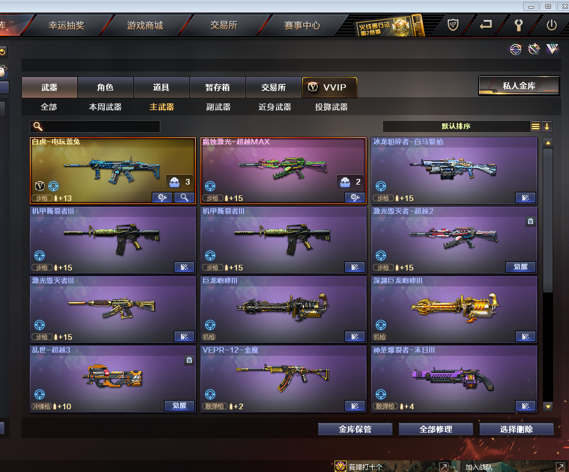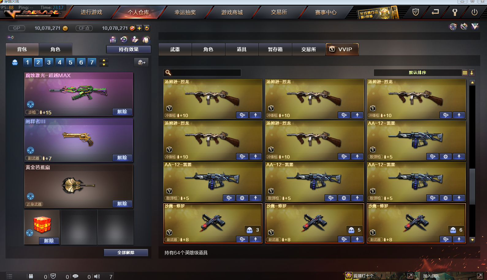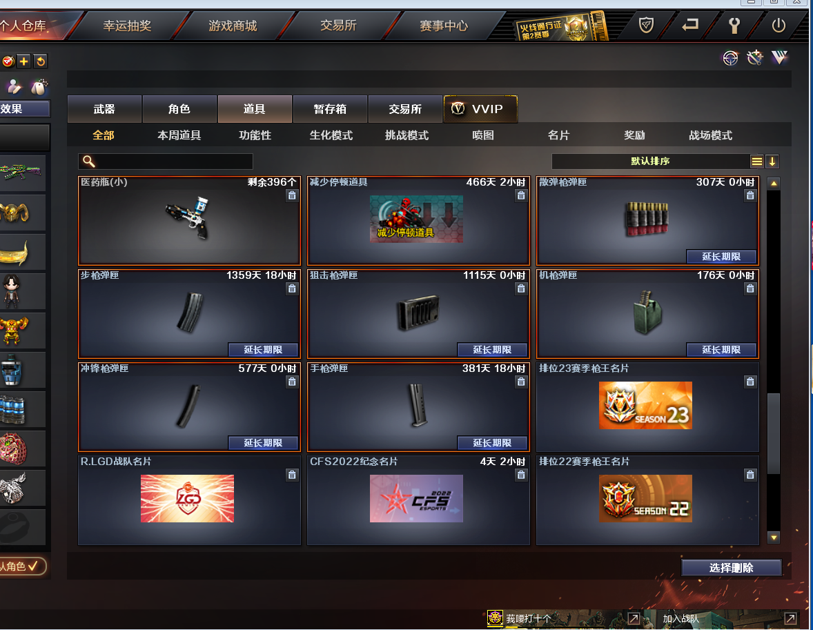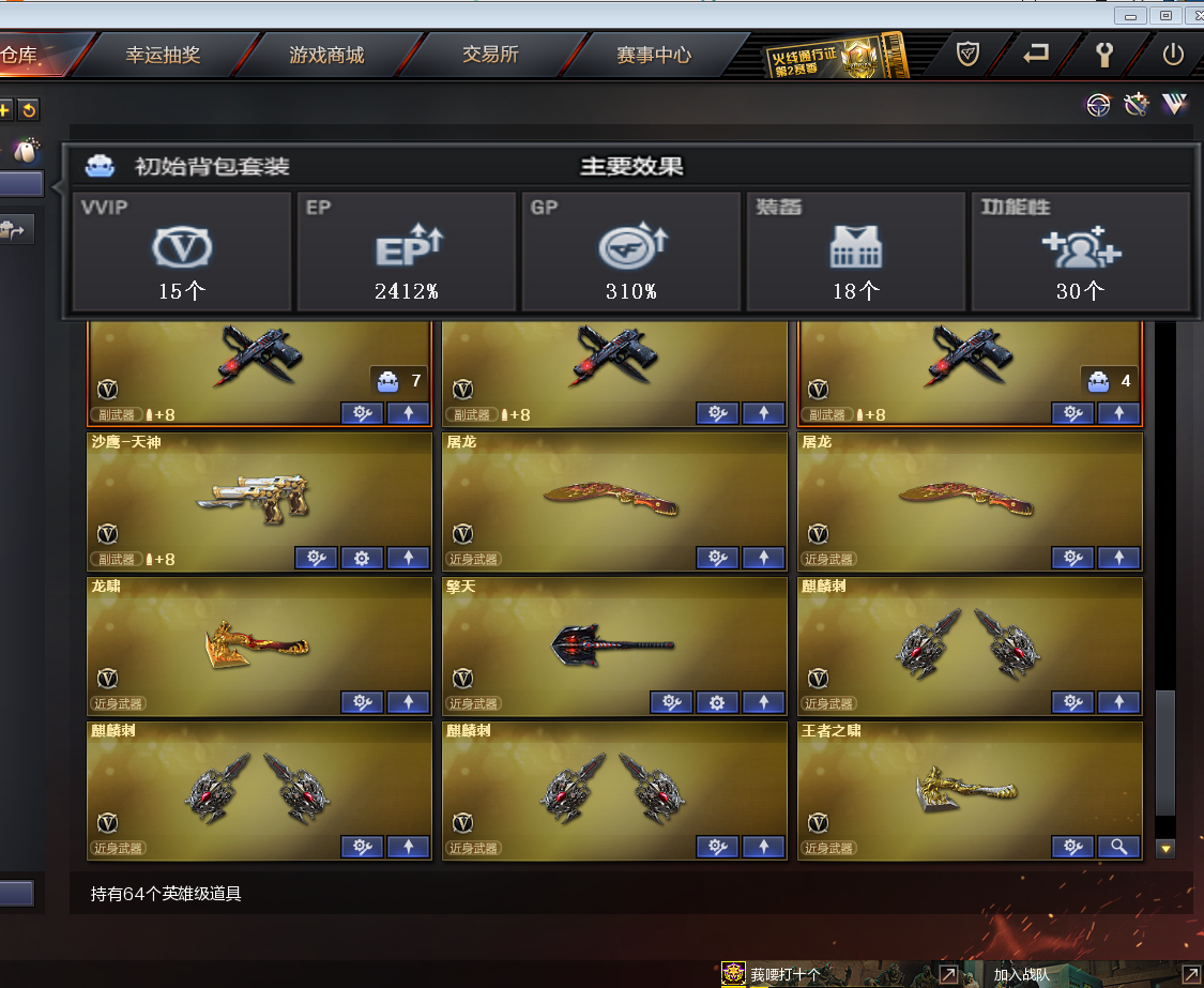 8.15日新增:封神放逐者,甄选金狐套装,挑战九阶段 九阶段+六黑骑士+168套装 【段位】:VIP5 2.4日 荣耀之巅 【区服】:四川一区 【昵称】:莪喓打十个 【编号】:CF02 【套装】:无 喓 【王者】:王者之魄,王者炎心,炫金骑士,王者蔷薇,炫金毁灭,王者之啸*2, 【主武器】:①步枪:AK47火麒麟(染色包1.2),M4A1黑骑士*5(暗月),M4A1死神,M4A1死神,9A91烈火*2,AK47猩红传说*3,AK47-B战神,白虎电玩蓝兔,王者之魄,王者炎心,炫金骑士,各种魂、御、源。 ②狙击枪:M200幻神,Barrett毁灭*7(染色包1.2-战神张飞),AWM裁决, Barrett暗月传说*2,王者蔷薇,炫金毁灭, ③机枪:RPK盘龙*3,加特林炼狱*4, ④冲锋枪:汤姆逊烈龙*7,死亡之眼, ⑤散弹枪:AA12雷霆*4, 【副武器】:沙鹰修罗*6,沙鹰天神,Colt1911大黄蜂, 【近身武器】:屠龙*2,龙啸,擎天,麒麟刺*3,王者之啸*2 【投掷武器】:迷你生化手雷*2,双生雷恶棍,各种投掷武器。 【挑战武器】:腐蚀激光超越MAX,腐蚀激光超越2,机甲撕裂者III*2,冰龙粉碎者白马银枪,白虎电玩蓝兔,激光毁灭者III,深渊巨龙咆哮III,巨龙咆哮III,M240B苍雷,乱世超越3,VEPR-12-金魔,试炼破坏者III,神圣爆裂者III,征服者*3,VEPR-12-紫魔,神圣爆裂者末日III,阐释者III*3。 【角色】:葵,审判者,瞳,樱,王哲奎惊若翩鸿,堕天使、复仇者等各种强化功能型角色。 【皮肤】:黑骑士暗月,毁灭战神张飞,战神粉色甜心 【光效】:沙鹰修罗蓝色光效,M4A1死神蓝色光效, 【音效】:无 【击杀图标】:23赛季击杀图标1,电玩兔兔,CFS 【玩偶】:赵云,兔子泰迪娃娃,红色艾比,悦动,王胖子。 【道具】:A背包套装扩展券,7背包,烟雾头26天,闪光护目镜315天,炫彩背包,Q9战队炫彩背包,SV战队炫彩背包,特殊水壶,圣龙戒,魔龙戒。夺命之镰,妖姬,疯狂宝贝,灵魂忍者,变异宝贝,生化弹匣,防化服,减少停顿道具(不退包),散弹枪弹夹,步枪弹夹,狙击枪弹夹,机枪弹夹,冲锋枪弹夹,手枪弹夹,防弹头,防弹衣,C4工具钳,手雷包。 挑战全装,6烈6盘,7烈7盘,六烈六盘,七烈七盘。;RPK-盘龙,M200-幻神,