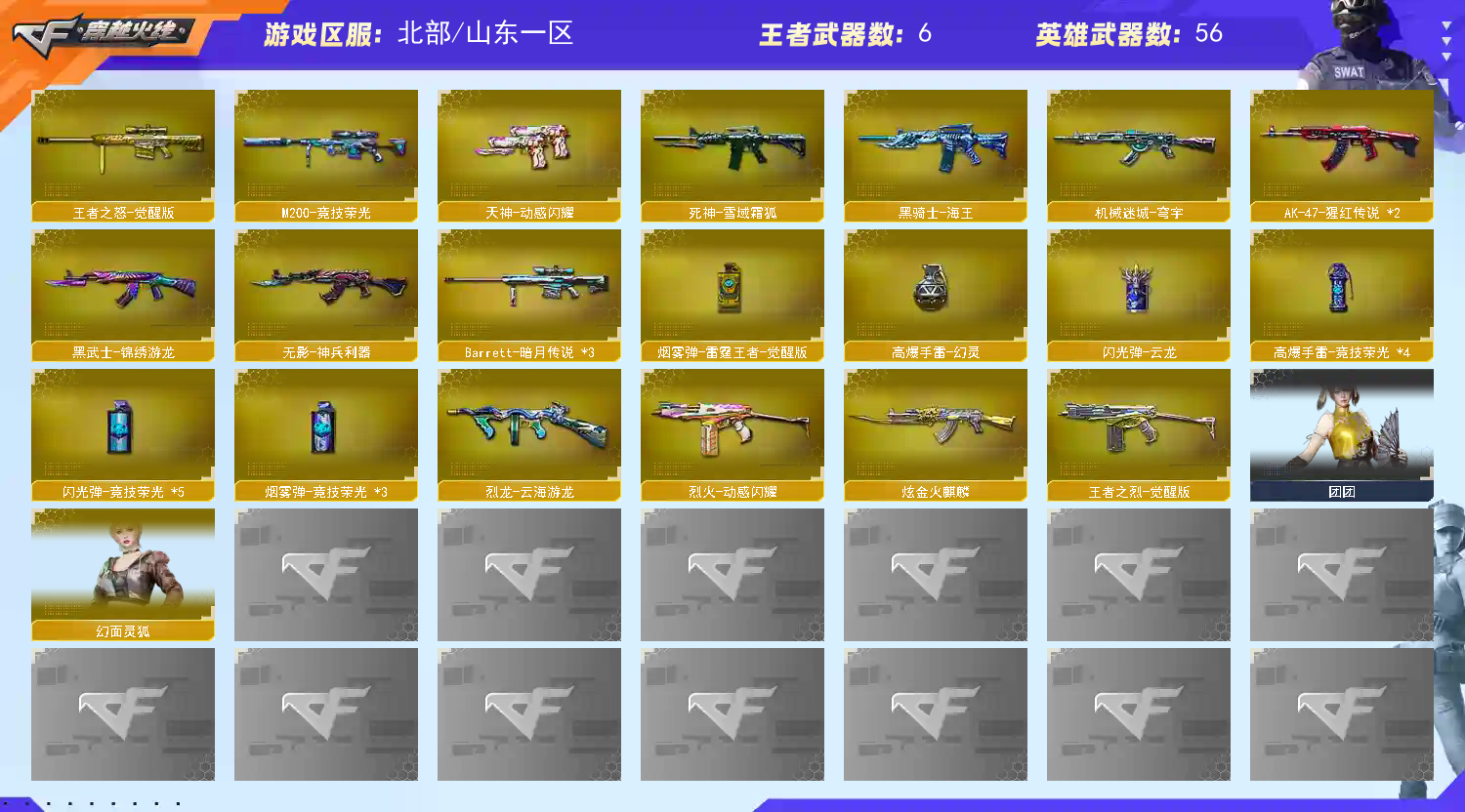 Lv.100 大元帅,0传说/4王者/1炫金/52英雄/CF点33506/【重要角色10】王者葵惊若翩鸿/电竞教官云悠悠/角色-炽天使/职业选手/角色-零/青霞仙子/角色-魅影/灵动武士/灵狐者黄金海岸/甜心偶像【套装1】竞技荣光套/【王者武器3】王者之烈-觉醒版/王者之怒-觉醒版/烟雾弹-雷霆王者-觉醒版【炫金武器1】炫金火麒麟【热门武器10】M200-幻神/炼狱-迷你小钢/M200-竞技荣光/白虎/USP-雷暴/金刚伞-电玩红兔/金色蔷薇-空/擎天-竞技荣光*2/AA12-擎天柱III【英雄武器49】烈火-动感闪耀/M4A1-雷神*2/AK-47-猩红传说*2/超新星-热带奇洋/白虎-电玩蓝兔/黑骑士-海王/AK47-火麒麟/Scar Light-白虎/无影-神兵利器/黑武士-锦绣游龙/QBZ03-金色蔷薇/M4A1-黑骑士/M200-幻神/M200-竞技荣光/Barrett-暗月传说*3/Barrett-极光/烈龙-云海游龙/擎天-竞技荣光*2/屠龙-动感闪耀/屠龙/麒麟刺/擎天-云海游龙/龙啸-烈火龙威/AA-12-雷霆/高爆手雷-幻灵/手雷-动感闪耀/烟雾弹-竞技荣光*3/高爆手雷-竞技荣光*4/闪光弹-竞技荣光*5/手雷-热带奇洋/闪光弹-云龙/手雷-云海游龙/天神-动感闪耀/USP-雷暴/柯尔特-竞技荣光【热门皮肤12】幻神-冠军之幻/雷神-冠军之魄/白虎-AG-CFPLS20冠军/QBZ03-荣耀世冠白鲨/火麒麟-CFSTAR/修罗-CFSTAR*2/雷神-宇航兔/雷神耀金/火麒麟-心动糖果/毁灭-黑大圣/麒麟刺-荣耀世冠白鲨【人偶武器26】炼狱-迷你小钢/迷你深渊冰龙/金色蔷薇-空/迷你裂空之翼/迷你波特博士*3/夺魂*5/迷你牛牛/迷你火种*5/灵狐娃娃手雷/生化手雷-机甲核心*2/深渊终结者手雷*3/AWM-灵狐-15周年嘉年华/COP-白鲨【暴走生化武器1】炼狱-迷你小钢【挑战武器12】Scar Light-白虎/M4A1-黑骑士/神圣爆裂者-末日III/KAC-圣炎切割者III/激光毁灭者-超越3/激光毁灭者III-白马银枪/激光毁灭者III/试炼破坏者III/征服者-超越觉醒 [Lv 1]/征服者-超越觉醒 [Lv 2]/冰龙粉碎者-白马银枪/巨龙咆哮-深渊金【音效卡武器1】M4A1-黑骑士音效卡【普通皮肤8】麒麟刺-萌杀/雷神-暗月/黑骑士-摸金校尉/AK-47-雷神/M4A1-千变-孔明/AK47-B-常胜将军-孙权/AK47-B-常胜将军-刘备/雷神-机甲刑天【光效14】屠龙-流星光效/M200-幻神蓝粉色光效/M4A1-黑骑士绿色光效/M4A1-雷神绿色光效/M4A1-雷神绿色光效/Kar98K-星神紫橙光效/AK47-黑武士蓝色光效/王者之怒金色光效/M4A1-雷神紫色光效/M4A1-雷神绿色光效/M4A1-雷神紫色光效/M4A1-雷神紫色光效/M4A1-玫瑰精灵红绿光效/M200-幻神紫橙光效【玩偶19】15周年玩偶/红色曼提柯尔玩偶/葵玩偶/牛魔王玩偶-无情烈焰/裂空之翼红色玩偶/波特博士玩偶饰品_红色/黄忠玩偶/马超玩偶/浣熊玩偶/胡司令玩偶/CFS纪念版人偶/超能特工玩偶/零-水下丽影玩偶/阿瑞斯保卫者-玩偶/王者刀锋玩偶/悦动玩偶/夏日水手玩偶/曼陀罗玩偶/次元之矛-黄金迷你玩偶【戒指武器14】24赛季纪念戒指-耀银(拇指)/24赛季纪念戒指-耀银(食指) /15周年限定戒指/25赛季纪念戒指-耀银(食指)/25赛季纪念戒指-耀银(拇指)/银蛇戒/金蛇戒/龙眼(死神)/23赛季纪念戒指-耀银(拇指)/23赛季纪念戒指-耀银(食指) /龙眼(鹰)/22赛季纪念戒指-耀银(食指) /22赛季纪念戒指-耀银(拇指)/8周年戒2;USP-雷暴,电竞教官-云悠悠,QBZ03-金色蔷薇,M200-幻神,Scar Light-白虎,