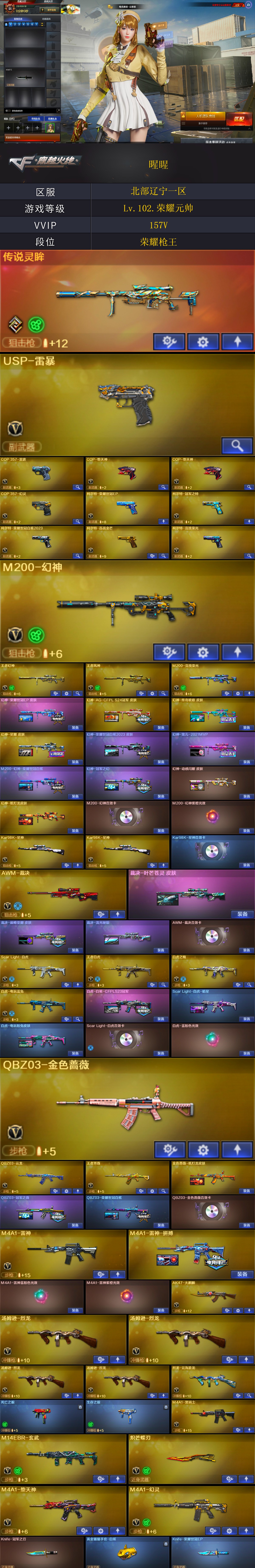 【商品标题】:北部辽宁一区-157V-可二次实名-【Lv.102.荣耀元帅】-【段位:荣耀枪王】 【稀有武器】:传说灵眸/M200-幻神/Kar98K-星神(2)/ScarLight-白虎/M14EBR-玄武/M4A1-幻灵/M4A1-堕天神/雷霆之契/USP-雷暴/COP-堕天神(2)/COP357-幻灵/柯尔特-竞技荣光/天神-动感闪耀/柯尔特-荣耀世冠白鲨2023/修罗-古蛇迷踪/柯尔特-冠军之特/金色蔷薇-古蛇迷踪/QBZ03-云龙/QBZ03-金色蔷薇/AK47-火麒麟(2)/M4A1-雷神/M4A1-黑骑士/白虎-电玩蓝兔/Barrett-毁灭/Barrett-极光/AWM-裁决/M200-竞技荣光/汤姆逊-烈龙(4)/AA-12-雷霆/炽芒蝶刃/麒麟刺-堕天神/龙啸-堕天神/幻灵之锋(4)/擎天-竞技荣光 【王者武器】:王者白虎-觉醒版/白虎之魄-觉醒版/王者芳薇-觉醒版/王者幻神-觉醒版/王者风神-觉醒版 【热门角色】:电竞教官-云悠悠/机械姬/迷迭香/司雨/影豹/隼/奇洋探员/乔伊教练/蛇隐宗/王者潘多拉/炽天使/潘多拉-X/兔囡囡/职业选手/潘多拉 【热门音效卡】:M200-幻神音效卡/Kar98K-星神音效卡/AWM-裁决音效卡/Scar Light-白虎音效卡/QBZ03-金色蔷薇音效卡/M4A1-黑骑士音效卡/Barrett-极光音效卡 【热门皮肤】:幻神-AG-CFPLS24冠军皮肤/幻神-传奇欧欧皮肤/幻神-星耀皮肤/幻神-荣耀世冠白鲨2023皮肤/幻神-宠儿-2021MVP/M200-幻神-荣耀世冠白鲨/幻神-冠军之幻/幻神-动感闪耀皮肤/幻神-纸灯龙皮肤/白虎-白鲨-CFPLS23冠军/裁决-巅峰荣耀皮肤/金色蔷薇-纸灯龙皮肤/QBZ03-冠军之薇/裁决-流光秘银/屠龙-巅峰荣耀皮肤/白虎-电玩粉兔皮肤/QBZ03-荣耀世冠白鲨/ScarLight-白虎-暗星/毁灭-冠军之怒/屠龙-春桃皮肤 【其他亮点】:Knife-冠军之刃/金色蔷薇-空/黄金猫猫手套-白鲨/金刚伞-电玩红兔/烟雾弹-荣耀世冠白鲨2023(2) (截图展示段位不代表实际段位,如赛季更新等不可抗拒因素发生变化,其余道具看截图或咨询客服);USP-雷暴,柯尔特-荣耀世冠白鲨2023,柯尔特-冠军之特,炽芒蝶刃,Knife-冠军之刃,隼,电竞教官-云悠悠,