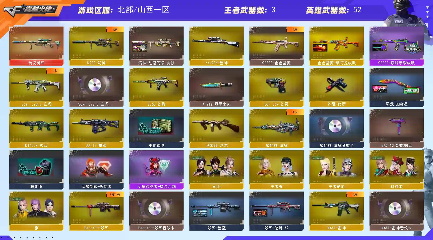 【科技大佬,请你高抬贵手,家里就靠这个号吃饭了,本人上有老,下有小,请你用一丝丝善意想想,给我留一条生路吧,感谢您到来过,谢谢!】 出租不易~~且玩且珍惜~~感谢!!!!!;Knife-冠军之刃,QBZ03-金色蔷薇,G36C-幻影,M200-幻神,Scar Light-白虎,传说灵眸,Kar98K-星神,