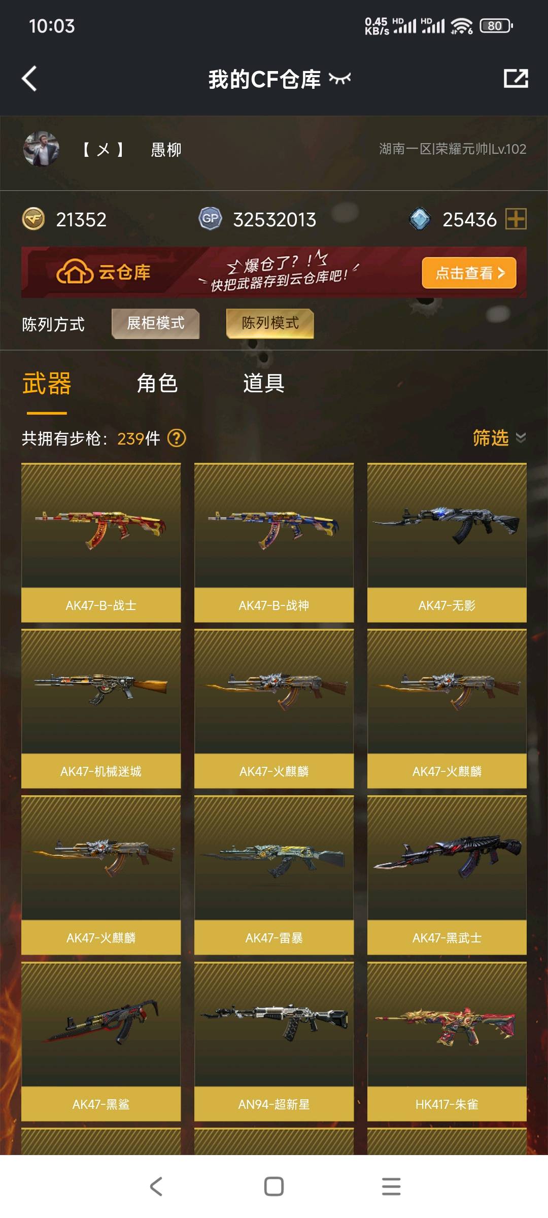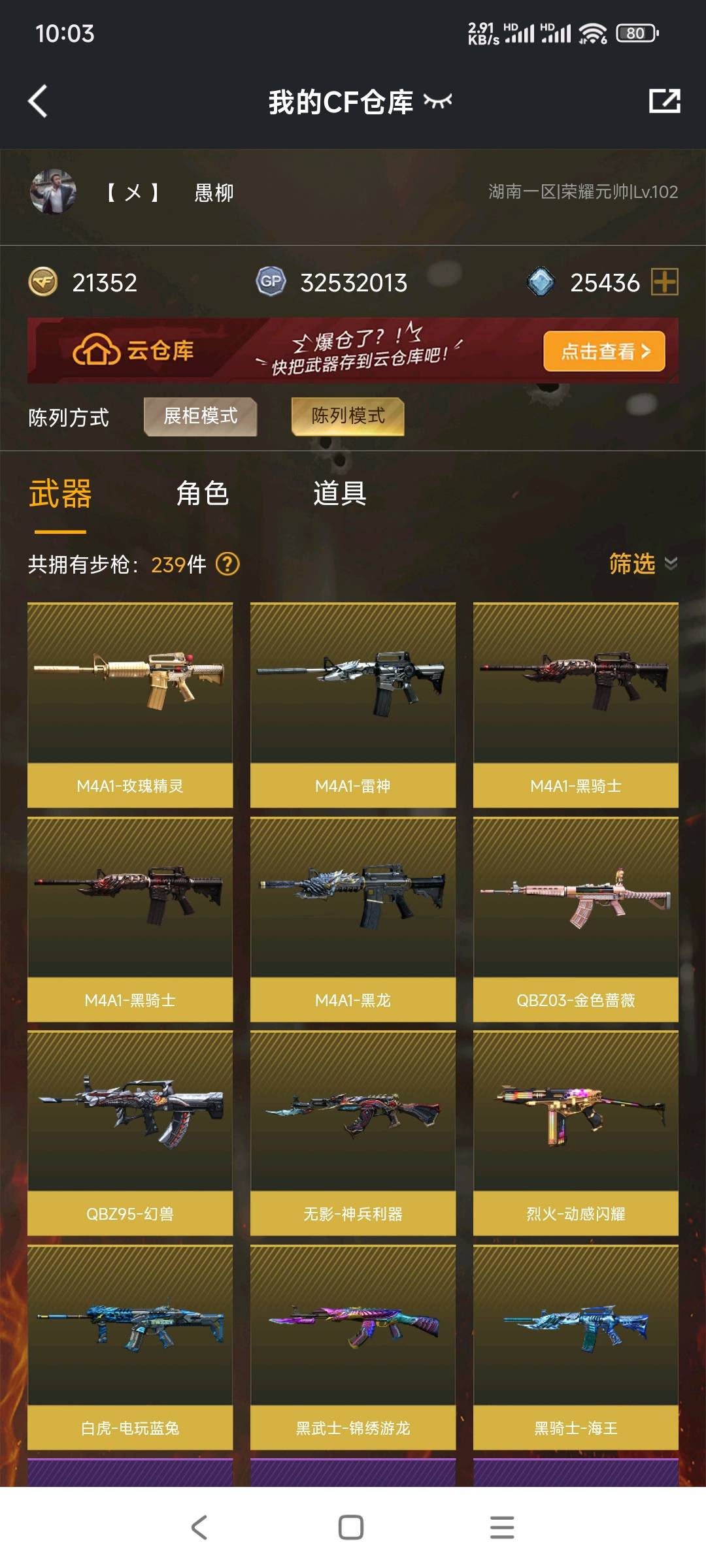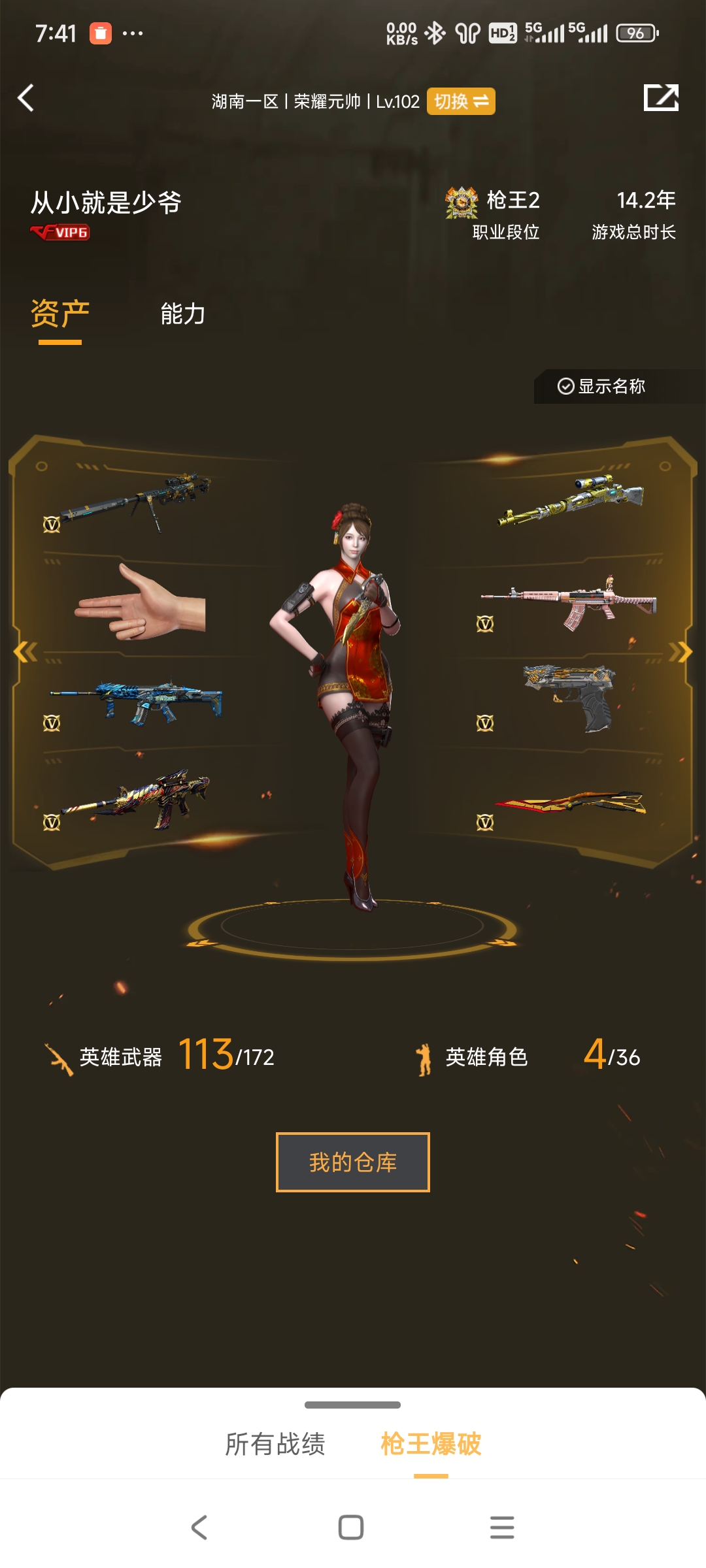 本游戏账号:英雄武器111个; 王者武器7个。 装备:♥雷霆套♥幻兽套♥蝴蝶、晴雅、王者潘多拉♥破空枪刃♥雷神+4皮+音效♥毁灭+7皮+音效♥火麒麟+3皮+音效♥QBZ03-金色蔷薇+1皮♥六盘七烈♥裁决 加特林-炼狱、HK417-朱雀、传说暗裔、USP-雷暴、黑骑士-海王、火麒麟-AG、火麒麟-绝迹、炫金武士、炫金火麒麟、炫金毁灭、王者之心、王者之影、炫金骑士、王者之光-觉醒版、王者之幻-觉醒版、王者冰魄-觉醒版、蝴蝶、生化弹匣、M4A1-雷神音效卡、M4A1-黑骑士音效卡、王者之心。;USP-雷暴,炽芒蝶刃,晴雅,RPK-盘龙,QBZ03-金色蔷薇,M200-幻神,传说暗裔,
