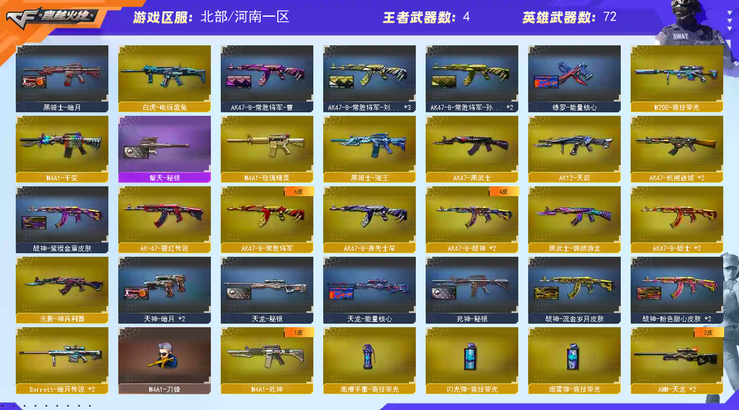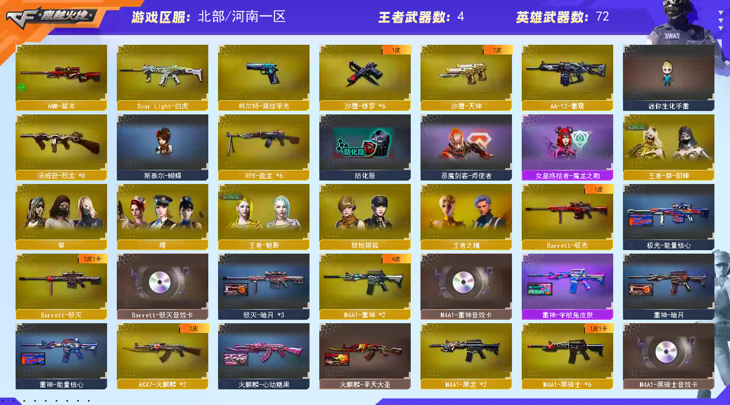 【主武】:雷蛇AWM、雷蛇冲锋枪、斯太尔蝴蝶、C.A.T、金色小号、M4A1刀锋、火麒麟、天龙、盘龙、2黑龙、2雷神、6烈龙、6黑骑士、玫瑰精灵、王者之幻、暗月传说、毁灭、无影、贝雷塔、金牛座、极光、6盘龙、死神、天蝎座、黑武士、毁灭征服者、白羊座、千变、火狱乱世、射手座、天启、凤凰之力、武圣、3死亡之眼、2斯泰尔巧克力、火麒麟暗月、火麒麟能量核心、黑武士暗月、黑武士能量核心、2机械迷城、源-雷神、M200赤血龙魂、猎神、圣炎切割者III、白虎、炫金雷神、炫金武士、HK417-赤血龙魂、AWM裁决、激光毁灭者3级、雷神-暗月、AA12-雷霆、M200竞技荣光、神圣爆裂者III、火麒麟STAR(皮肤)、天龙STAR(皮肤)、无影暗月(皮肤)、雷神-宇航兔(皮肤)、雷神-暗月(皮肤)、千变孔明(皮肤)、3毁灭暗月(皮肤)、火麒麟雷神(皮肤)、死神秘银(皮肤)、极光能量核心(皮肤)、雷神能量核心(皮肤)、天龙能量核心(皮肤)、火麒麟平天大圣(皮肤) 【副武】:6沙鹰修罗、COP、天秤座、沙鹰天神、胜利之火、凤凰之火、修罗STAR(皮肤)、天神暗月(皮肤)、柯尔特竞技荣光、阐释者III、皇家守卫、沙鹰青龙、沙鹰70kg 【近身】:3屠龙、龙鳞、干将莫邪、龙啸、金砖、擎天、麒麟刺、双子座、黄金警棍、擎天-秘银、啸天(拳套)、幻刺光剑、匕首卧龙、黄金充气大锤、王者之击、擎天竞技荣光 【投掷】:生化手雷、胜利之光、银烟、凤舞云烟、凤凰之息、高爆竞技荣光、闪光幻兽、烟雾竞技荣光、闪光竞技荣光 【道具】:防弹头、防弹衣、手雷包、C4工具钳、手枪弹匣、散弹弹匣、冲锋弹匣、步枪弹匣、机枪弹匣、狙击弹匣、防化服、生化弹匣、不退包、变异宝贝彩字、彩昵、夺命之镰、幽灵之刃、毁灭音效卡、雷神音效卡、天龙白鲨(皮肤)、护目镜、烟雾头、炫彩背包、超级背包、超级护目镜、特殊水壶、透明头盔、透明护目镜、闪光护目镜、14个背包;RPK-盘龙,Scar Light-白虎,