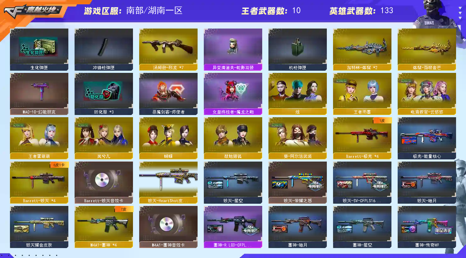 【新增】usp雷暴,cop堕天神,裁决+裁决音效卡,传说星骇,USP-冥王。修罗-古蛇迷踪,Scar Linght-玄豹。丛林匕首-玄豹,角色荆棘。加特林-炼狱*2/ 【角色】电竞教官-云悠悠,蝴蝶,蛇隐宗,王者雲萌萌。王者雨墨,岚兮儿,炫, 【主武器】传说幽瞳。m200-幻神,AK47-火麒麟,M4A1-黑龙,M4A1-雷神,M4A1-黑骑士,AK47-无影,M4A1-死神,AK12-天启,AN94-超新星。M4A1-武圣,M4A1-雷霆,Scar Linght-白虎,g36c-幻影,金色蔷薇-古蛇迷踪,QBZ191-银翼,QBZ95-幻兽,QBZ03-金色蔷薇,AWM-天龙,Barrett-毁灭。Barrett-极光,Barrett-雷霆,Kar98K-星神,Barrett-暗月传说,汤姆逊-烈龙*7.炫金黑龙。炫金雷神,炫金天龙。王者雷霆,王者之心,QBZ03-王者蔷薇,王者风势,王者之魄,王者之势,王者幻神,王者之怒, 【副武器】沙鹰-修罗,沙鹰-天神,COP 357-幻灵,USP-雷暴,修罗-古蛇迷踪。沙鹰-幻兽, 【近身武器】屠龙,擎天,麒麟刺,尼泊尔-雷霆,擎天-竞技荣光,女皇利刃-幻兽, 【投掷武器】雷霆套,竞技荣光套,幻兽套, 【音效卡】m200-幻神音效卡,AK47-火麒麟,M4A1-雷神音效卡,Barrett-毁灭音效卡, 【皮肤】幻神-星耀皮肤,幻神-传奇欧欧皮肤。幻神-星火小队签名珍藏版,屠龙-星耀皮肤,毁灭-Heartshot皮肤,金色蔷薇-Heartshot皮肤。火麒麟-Heartshot皮肤。屠龙-星耀皮肤,QBZ03+传奇宠儿,黑龙-冠军之武,擎天-冠军之击,雷神-R.LGD-CFPLS18冠军,擎天-冠军之击,星神-巅峰荣耀皮肤,修罗-能量核心,死神-秘银。天龙-秘银。天神-暗月,雷神-能量核心,无影-暗月,毁灭-暗月,AK47-火麒麟-传奇EVEN。无影-暗月,传奇石头-横妙之巅。雷神-传奇N9,天龙-秘银。修罗-能量核心,无影-能量核心,极光-能量核心。天启-暗月,雷神-暗月。火麒麟-CFSTAR,;USP-雷暴,Knife-冠军之刃,传说星骇,电竞教官-云悠悠,QBZ03-金色蔷薇,传说幽瞳,G36C-幻影,