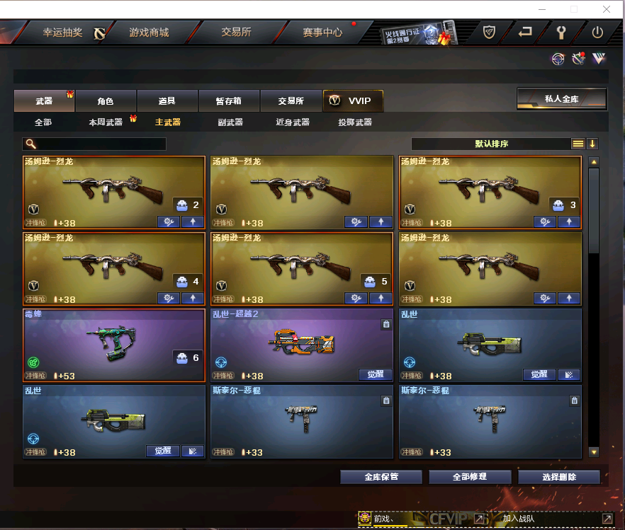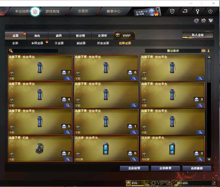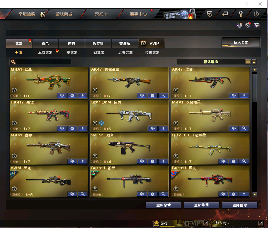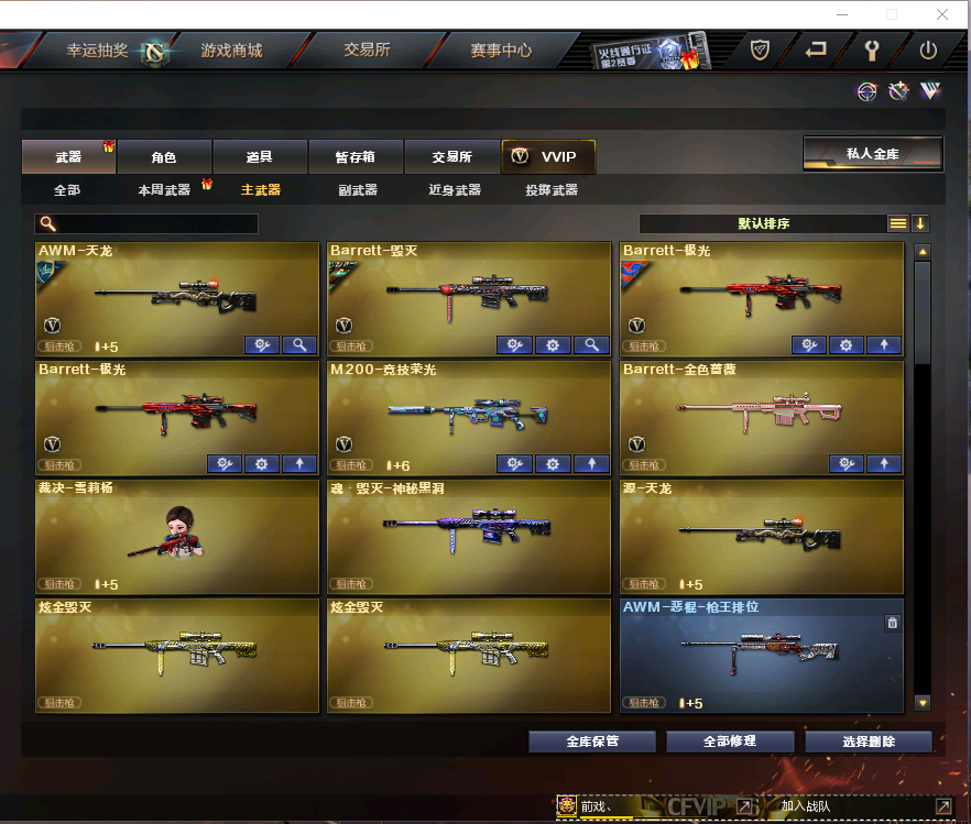 信誉分不足时请在新版大厅匹配游戏! 【步枪系列】M4A1-雷神**3-黑骑士/武圣/青龙魂/摸金校尉/大圣雷神/能量核心/炫金骑士 AK系列-Ak47-火麒麟*2-AK12-天启*3-AN94-超新星/机械迷城/黑鲨/烈火/猩红传说/桃园结义/王者之翼 【狙击枪】竞技荣光/98k星神/AWM-天龙*2/裁决Barrett--毁灭*3/王者之怒 【辅助枪】 RPK-盘龙 *6/ 加特林炼狱/汤姆逊-烈龙-*6斯太尔-恶棍死亡之眼/迷你生化手雷/死亡之眼/ 斯太尔蝴蝶 / 六烈六盘 / 六盘六烈 / 6烈6盘 / 6盘6烈 /生化号 / 爆破号 /御-炼狱-女娲/毒蜂/异变清道夫 【角色】/电竞教官云悠悠/王者灵传说之路葵/樱/王者救世主/北极狐X/救世主/空/娟娟【佣兵觉醒 无需换弹7秒/生化觉醒 】捕食者之眼/生存本能 【副武器】竞技荣光/雷霆王者闸释者III-修罗*7-摸金校尉-COP-旗袍沙鹰-天神*2武圣/MAC-涂鸦 【近身武器】竞技荣光沙鹰修罗*4/天神*3/王者之魂/摸金校尉/轻型军用手斧/镜 【投掷武器】竞技荣光高爆手雷雷霆*1迷你生化手雷 【通用道具】双1-7背包 / 手枪弹匣 / 金蛇戒 / 狙击枪弹夹 / 魔龙戒 / 散弹枪弹夹 / 圣龙戒 / 挑战弹夹 / 银蛇戒 / 防弹头盔 / 烟雾保护头盔 / 防弹衣 / C4工具钳 / 手雷包 / 步枪弹匣 / 冲锋枪弹匣 / 机枪弹匣 / 闪光护目镜/超级护目镜/超级背包/透明头盔/透明护目镜/ 超级对讲机 /新彩色昵称/C4.红龙/击杀图标万圣/CFS/恶灵/金色击杀 【生化专用道具】永久生化弹夹/服/幽灵之刃)/灵魂忍者/绿巨人/变异宝贝/伪装者/ 迷你生化手雷 /不退包 肩膀佩戴超级对讲机(榴弹3/22) 【皮肤系列】火麒麟CFSTAR/黑骑士耀金皮肤/极光能量核心/火麒麟雷神/修罗耀金皮肤/Ak47老兵传说皮肤;USP-雷暴,电竞教官-云悠悠,RPK-盘龙,Scar Light-白虎,