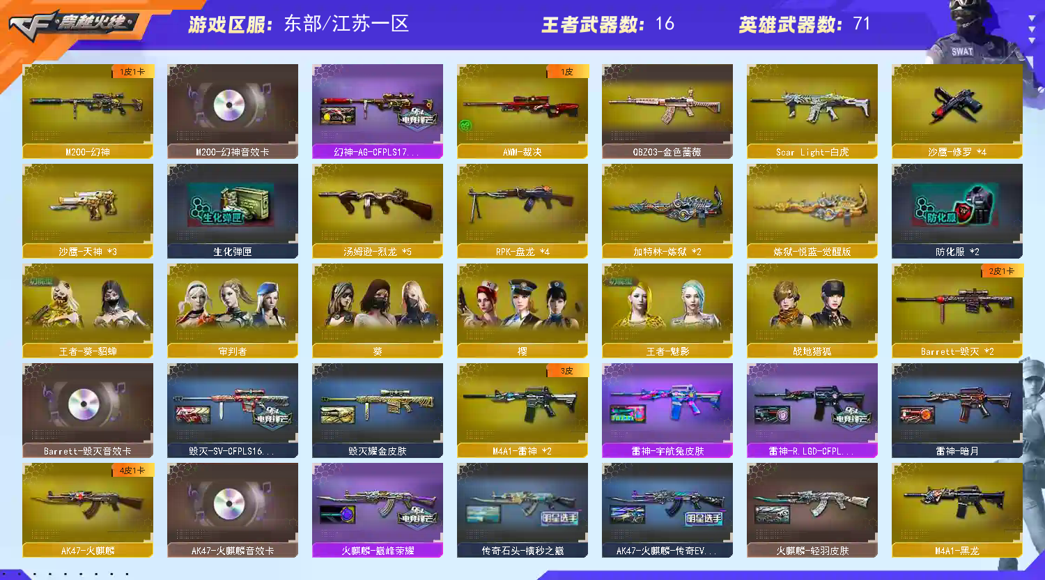 85V 9王者 1炫金 M200幻神+AGCFPLS17冠军皮肤+音效卡 QBZ03王者蔷薇 SCARL白虎 QBZ03金色蔷薇 【英雄武器】_M200-幻神/Barrett-毁灭(2)/Barrett-朱雀/Barrett-暗月传说/AWM-裁决/王者之决-觉醒版/M4A1-雷神(2)/M4A1-死神/M4A1-黑龙/M4A1-千变/M4A1-黑骑士(3)/黑骑士-海王/M4A1-玫瑰精灵/HK417-朱雀/Scar Light-白虎/AK12-天启(2)/AK47-火麒麟/无影-神兵利器/AK47-B-身先士卒/AK47-B-常胜将军/AK47-B-战士(2)/AK47-B-战神/QBZ03-金色蔷薇/QBZ-03-王者蔷薇-觉醒版/RPK-盘龙(4)/汤姆逊-烈龙(5)/烈龙-悦心-觉醒版/加特林-炼狱(2)/炼狱-悦蓝-觉醒版/沙鹰-天神(3)/沙鹰-修罗(4)/麒麟刺-堕天神(2)/王者之啸-觉醒版(2)/擎天/王者之击-觉醒版(3)/屠龙(2)/雷霆之锋/马来剑-夜魔/高爆手雷-幻灵/高爆手雷-雷霆/高爆手雷-夜魔/高爆手雷-堕天神(2)/高爆手雷-竞技荣光(3)/烟雾弹-雷霆/烟雾弹-夜魔/烟雾弹-堕天神(2)/烟雾弹-竞技荣光(2)/烟雾弹-雷霆王者-觉醒版/闪光弹-雷霆/闪光弹-夜魔/闪光弹-堕天神(2)/闪光弹-竞技荣光【重要武器皮肤】幻神-AG-CFPLS17冠军/毁灭-SV-CFPLS16冠军/巴雷特-毁灭-CFPL冠军/雷神-R.LGD-CFPLS18冠军/毁灭耀金皮肤/AWM-天龙-传奇70KG/天龙-CFSTAR/M4A1-雷神-白鲨皮肤/雷神-宇航兔皮肤/雷神-暗月/黑骑士耀金皮肤/AK47-火麒麟-传奇EVEN/火麒麟-CFSTAR/火麒麟-AG/火麒麟-巅峰荣耀/火麒麟-轻羽皮肤/传奇石头-横秒之巅/AK47-B-常胜将军-刘备/AK47-B-常胜将军-孙权/AK47-B-常胜将军-曹操/AK-47-雷神/战神-粉色甜心皮肤/修罗-CFSTAR【重要音效卡】M200-幻神音效卡;RPK-盘龙,QBZ03-金色蔷薇,M200-幻神,Scar Light-白虎,
