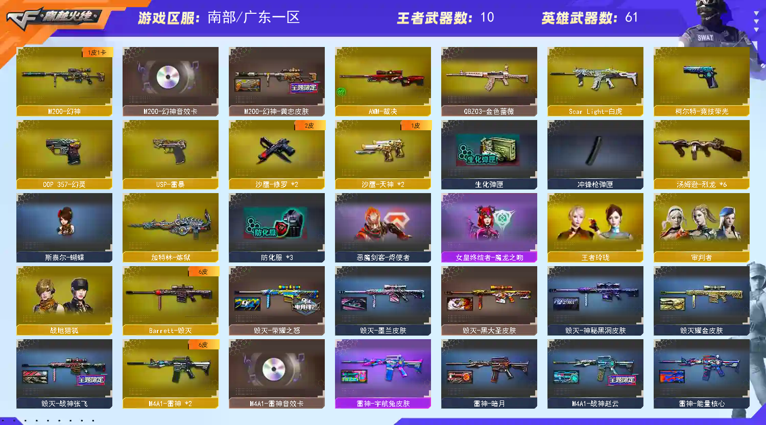 【 幻神音效卡+幻神黄忠+usp雷暴❤白虎金色蔷薇cop幻灵竞技荣光柯尔特❤蝴蝶+6烈生化不换弹❤】【Lv.102 荣耀元帅】VIP6 67V 8王者 2炫金 幻神黄忠/毁灭战神张飞/毁灭荣耀之怒/毁灭耀金/毁灭墨兰/毁灭神秘黑洞/毁灭黑大圣/天龙CFSTAR/火麒麟CFSTAR/火麒麟平天大圣/审判者/M200-幻神/王者幻神-觉醒版/Barrett-毁灭/Barrett-暗月传说(2)/AWM-天龙/网剧冠军套装/M200-幻神音效卡/M4A1-黑骑士音效卡/M4A1-黑龙音效卡/M4A1-雷神音效卡/AK47-火麒麟音效卡;USP-雷暴,QBZ03-金色蔷薇,M200-幻神,Scar Light-白虎,