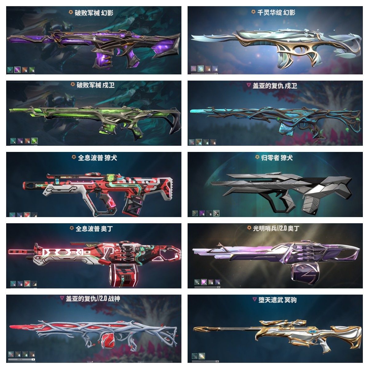 【拥有步枪】混沌序曲-狂徒,洪荒怒焰-幻影,洪荒怒焰-狂徒,机动狂飙-狂徒,归零者-狂徒,归零者-獠犬,781-A协议-幻影,堕天遗武-狂徒,盖世英雄-狂徒,紫阙金琅-狂徒,盖亚的复仇//2.0-幻影,盖亚的复仇-戍卫,盖亚的复仇-狂徒,侦察力量-幻影,冰点凝冻-狂徒,般若假面-幻影,海洋之星-狂徒,日冕雄师-狂徒,超能偶像-戍卫,超能偶像-狂徒,流星兵团-狂徒,珍珠棘贝-幻影,珍珠棘贝-戍卫,钢轨卫士-狂徒,钢轨卫士-戍卫,沙尘幻旅-狂徒,废土-狂徒,聚合之力-幻影,采蜜小蜂队-獠犬,战术熊与伙伴们-戍卫,复古浪潮-獠犬,战术小伙伴-獠犬,战术小伙伴-幻影,萌彩剪影-戍卫,胡桃狂想-獠犬,沙场老兵-戍卫,