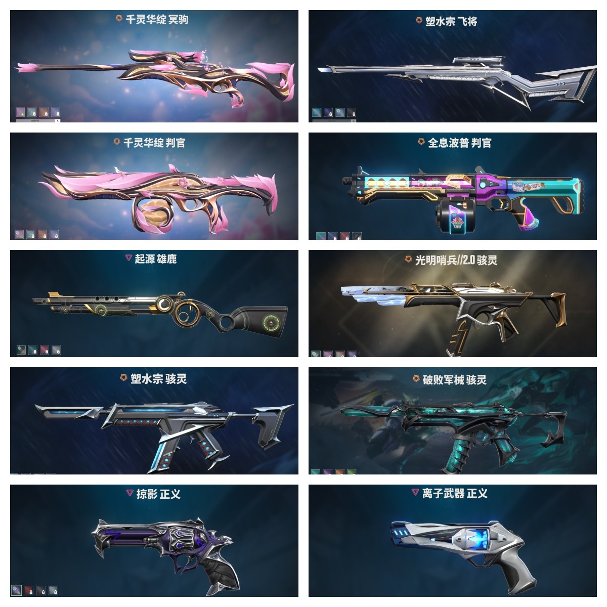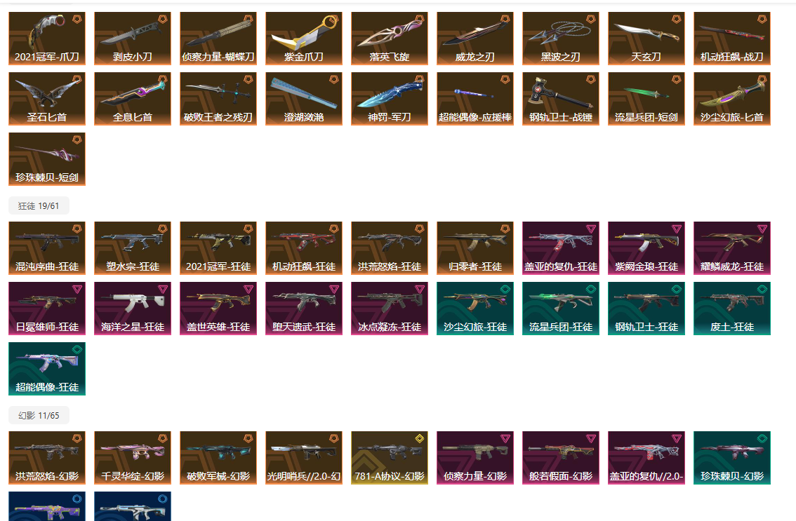 【拥有套装】千灵华绽套装(千灵华绽-幻影,千灵华绽-冥驹,千灵华绽-判官,千灵华绽--正义,落英飞旋)破败军械套装(破败军械-幻影,破败军械-戍卫,破败军械-骇灵,破败军械-鬼魅,破败王者之残刃)塑水宗套装(塑水宗-骇灵,塑水宗-狂徒,塑水宗-飞将,塑水宗-正义,黑波之刃)全息波普套装(全息波普-獠犬,全息波普-奥丁,全息波普-判官,全息波普-狂怒,全息匕首)光明哨兵2.0套装(光明哨兵//2.0-幻影,光明哨兵//2.0-奥丁,光明哨兵//2.0-骇灵,光明哨兵//2.0-短炮,圣石匕首)2021全球冠军赛套装(2021全球冠军赛-狂徒,2021全球冠军赛-爪刀)耀鳞威龙套装(耀鳞威龙-狂徒,耀鳞威龙-鬼魅,威龙之刃)