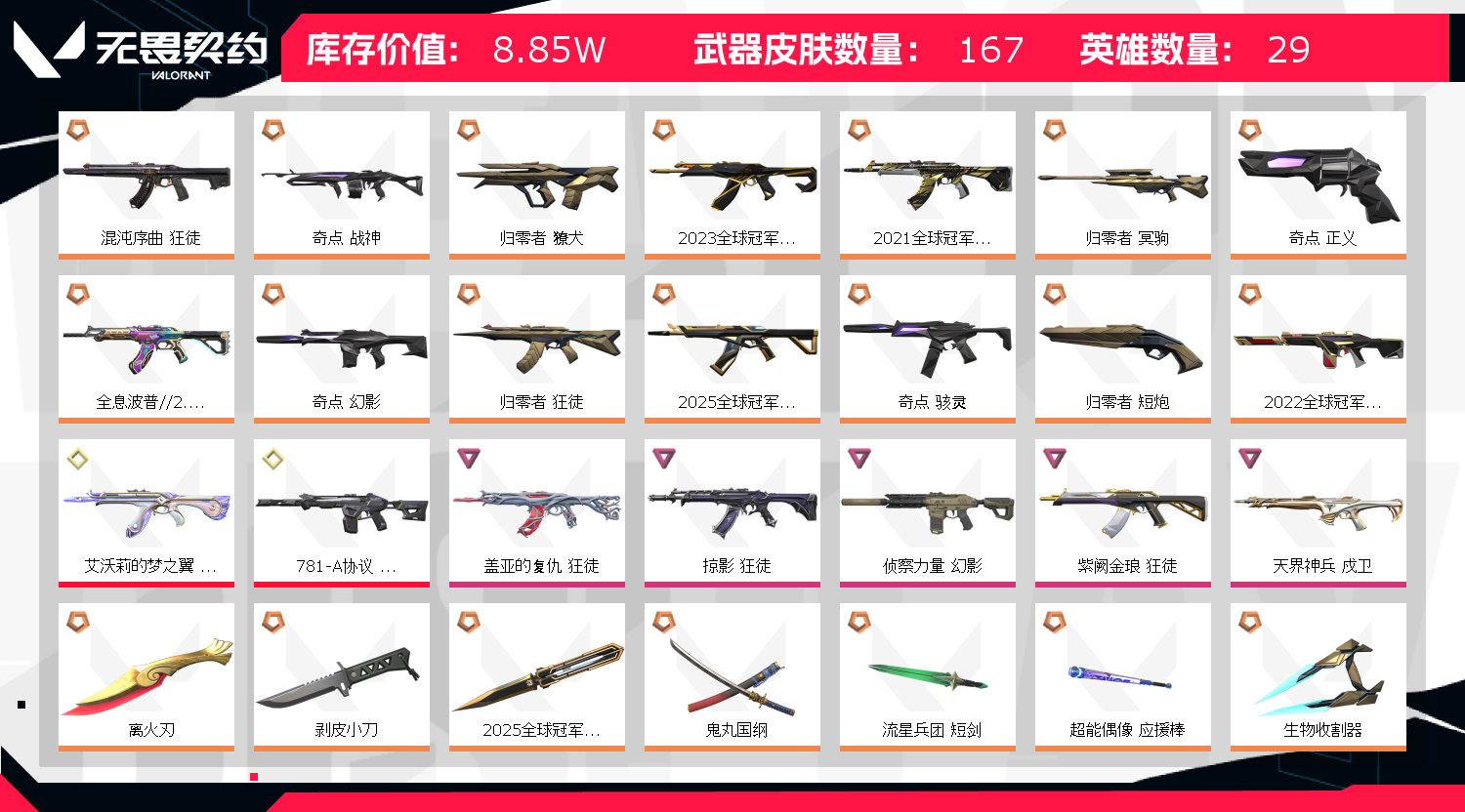 首页 > 租号大厅 > 无畏契约-wegame > wegame/wegame > 9万炸鱼顶号✨26VCT刀21冠军套+离火刃多|奇点|多冠军套✨⒘近战鬼丸蝴蝶✨波普|混沌|猫猫狂徒