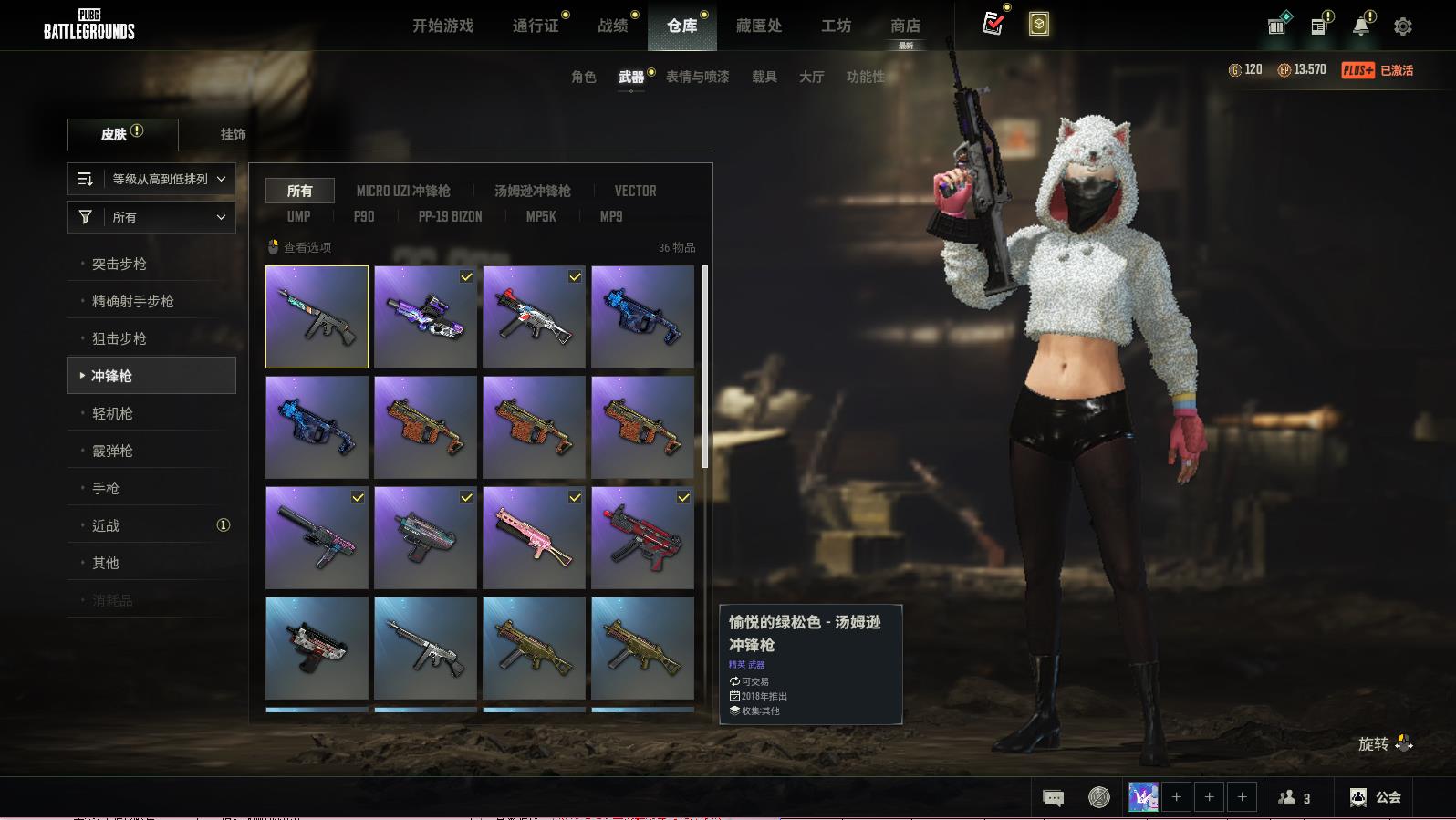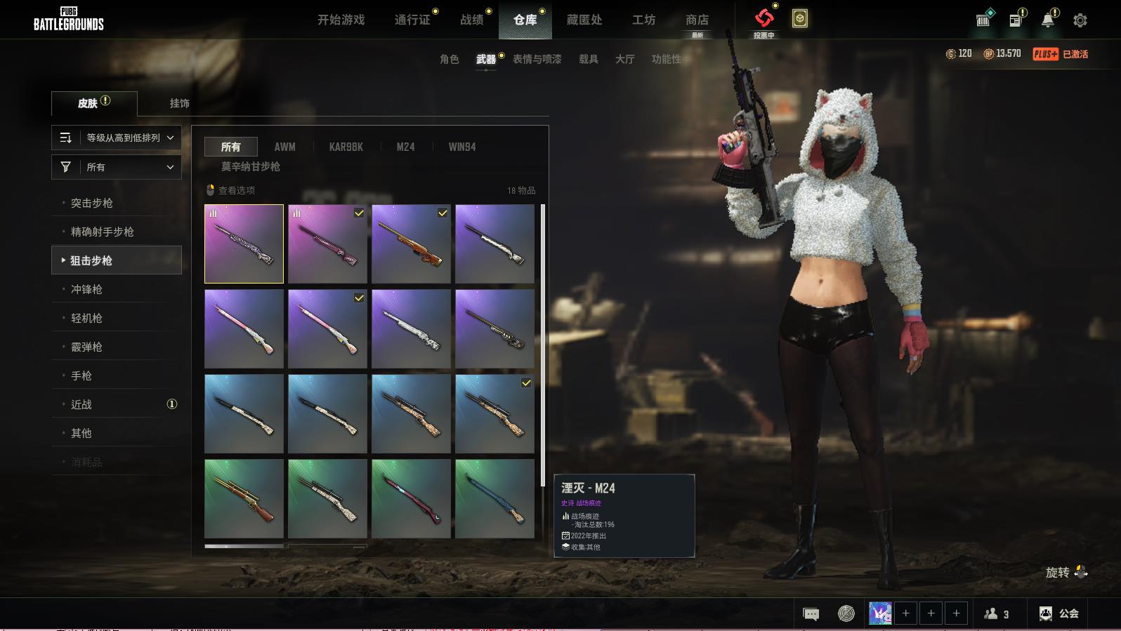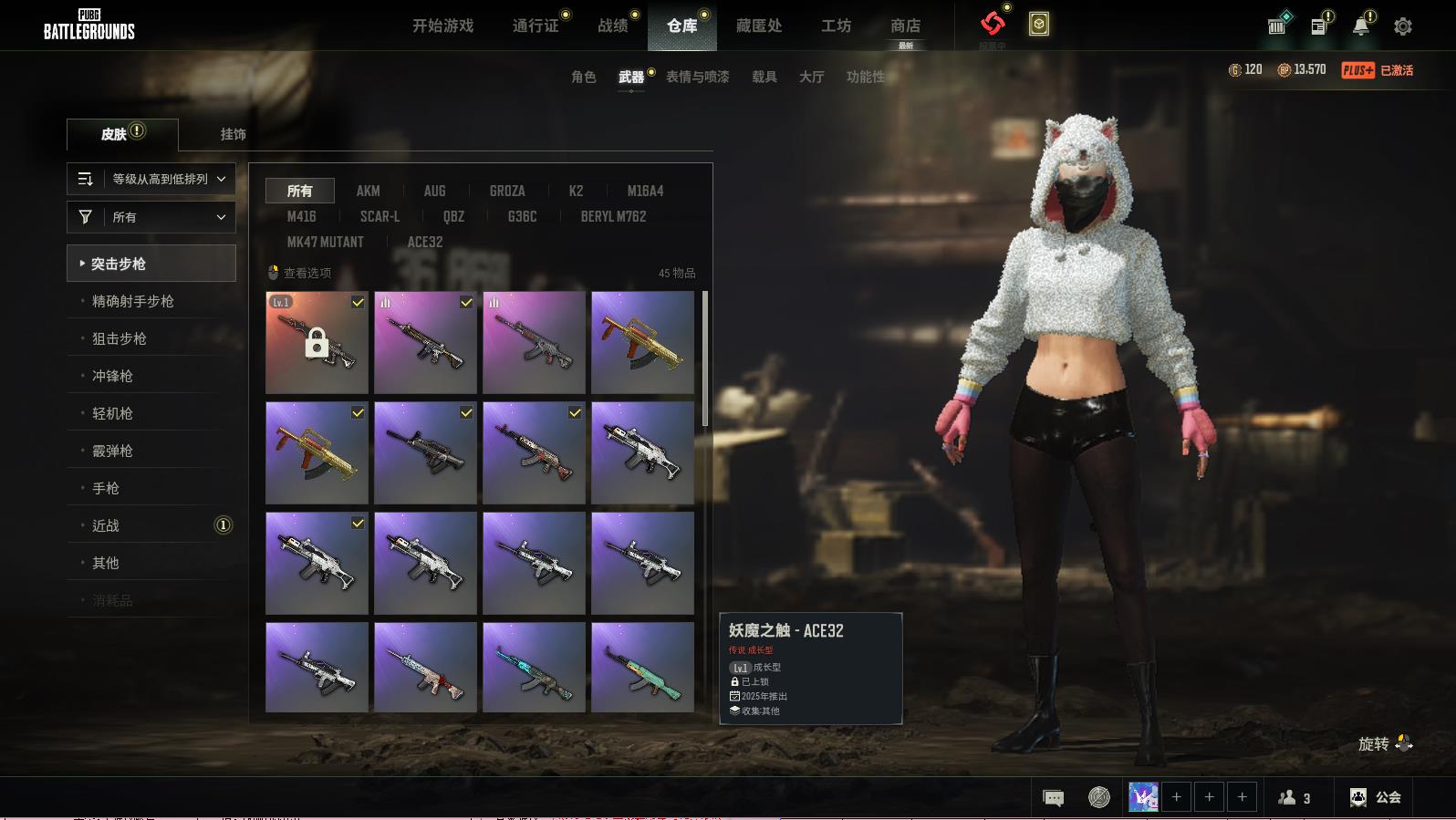 PUBG豪华版满级生存可排位,妖魔之触-ACE32;时光加农-SKS;鎏金色落叶-M416;余音环绕-ACE32;破碎元素-MINI14;漫彩四溢-SKS;湮灭-M24;粉梦长眠-M24;无重力-M249;一击撕裂者-S1897;镀金-GROZA;分秒必争-QBZ;鎏金王朝-REPVLM762;分形几何-G36C;分形几何-0BZ;雪国风光-M416;灵魂枷锁-AKM;鎏金色落叶-AKM