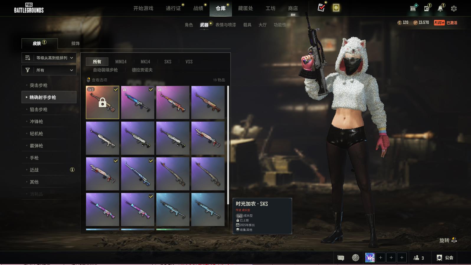 PUBG豪华版满级生存可排位,妖魔之触-ACE32;时光加农-SKS;鎏金色落叶-M416;余音环绕-ACE32;破碎元素-MINI14;漫彩四溢-SKS;湮灭