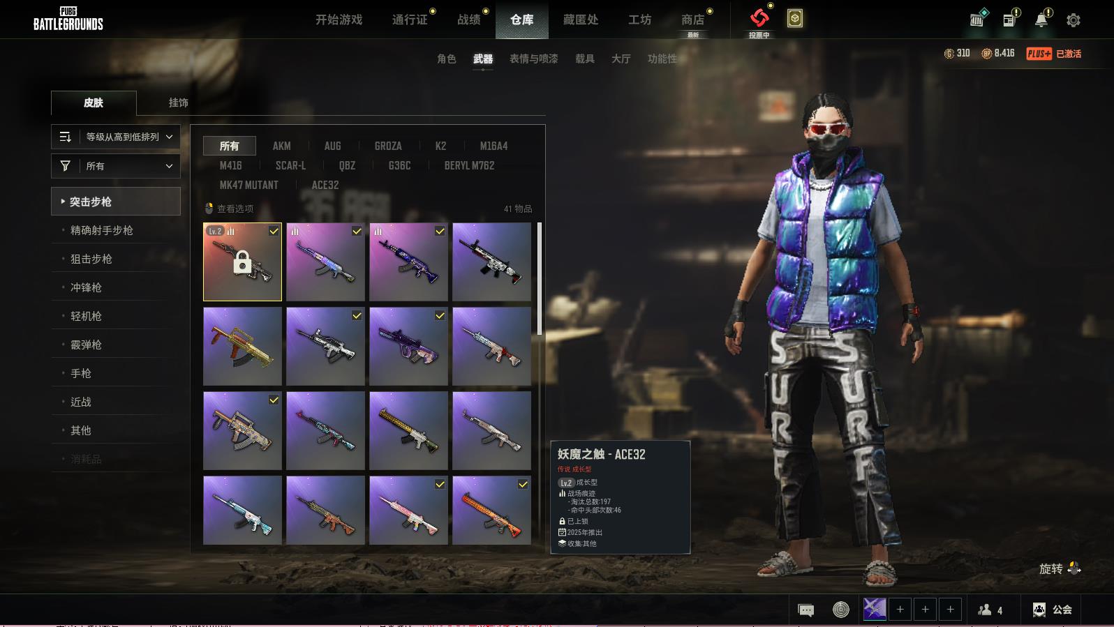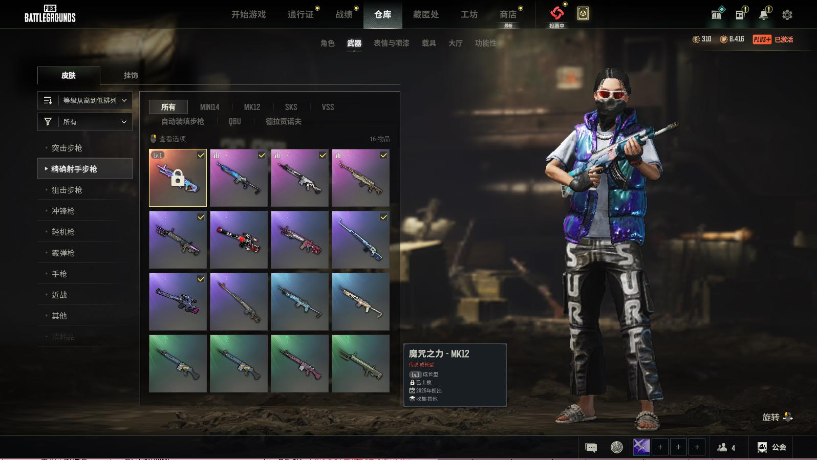 PUBG豪华版满级生存可排位,妖魔之触-ACE32Lv2-197;魔咒之力-MK12;无重力-MP5K;破碎元素-AKM;湮灭-BERYLM762;破碎元素-M
