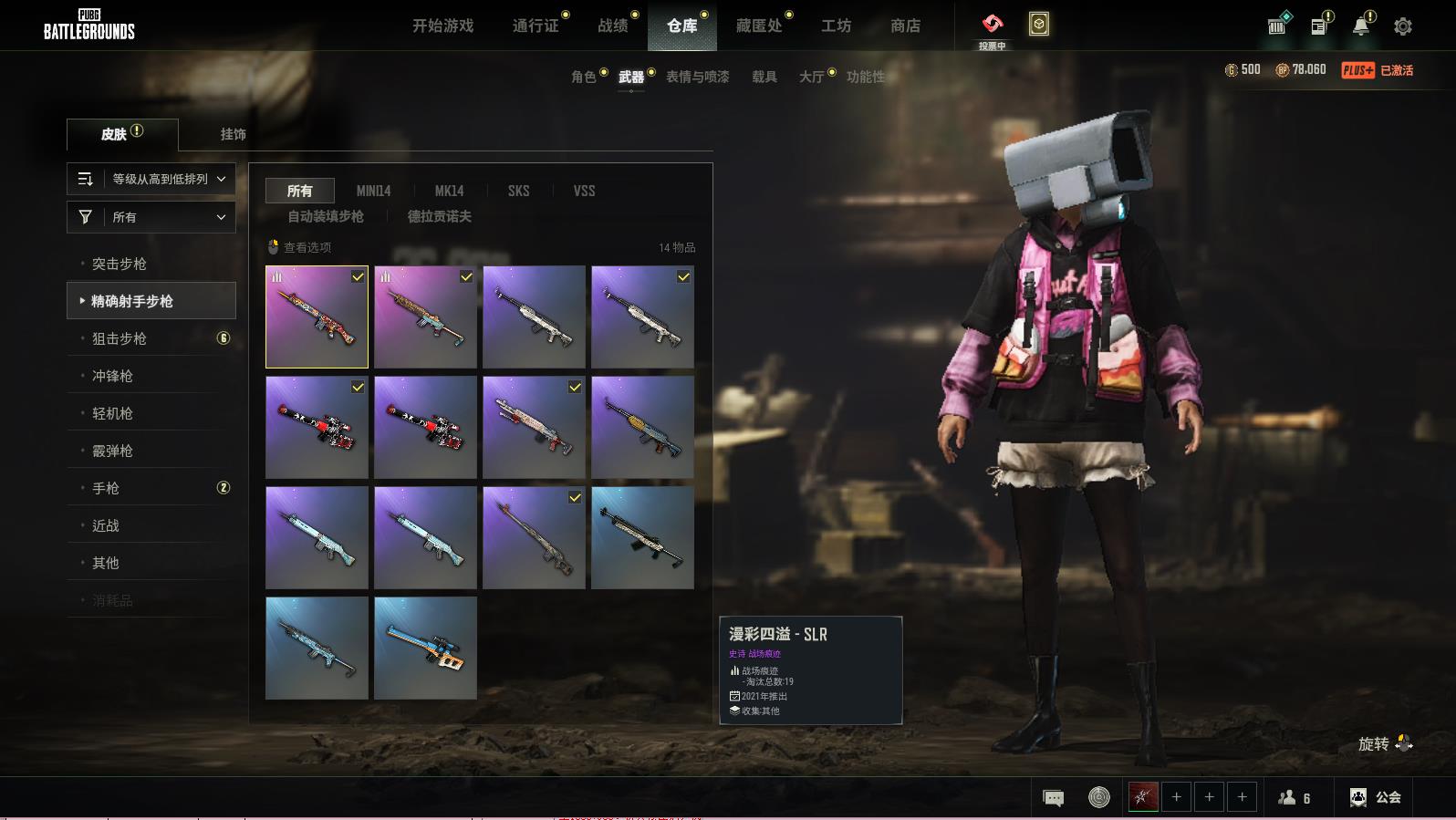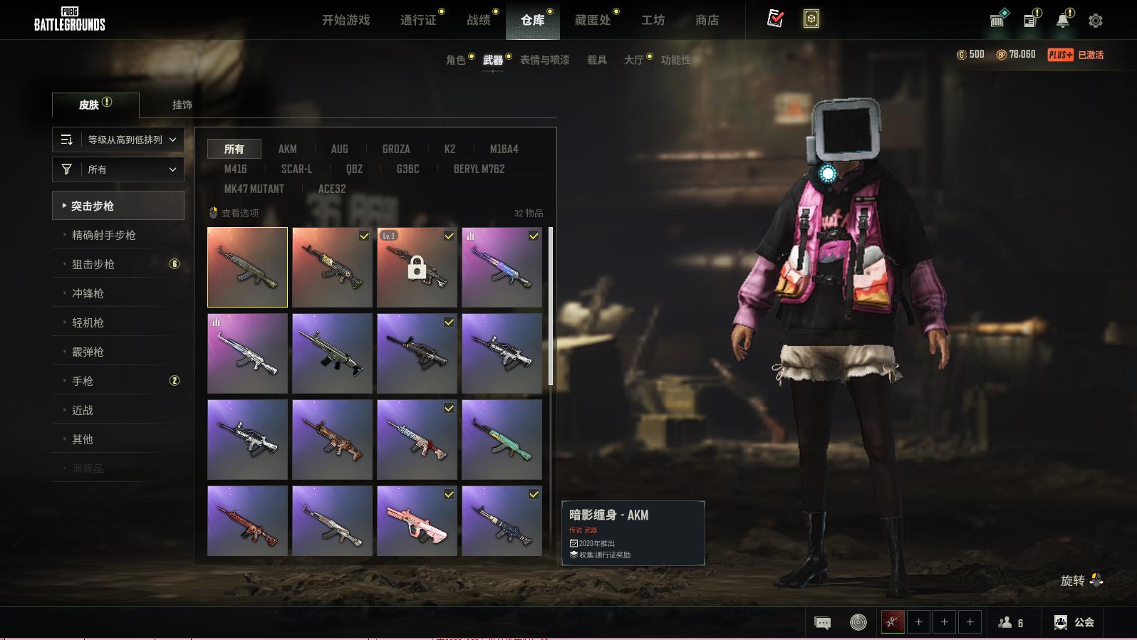 PUBG豪华版满级生存可排位,暗影缠身-AKM;PCS2金色成就-BERYLM762;妖魔之触-ACE32;破碎元素-AKM;君临寒冬-AKM;漫彩四溢-SLR