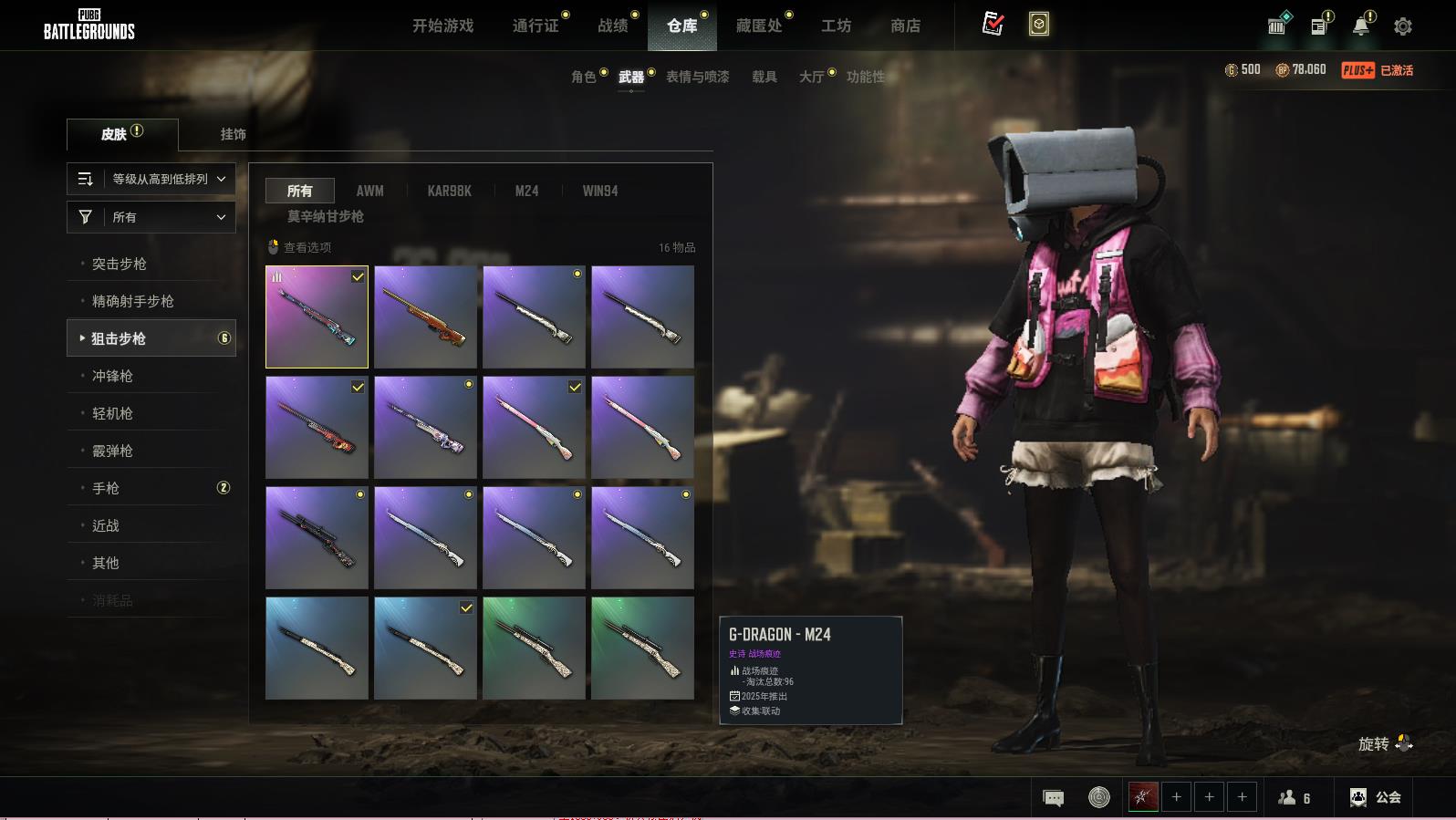 PUBG豪华版满级生存可排位,暗影缠身-AKM;PCS2金色成就-BERYLM762;妖魔之触-ACE32;破碎元素-AKM;君临寒冬-AKM;漫彩四溢-SLR;黑暗深渊-MINI14;G-DRAGON-M24;镀银-SCAR-L;分秒必争-QBZ;分形几何-0BZ;补丁-SCAP-L;雪国风光-M416;鎏金色落叶-AKM;蟒蛇花园-M416;大理石宝藏-AKM;彩糖蛋糕-AUG