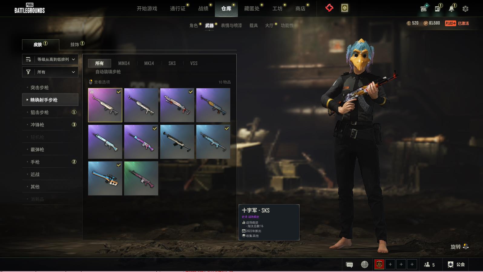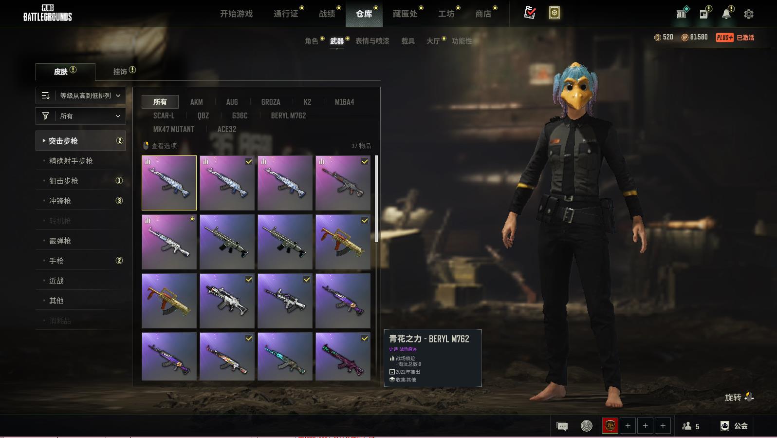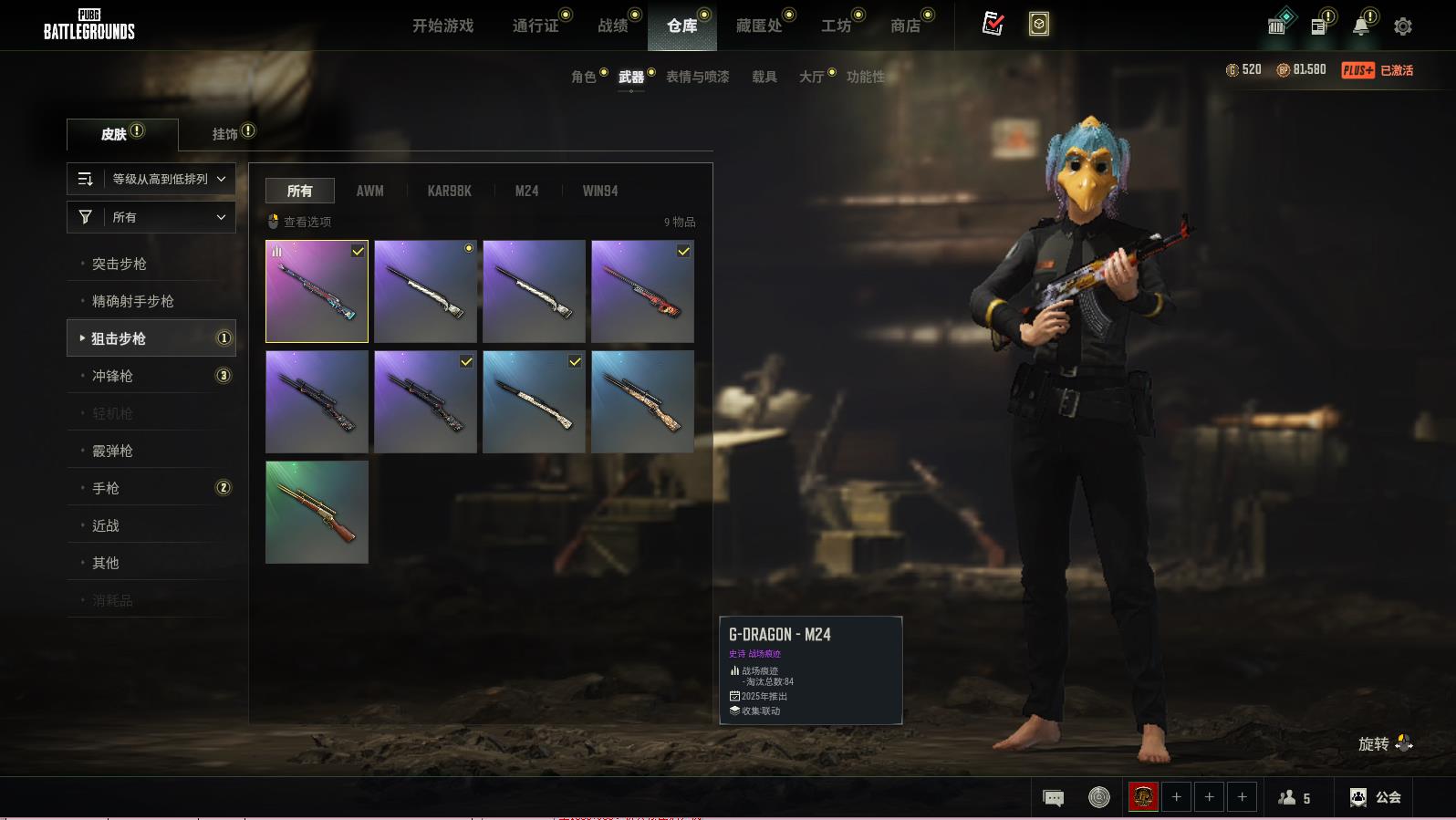 PUBG豪华版绝地求生可排位,青花之力-BERYLM762;余音环绕-ACE32;君临寒冬-AKM;十字军-SKS;G-DRAGON-M24;镀银-SCAR-L;镀金-GROZA;分形几何-G36C;分形几何-0BZ;魔女之力-BEPYLM762;竞速之道-AKM;灵魂枷锁-AKM;灵魂枷锁-MK47MUTANT;天拘来世-K2;皇家舰队-K2