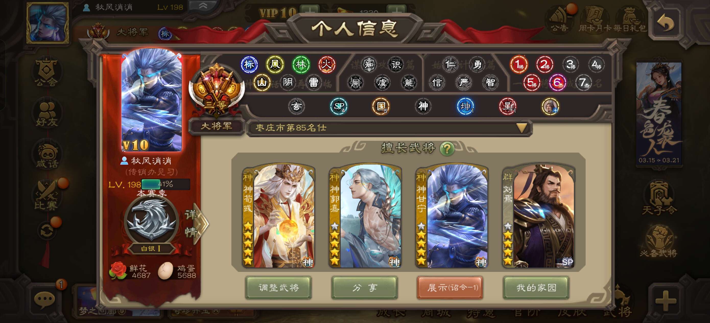 【VIP等级】VIP10[官阶】大将军【游戏等级]198 【史诗武将数量]57【所有皮肤数量】424【动态皮肤数量]50 【武将]神关羽,神吕蒙,神周瑜,神诸葛亮,神吕布,神赵云,神刘备,神甘宁,神张辽,神郭嘉,神荀彧,刘焉谋黄盖文鸯王元姬界左慈界沮授周不疑