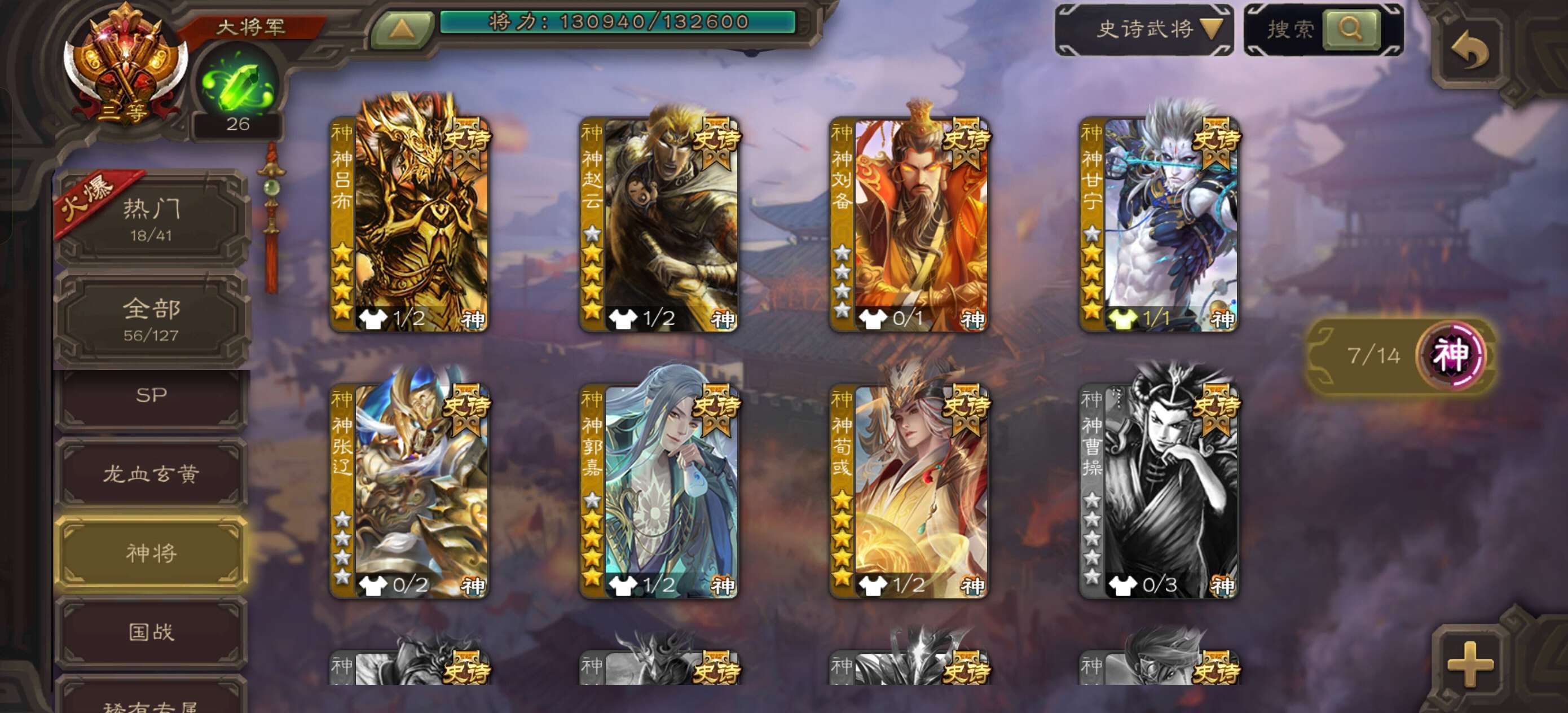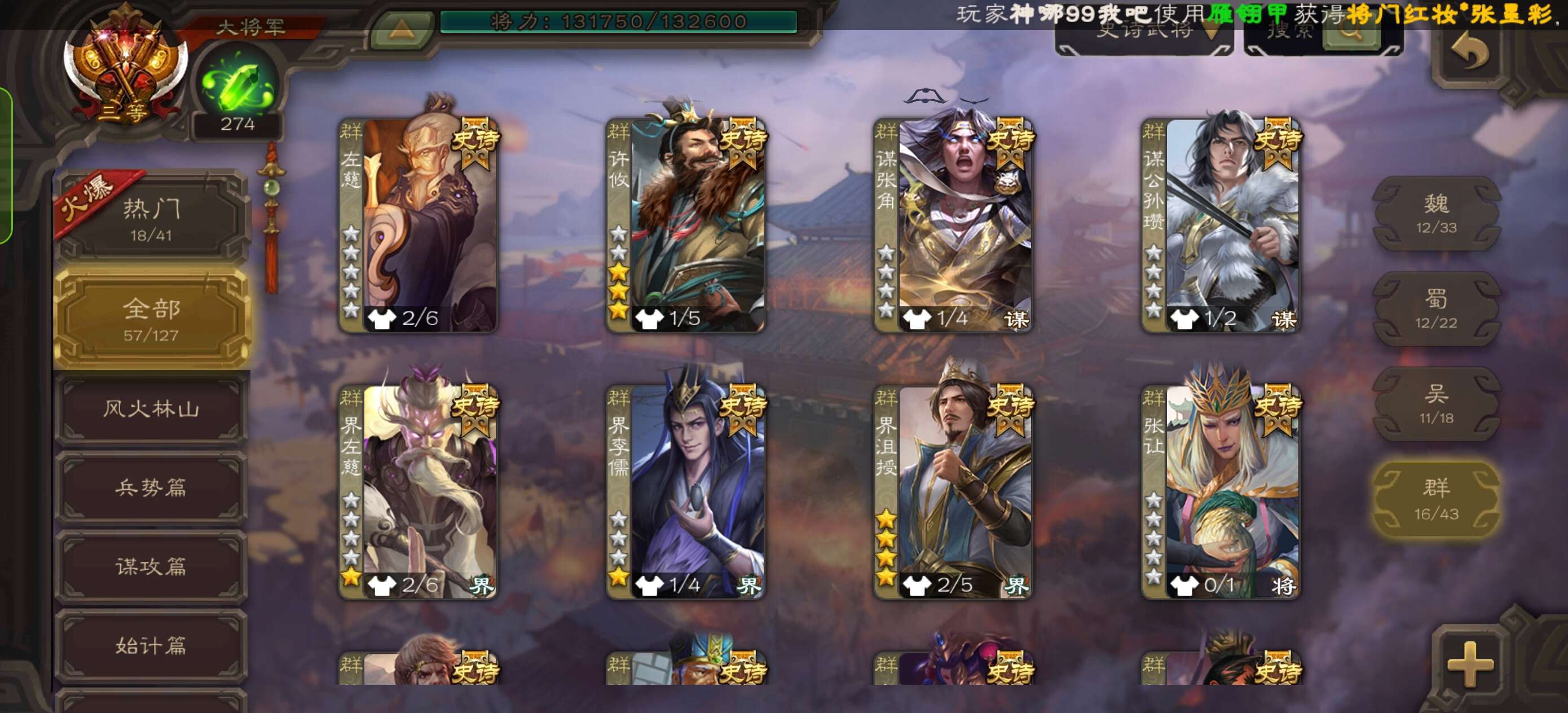 【移动互通版】v10三等大将军⭐逃跑进小黑屋⭐57史诗50动皮⭐神荀彧神郭嘉刘焉谋黄盖文鸯王元姬界左慈界沮授周不疑