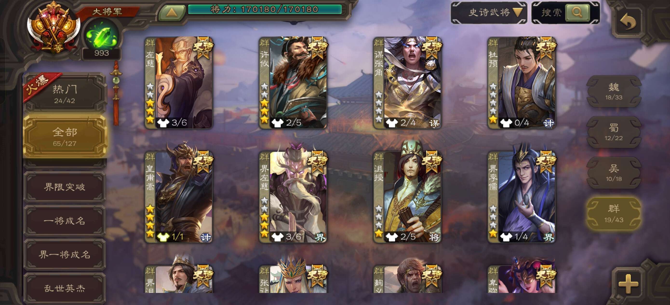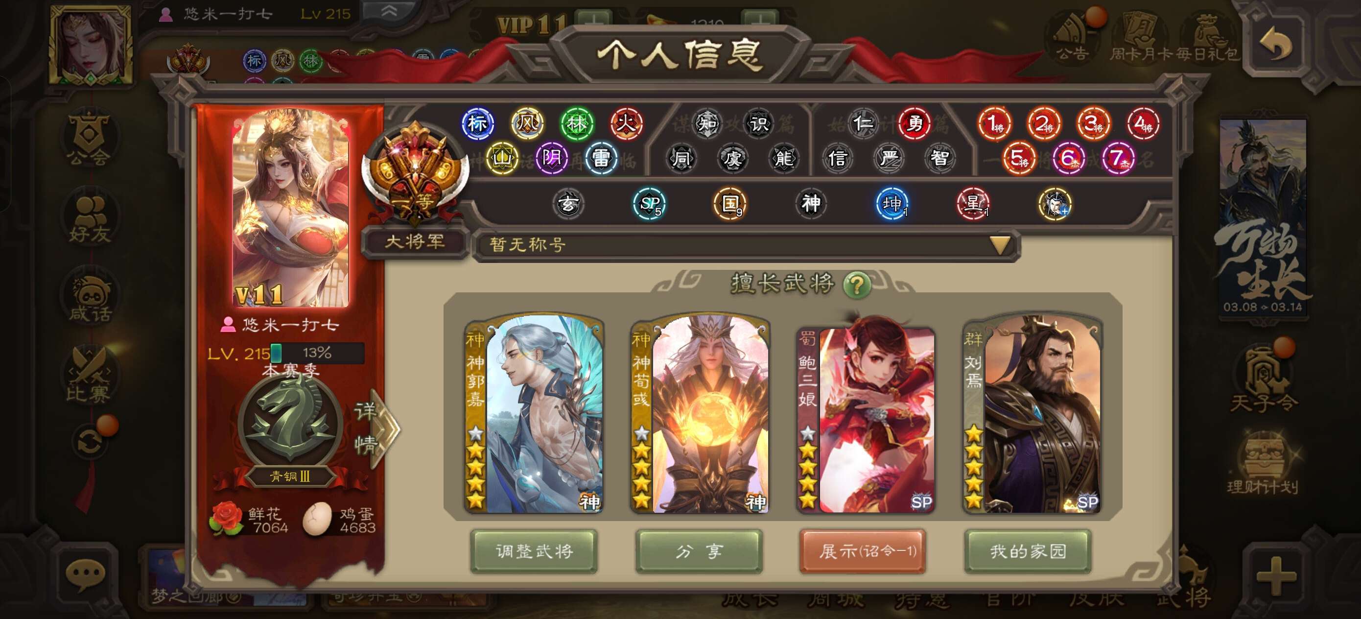 【VIP等级】VIP11[官阶]大将军【游戏等级]215 【史诗武将数量]65【所有皮肤数量】530【动态皮肤数量]58 【武将】神吕蒙,神周瑜,神诸葛亮,神曹,神吕布,神赵云,神刘备,神甘宁,神张辽,神郭嘉,神荀彧,刘焉谋曹皮文鸯谋黄盖祢衡界沮授