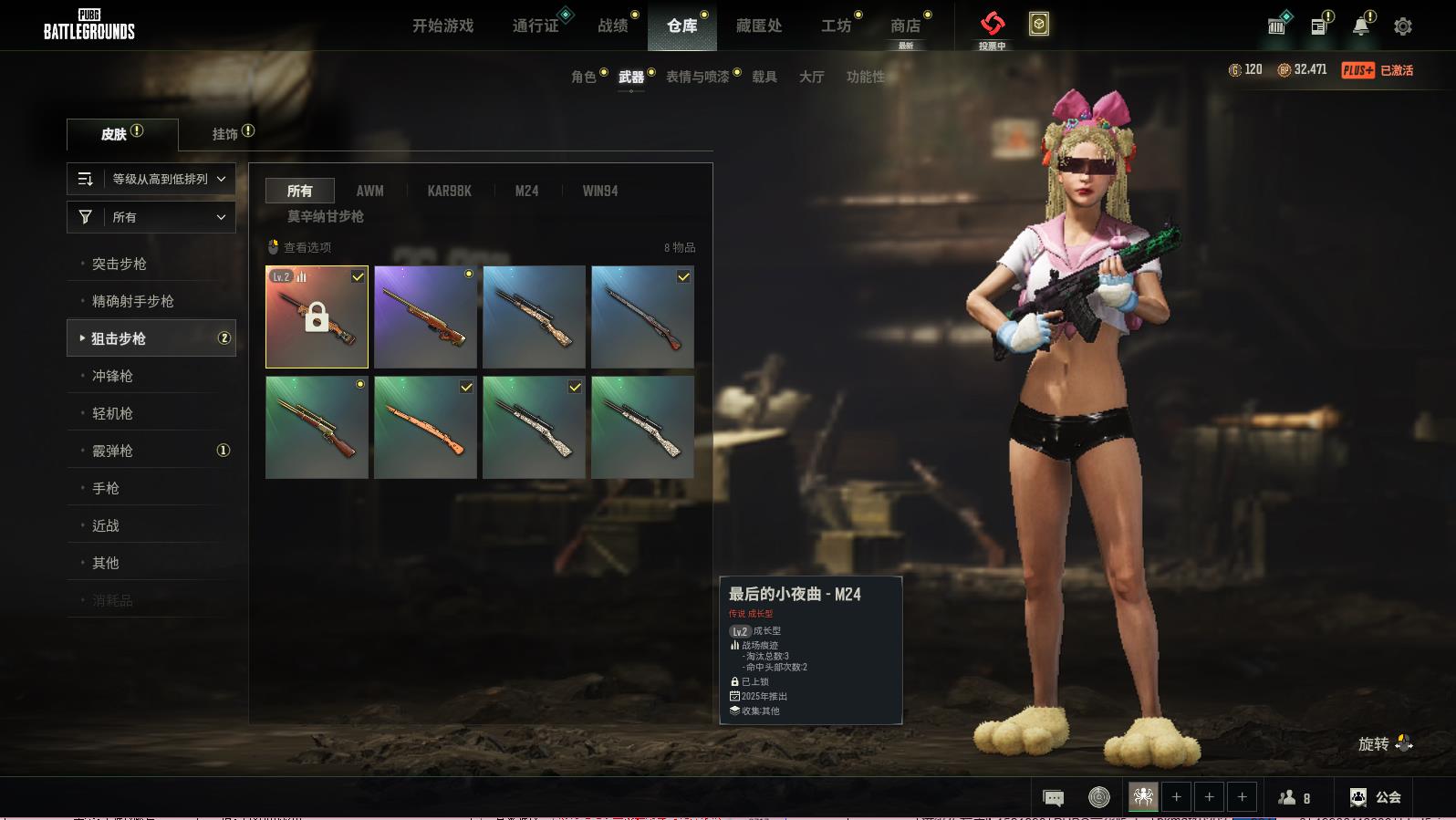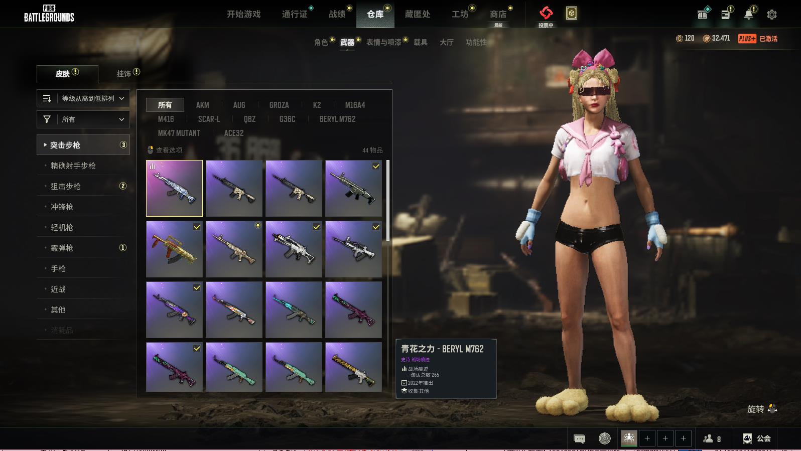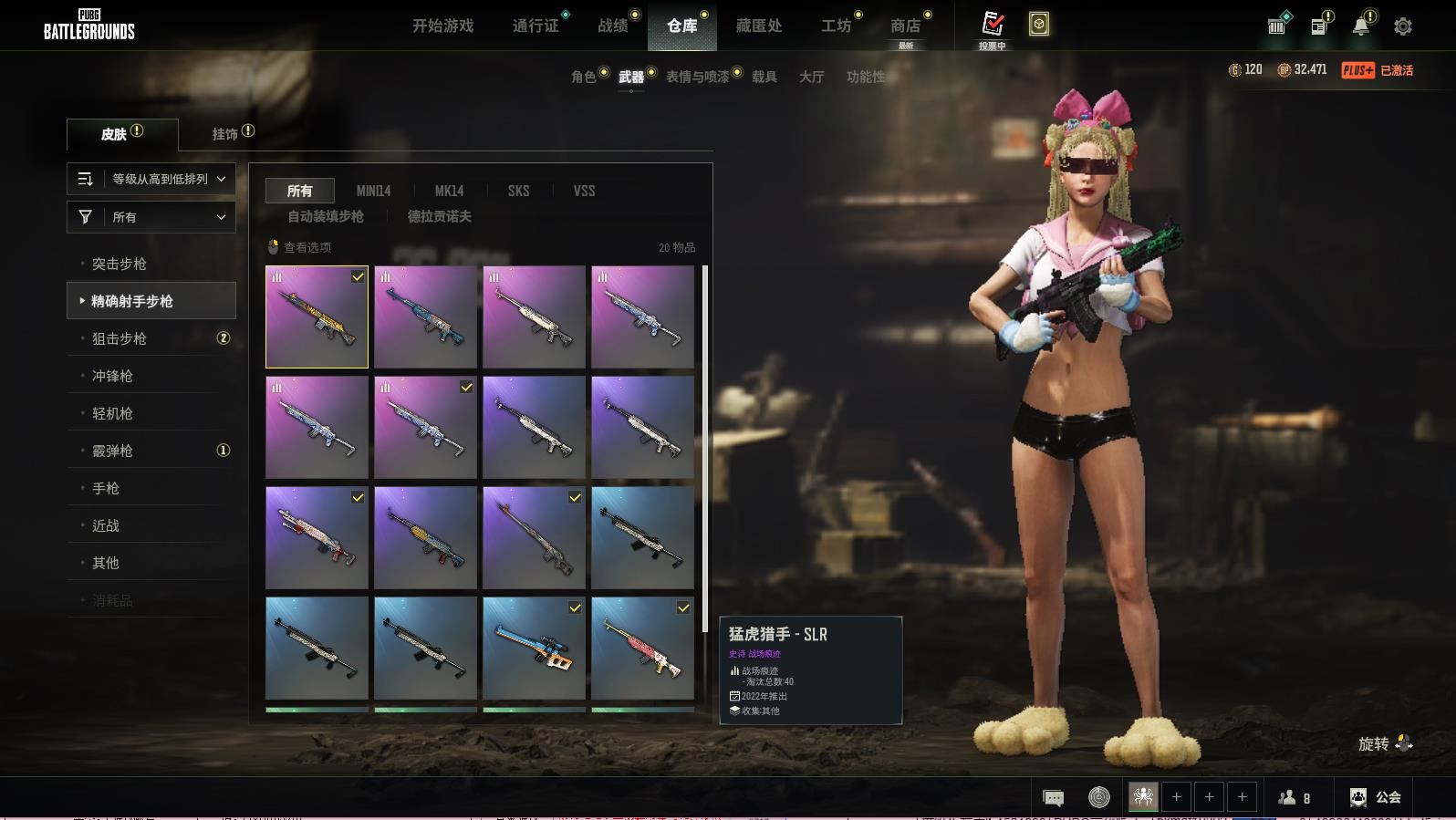 PUBG豪华版满级生存可排位,余音环绕-ACE32;漫彩四溢-SLR;赛博危机-SLR;三重彩-SCAR-L;数码沙漠迷彩-M416;分形几何-0BZ;多彩科技猫-AUG;山花烂漫-BEPYLM762;灵魂枷锁-MK47MUTANT;PNC2022连战连捷-M416;大理石宝藏-AKM;礼物环绕-REPYLM762;奥丁的先锋-AKM;心跳掠夺者-MK47MUTANT;钟楼魔女贝拉-ACE32;铜色猎手-GPOZA;魔力宝贝-M164