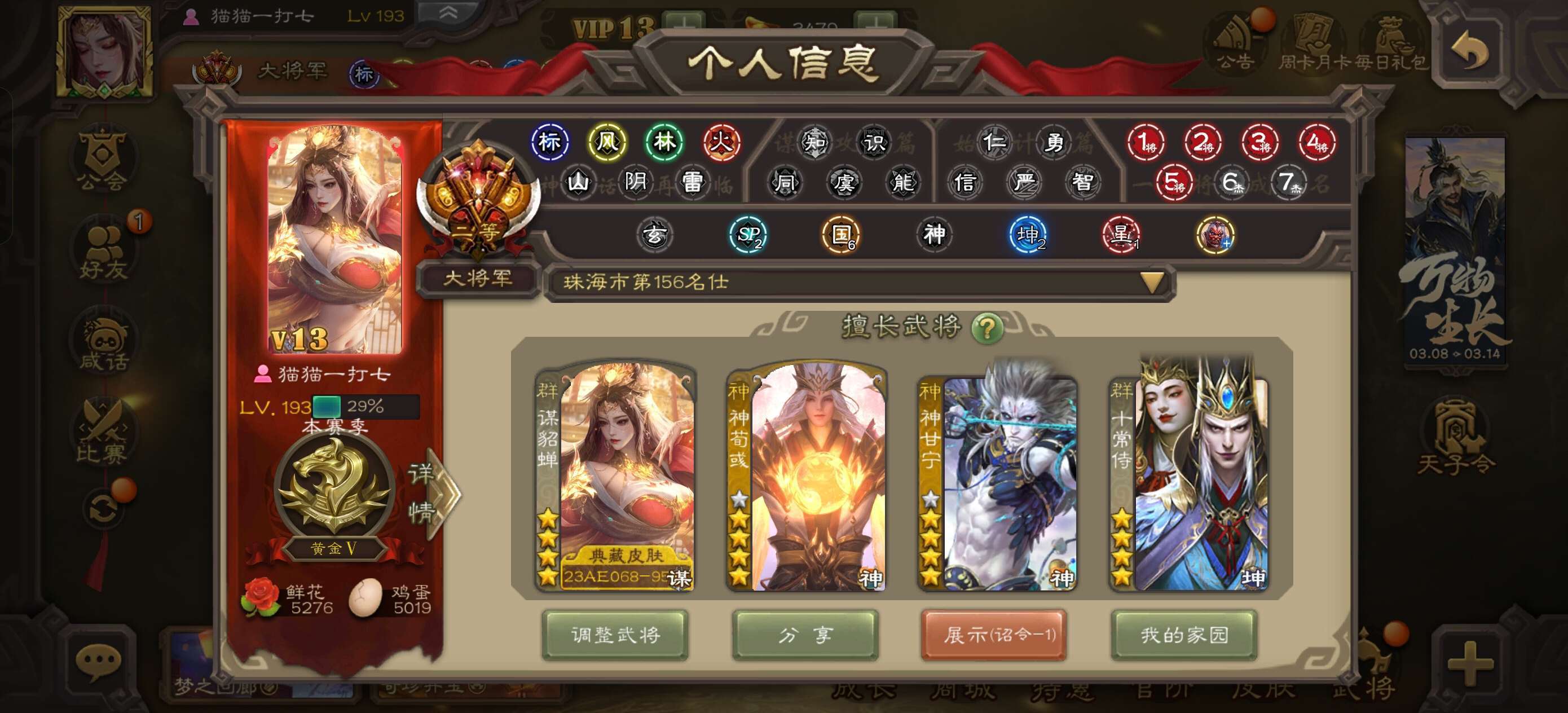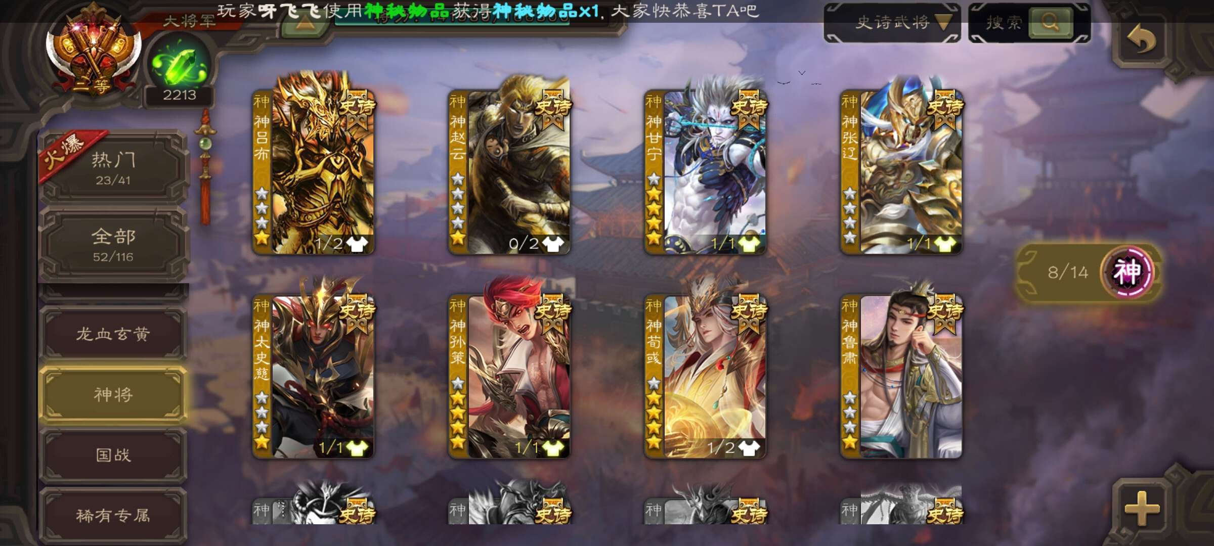 v13二等大将军【史诗武将数量]52【所有皮肤数量]471【动态皮肤数量】49 【武将】神关羽,神吕蒙,神周瑜,神诸葛亮,神吕布,神赵云,神甘宁,神太史慈,神孙策,神荀彧,神鲁肃,刘焉十常侍文鸯谋黄盖谋貂蝉杜预