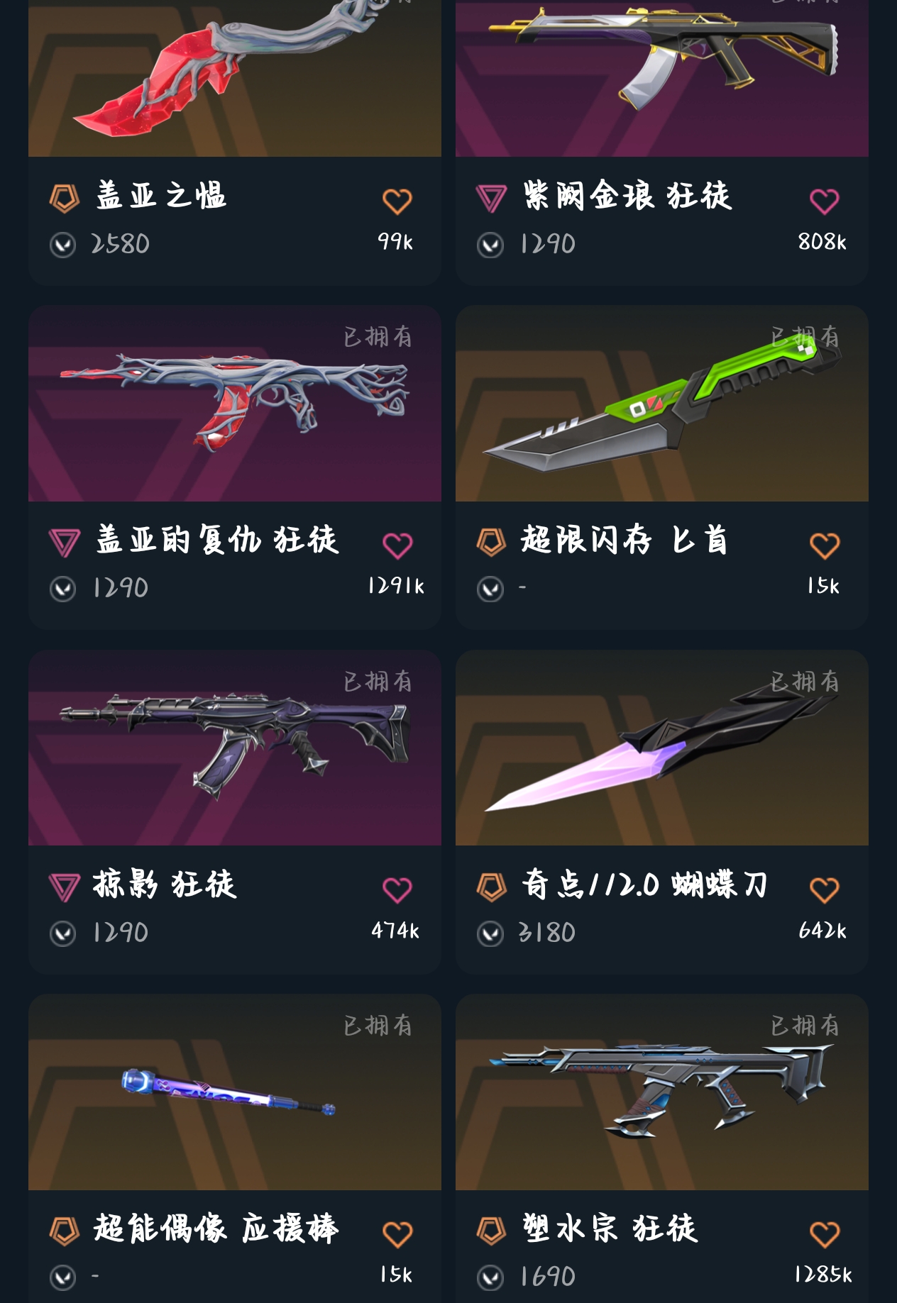 q区/可排位/ak,盖亚、紫金、流脓、掠夺、塑水宗/m4,盖亚、蛇年套/奇点蝴蝶/剥皮小刀/盖亚之愠/奇点,边陲正义/神罚莽侠/起源大狙;剥皮小刀,盖亚的复仇 狂徒,洪荒怒焰 狂徒,掠影 狂徒,异鳞魔蛇 幻影,紫阙金琅 狂徒,塑水宗 狂徒,