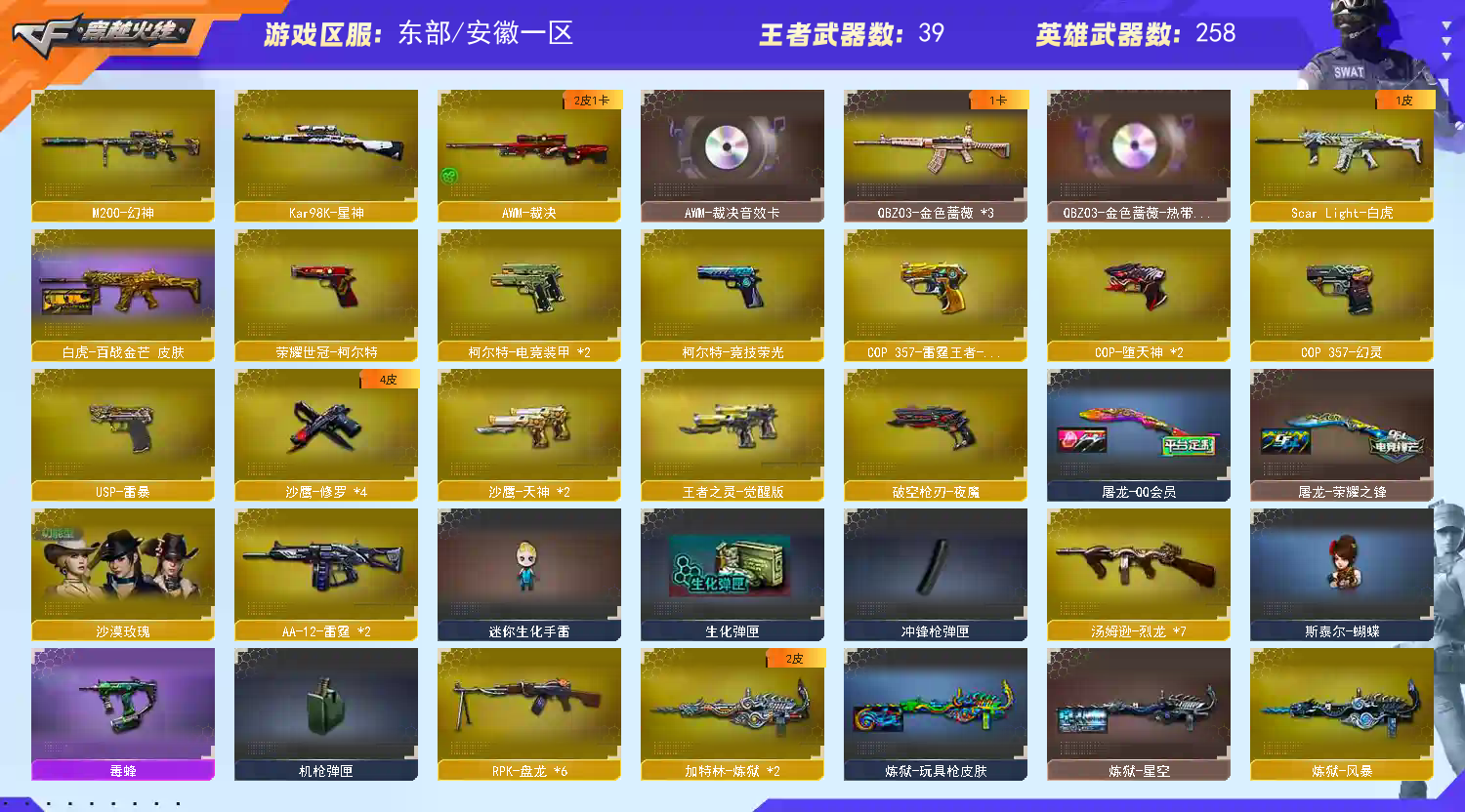 【主武器】M200-幻神/98K-星神/幻神竞技荣光/白虎/青龙/朱雀/王者白虎觉醒/王者蔷薇qbz觉醒/荣耀世冠雷神/斯太尔蝴蝶/毒蜂/MK5-炽火炎龙/炼狱悦蓝觉醒/2炼狱/炼狱风暴/⑥烈龙⑥盘龙/M4堕天神/②M4夜魔/AK雷暴/千变/②火麒麟/黑龙/③雷神/3黑骑士/无影/死神/黑武士/天启/2超新星/武圣/M4幻灵/金色蔷薇-古蛇迷踪/超新星热带奇洋/玫瑰精灵/蔷薇qbz/2烈火/烈火动感闪耀/王者之心觉醒/王者之魄觉醒/王者之武觉醒/黑武士网剧套装/王者之鲨觉醒/王者冰魄觉醒/身先士卒/常胜将军/白虎电玩蓝兔/天龙/毁灭/2极光/裁决/朱雀大炮/电竞装甲大炮/2蔷薇大炮/王者之怒觉醒/3暗月传说大炮/王者之决觉醒/AA12雷霆/雷神精英刀锋/朱雀蛇影宗/火麒麟绝迹/雷神小红/王者之烈/王者之戮/2王者之魄/王者之翼/王者之鲨/炫金黑龙/炫金雷神/炫金骑士/王者星神/王者之光/裁决雪莉杨/天龙曼陀罗/炫金毁灭/炫金天龙/腐蚀激光超越Max/擎天柱/金魔/神圣爆裂者3/试炼破坏者3/机甲撕裂者3/ 【副武器】COP357-雷霆王者觉醒/COP357-幻灵/2COP-堕天神/柯尔特-竞技荣光/柯尔特-荣耀世冠/USP雷暴/破空枪刃夜魔/2电竞装甲柯尔特/天神动感闪耀/修罗-古蛇迷踪/王者之魂觉醒/王者之灵觉醒/天神网剧套装/4修罗/2天神/武圣手枪/炫金修罗/MAC-10-远古神话/2COP旗袍/ 【近身武器】荣耀世冠-龙啸/4屠龙/龙啸/2擎天/3麒麟刺/斩神刀雷暴/麒麟刺堕天神/龙啸堕天神/马来剑夜魔/电竞装甲尼泊尔/②幻灵之峰/擎天竞技荣光/屠龙动感闪耀/擎天云海游龙/龙啸热带奇洋/王者之峰觉醒/3王者之啸觉醒/2王者之击觉醒/王者之刺觉醒/擎天网剧套装/金刚伞电玩红兔/②黄金迷你深渊吧经理/黄金尼泊尔/黄金迷你裂空之翼/手斧镜/招财猫枪王排位/ 【投掷武器】迷你生化手雷/7高爆雷暴+烟闪/5高爆堕天神+烟闪/7高爆夜魔+烟闪/7电竞装甲恶棍+烟闪/6高爆幻灵+烟闪/7高爆竞技荣光+烟闪/高爆神功天巧/手雷动感闪耀/手雷热带奇洋/高爆古蛇迷踪/高爆雷霆王者/ 【角色】沙漠玫瑰+四防/电竞教官云悠悠+四防/凌霄+四防/影豹+四防/王者影豹+四防/王者春+四防/王者葵貂蝉+四防/王者零国色天香+四防/王者魅影+四防/王者瞳闭月羞花+三防/王者瞳惊若翩鸿+四防/修道士/魅影/云海游龙/炫/灵狐者职业经理+四防/灵狐者黄金海岸/王者零传说之路/樱-青春偶像/职业选手/迷迭香/春/葵/奇洋探员/乔伊教练/蛇隐宗/审判者/王者救世主/对讲机/炫彩背包 【皮肤】毁灭-冠军之怒皮肤/毁灭-耀金皮肤/毁灭-星空皮肤/火麒麟-冠军之心皮肤/火麒麟-AG战队皮肤/火麒麟-轻羽皮肤/火麒麟-口口会原皮肤/火麒麟-华夏之心/雷神-虎将皮肤/雷神-LGD皮肤/雷神-星空皮肤/黑龙-冠军之武皮肤/黑龙-墨子皮肤/修罗-冠军之魂皮肤/修罗-星空皮肤/屠龙-荣耀之峰皮肤/屠龙-口口会原皮肤/炼狱-星空皮肤/黑骑士-地狱火皮肤/裁决-百城天津皮肤/天龙-传奇白鲨皮肤/天龙-传奇70KG皮肤 【音效卡】星神-古蛇迷踪皮肤/裁决音效卡/雷神音效卡/超新星热带奇洋音效卡/黑骑士音效卡/毁灭音效卡/蔷薇qbz热带奇洋音效卡/极光音效卡/黑龙音效卡/ 【道具】紫金大元首/全背包/VIP6/手枪/步枪/冲锋枪/狙击枪/机枪/生化弹夹/变异宝贝/灵魂忍者/妖姬/迷雾幽灵/疯狂宝贝/生化爆破全装;USP-雷暴,荣耀世冠-柯尔特,沙漠玫瑰,电竞教官-云悠悠,RPK-盘龙,QBZ03-金色蔷薇,M200-幻神,