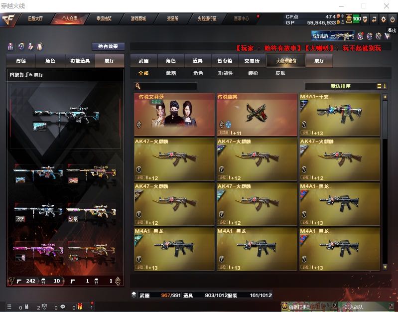 全装号,金名满配副武器,幻神7皮+音效卡,星神三件套,裁决三件套,USP雷暴,cop堕天神,柯尔特白鲨,6炼狱6盘6烈小刚+蝴蝶,角色全部4房,生化角色樱-青春偶像,无需换弹 11张音效卡;