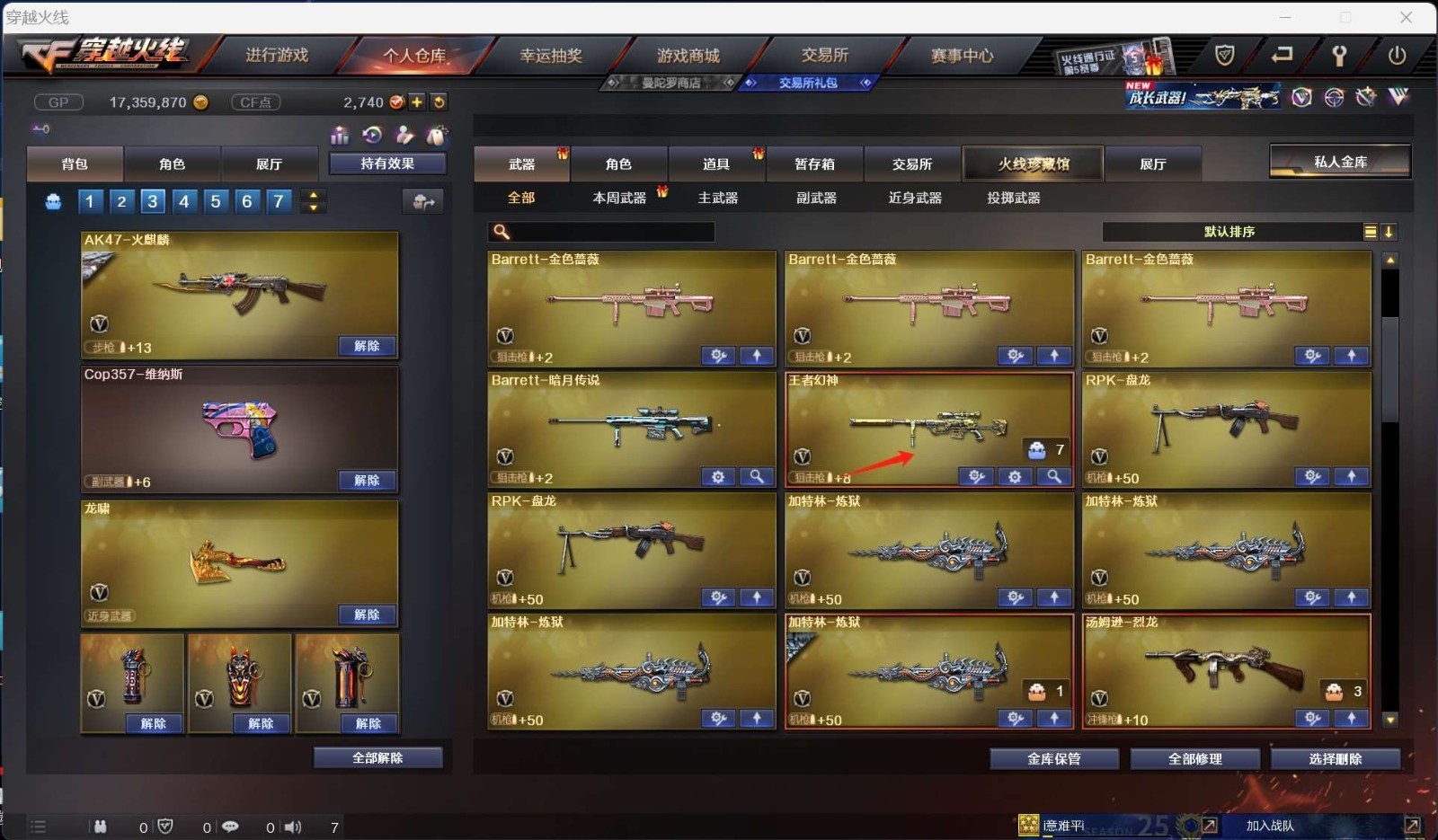 【m200幻神+王者幻神+m200竞技荣光】【白虎】【qbz03金色蔷薇+芭蕾特金色蔷薇】【9烈龙+4炼狱+2盘龙+斯泰尔蝴蝶】【5黑骑士】【网剧冠军套装】【hk417朱雀 青龙 】【毁灭+毁灭音效卡+ag冠军皮肤】【雷神+雷神音效卡+荣耀之魄皮肤+白鲨s14冠军皮肤】【火麒麟+火麒麟音效卡】【王者炎心 王者之心 王者之翼 王者之魄 王者之城 王者之心 王者之光】【烈火 天启 战神 黑鲨 黑武士 机械迷城 麒麟 超新星 无影 黑龙 龙血 玫瑰精灵 千变 死神 武圣 裁决 天龙 暗月传说 极光 芭蕾特朱雀 aa12雷霆】——【热门武器/小人呛】【雷神精英刀锋 火麒麟绝迹 火麒麟灵狐 斯泰尔蝴蝶 m37葵 】——【修罗*5 天神 天神网剧冠军 王者之灵 武圣手呛】——【龙啸 尼泊尔雷霆 龙啸堕天神 麒麟刺 麒麟刺堕天神 擎天 擎天网剧冠军 擎天竞技荣光 屠龙 王者之啸 王者之刺】——【堕天神投掷武器套装*2+竞技荣光投掷武器套装+雷霆投掷武器套装】——【角色】——【4防(王者葵貂蝉 王者魅影)】【葵 审判者 王者瞳闭月羞花 王者零 王者玲珑 王者之瞳】;RPK-盘龙,QBZ03-金色蔷薇,M200-幻神,Scar Light-白虎,