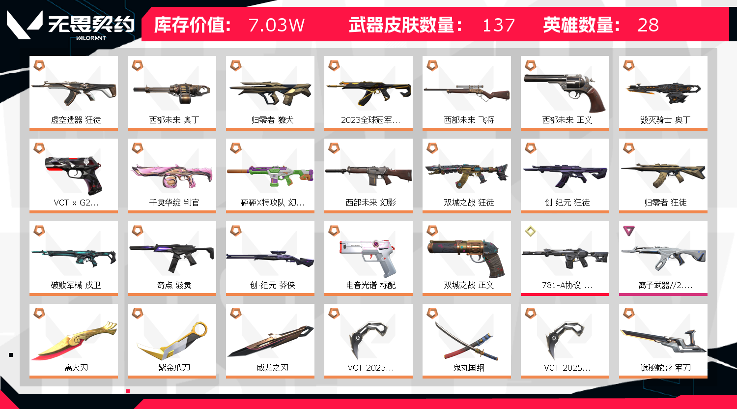 ❤️❤️❤️账号库存价值较大,已做大额虚拟资产备案,开挂盗号等行为报案处理,请不要以身试法。 ❤️❤️❤️禁止游戏内挂机违者拉黑公示,喜欢本账号请点收藏★方便下次租用,谢谢光临惠顾!;西部未来 奥丁,离火刃,紫金爪刀,威龙之刃,VCT 2025 爪刀,归零者 獠犬,盖亚的复仇 狂徒,