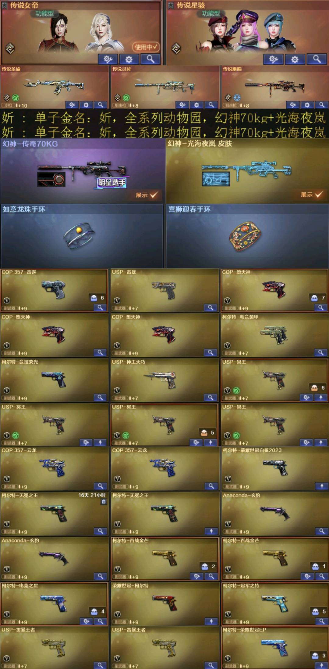 中途退赛永久拉黑,我手里所有号你都租不了 最新法玛斯天戎,幻神光海夜岚皮,最新赛事AG皮,白虎白鲨皮+裁决巅峰荣耀皮已氪,传说活动打穿,全编音效卡已补,动物园已补,紫色泡泡象,狮子,柯基套,松狮套,黄金猫猫手套,王者cat,百战金芒柯尔特;USP-雷暴,柯尔特-无冕之王,USP-雷暴王者,荣耀世冠-柯尔特,柯尔特-荣耀世冠白鲨2023,柯尔特-冠军之特,炽芒蝶刃,