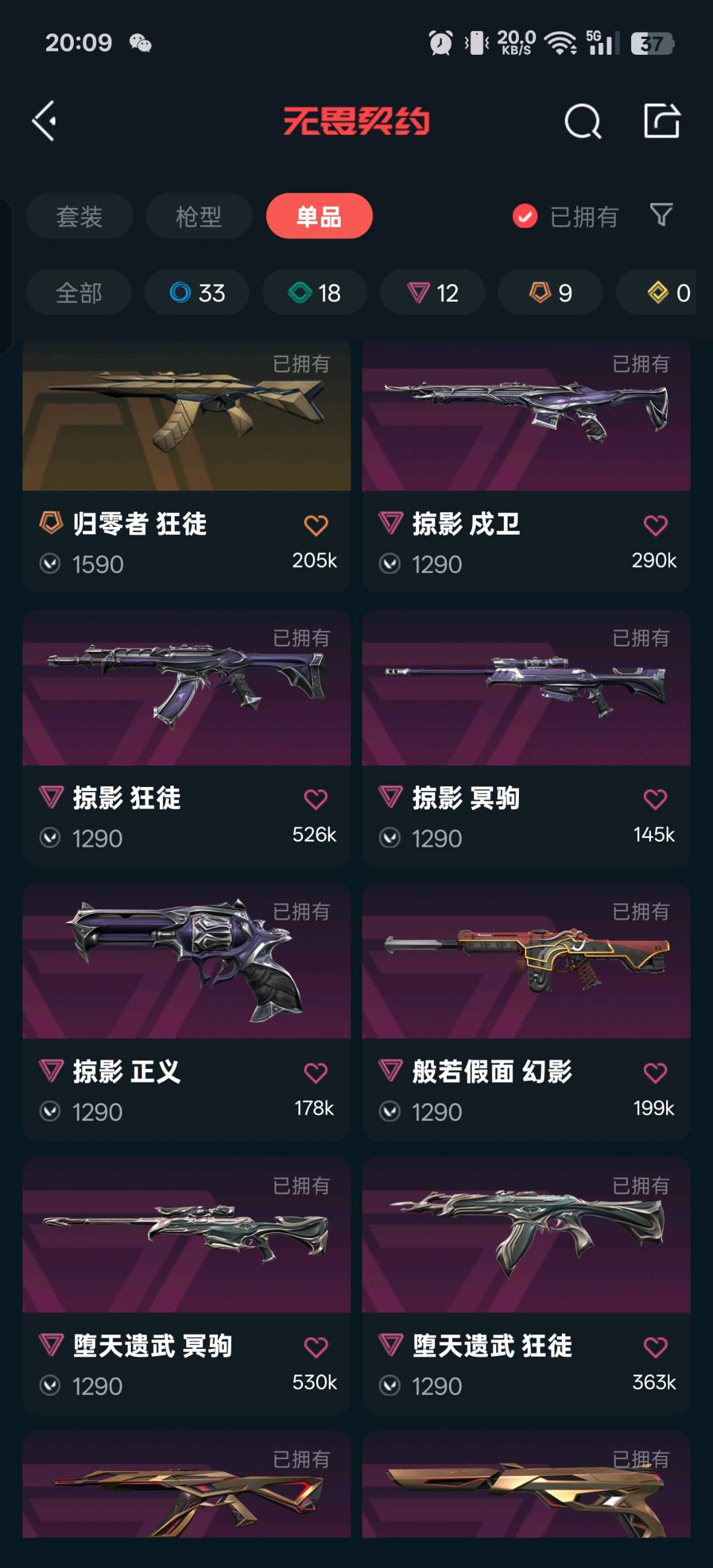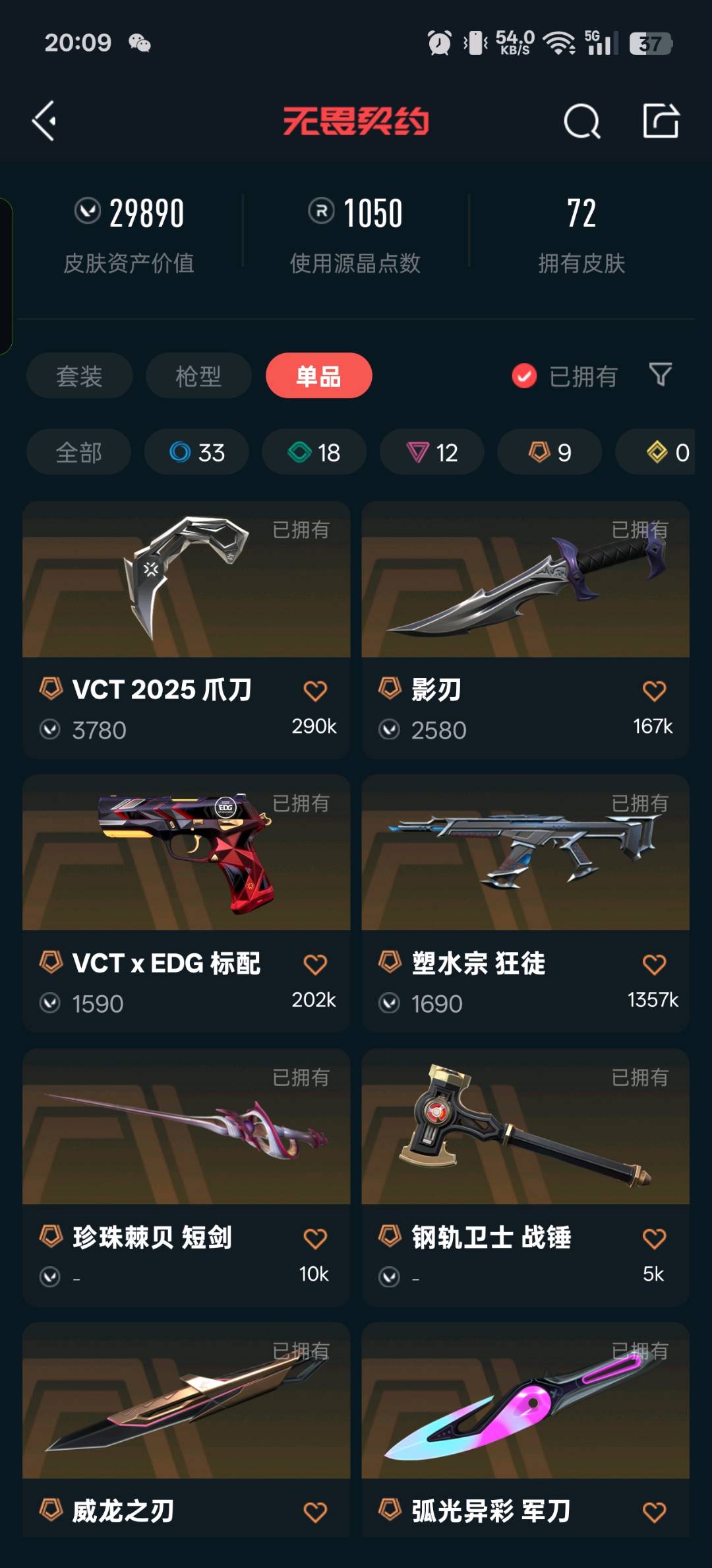 可排位 英雄27 武器皮肤数量72;威龙之刃,VCT 2025 爪刀,掠影 戍卫,掠影 狂徒,侦察力量 幻影,紫阙金琅 狂徒,堕天遗武 狂徒,