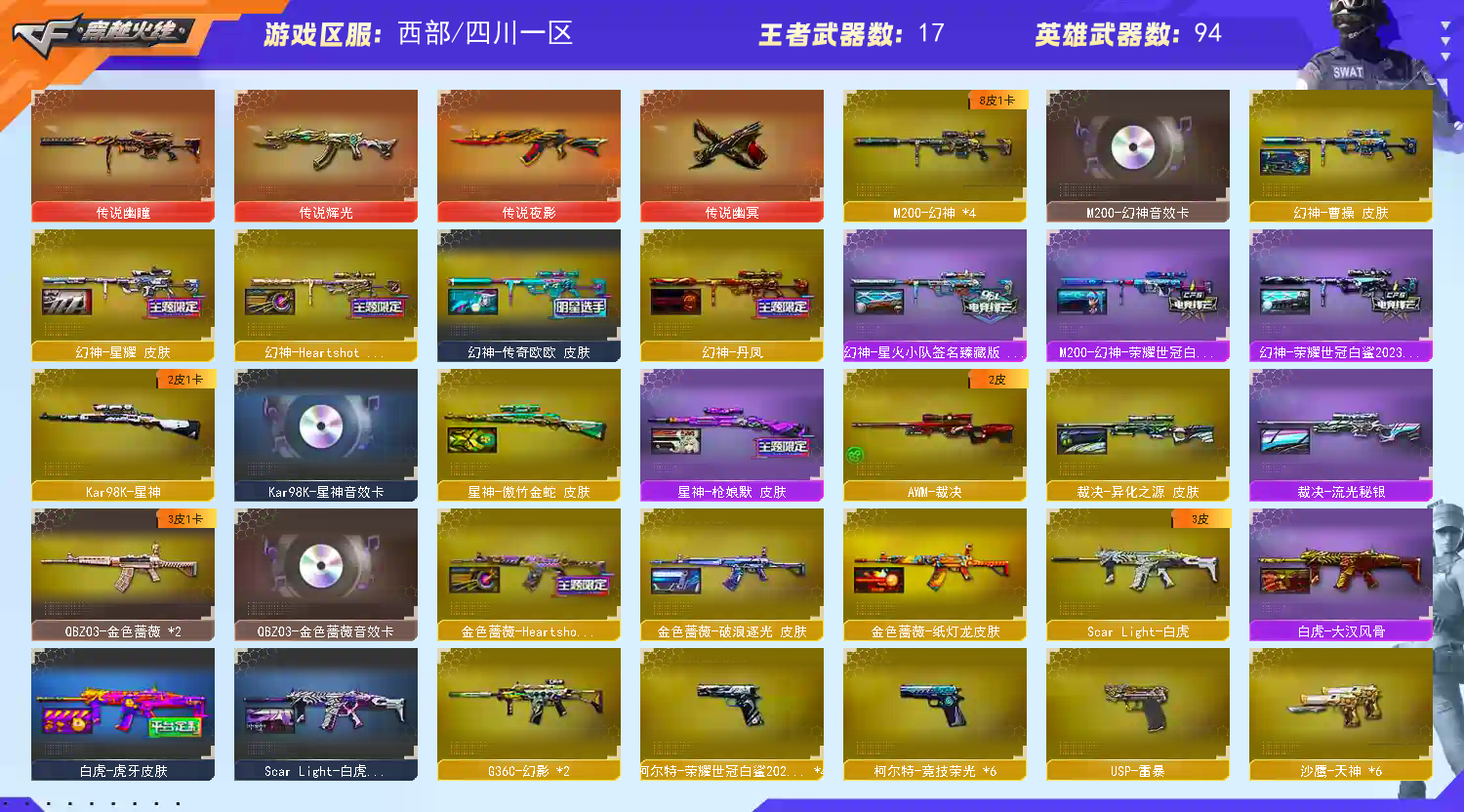 【西部】121v传说幽瞳4传说+幻神新白鲨❤传奇欧欧⑧皮+幻神音效卡G36c幻影银翼蝴蝶刀天花板;USP-雷暴,柯尔特-荣耀世冠白鲨2023,传说幽冥,炽芒蝶刃,隼,电竞教官-云悠悠,晴雅,