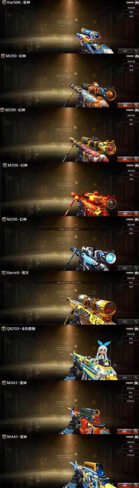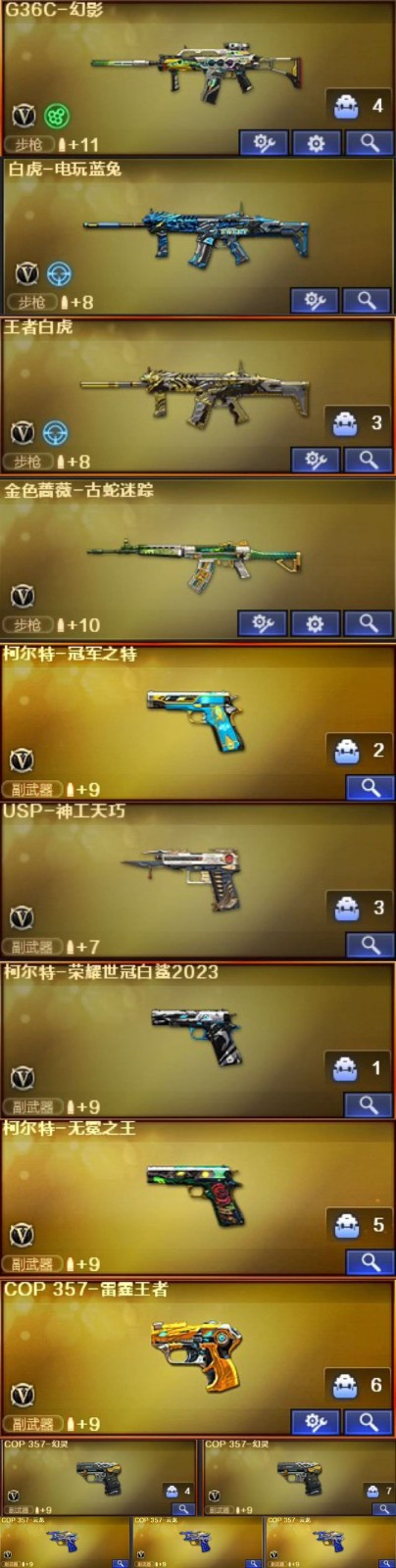 王者武器:COP 357-雷霆王者-觉醒版;闪光弹-雷霆王者-觉醒版;高爆手雷-雷霆王者;烟雾弹-雷霆王者-觉醒版;王者之魄-觉醒版;王者龙血-觉醒版;王者之烈-觉醒版;王者白虎-觉醒版;王者之锋-觉醒版 英雄武器:黑骑士-海王;柯尔特-荣耀世冠白鲨2023;M4A1-雷神;柯尔特-无冕之王;汤姆逊-烈龙;云龙扇;COP 357-云龙;烟雾弹-云龙;高爆手雷-云龙;超新星-热带奇洋;闪光弹-云龙;龙啸-热带奇洋;AWM-裁决;黑武士-锦绣游龙;手雷-热带奇洋;G36C-幻影;Barrett-云海玲珑;烈龙-云海游龙;擎天-云海游龙;手雷-云海游龙;COP 357-幻灵;高爆手雷-幻灵;龙啸-烈火龙威;烈火-动感闪耀;屠龙-动感闪耀;天神-动感闪耀;手雷-动感闪耀;烟雾弹-神工天巧;高爆手雷-神工天巧;闪光弹-神工天巧;无影-神兵利器;USP-神工天巧;唐刀-神工天巧;M4A1-千变;AK47-火麒麟;Kar98K-星神;柯尔特-冠军之特;M200-幻神;柯尔特-电竞装甲;烟雾弹-电竞装甲;恶棍-电竞装甲;闪光弹-电竞装甲;麒麟刺;QBZ03-金色蔷薇;AK47-B-战神;AK-47-猩;柯尔特-无冕之王,柯尔特-荣耀世冠白鲨2023,柯尔特-冠军之特,Knife-冠军之刃,传说影煞,QBZ03-金色蔷薇,G36C-幻影,