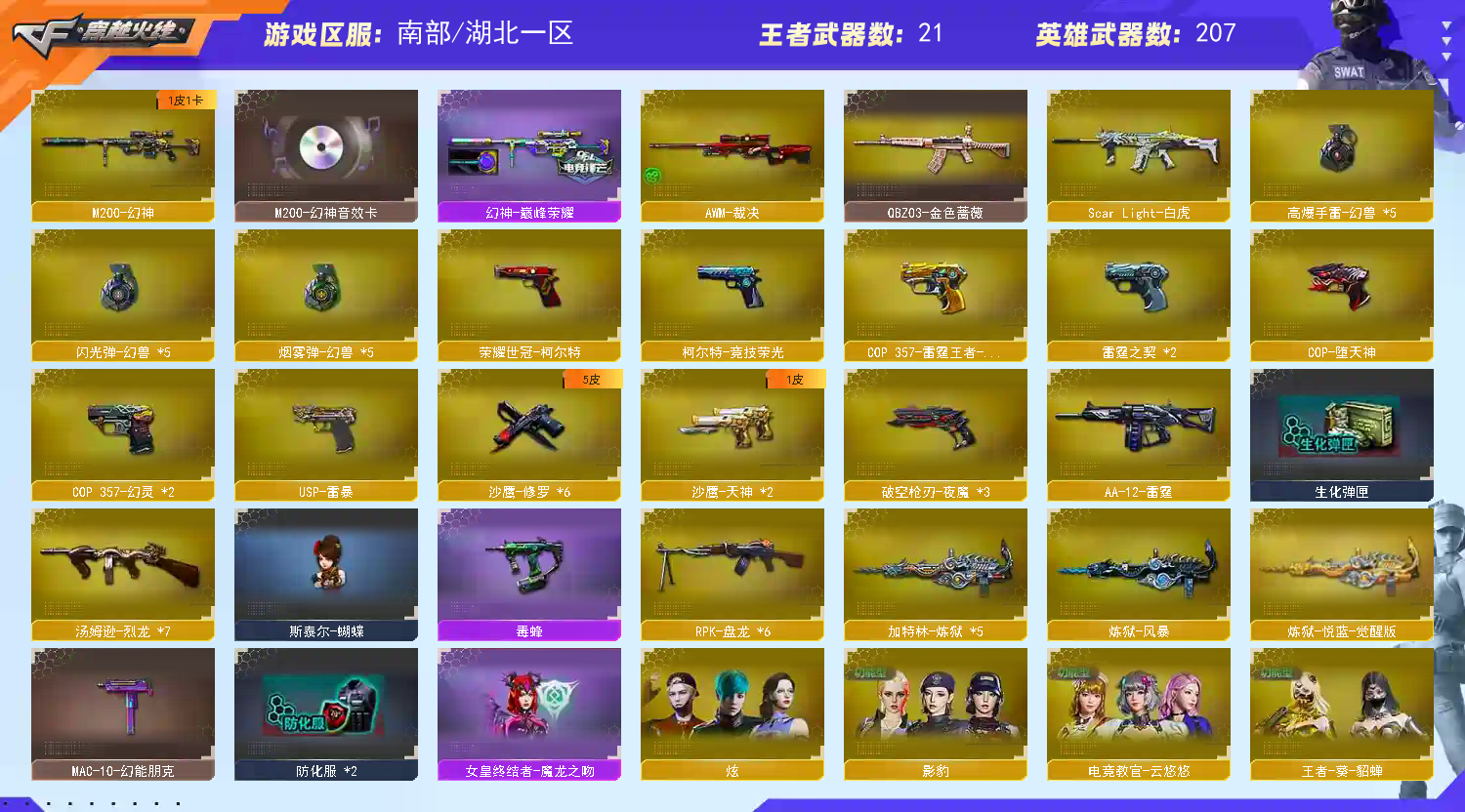 ★收藏好评! 由于异地登录保护机制,部分客户在使用客户端自动上号时会出现密码错误,注意本号密码不会错误,请多尝试5-6次!本账号已经过虚拟财产,请各位科技大神高抬贵手。请素质租号,文明游戏,谢谢大家配合!!;USP-雷暴,荣耀世冠-柯尔特,电竞教官-云悠悠,RPK-盘龙,QBZ03-金色蔷薇,M200-幻神,Scar Light-白虎,