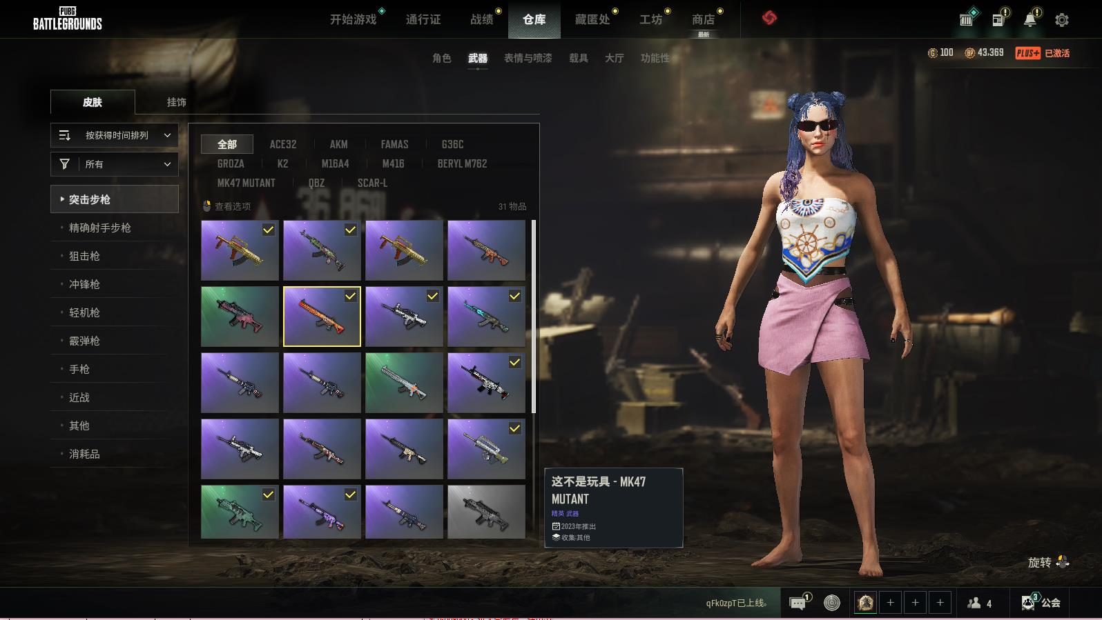 PUBG豪华版满级生存可排位,魔咒之力-MK12;黄道猎手-M416;彩虹之上-K2;弥诺陶洛斯-MINI14;粉梦长眠-M24;金色落叶-KAR98K;珍珠王朝-AWM;碎瓜考-平底锅;品红色烟雾弹投掷武器;镀金-GROZA;责性-RERYLM762;地狱火-M416;这不是玩具-MK47MUTANT;分形几何-0BZ;灵魂枷锁-AKM;皇家舰队-M16A4;三重彩-SCAR-L;蟒蛇花园-AKM;数码沙漠迷彩-M416;赛季33章技黄金-FAMAS;糖果碗-ACF32