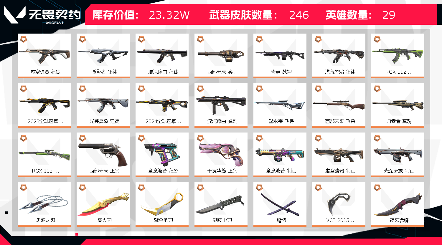 首页 > 租号大厅 > 无畏契约-wegame > wegame/wegame > 大库存号23w库存离火刃创纪元套光荣异象套rgx套电音光谱套神中神套西部套噬影套般若套24冠军套