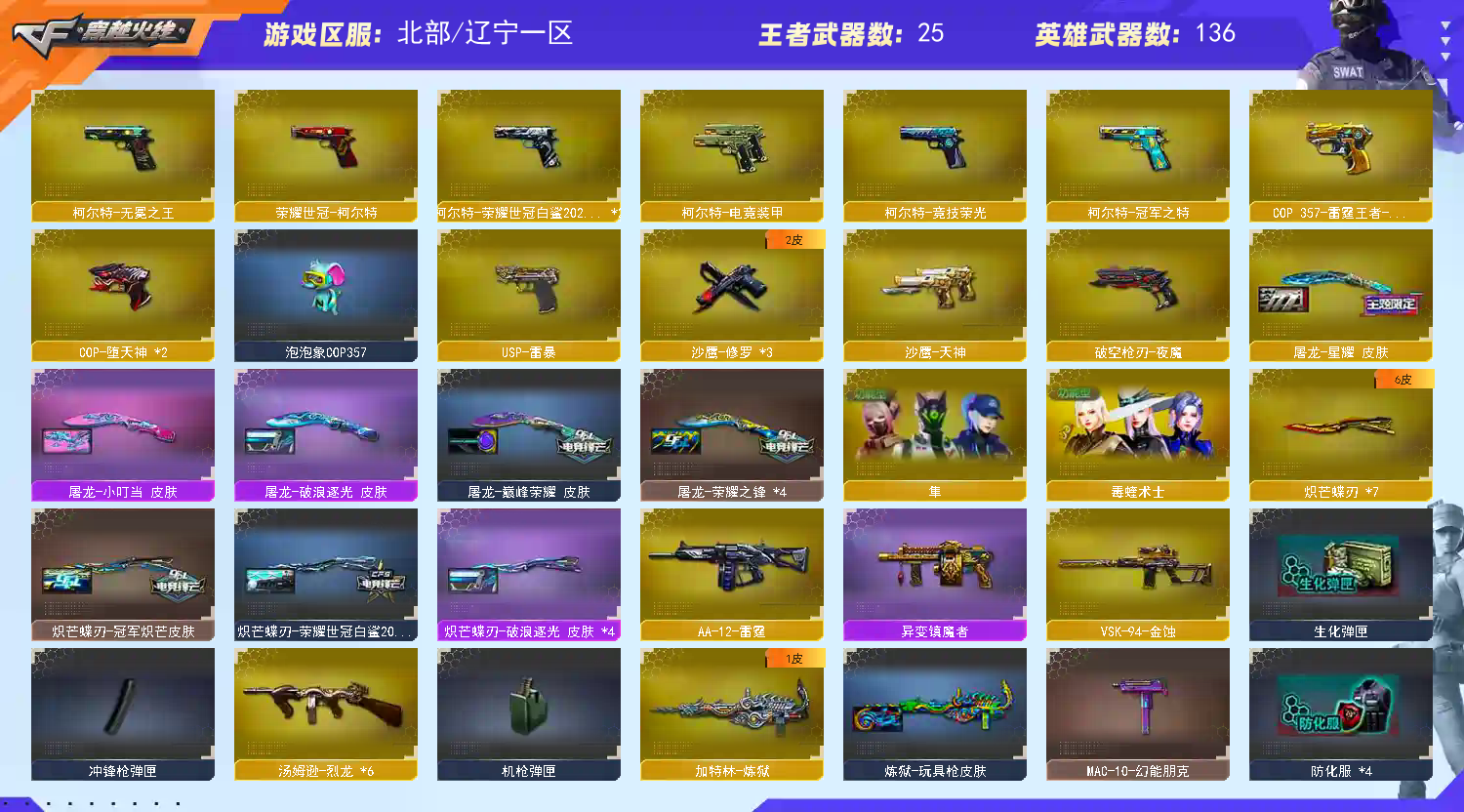 传说幽冥,传说幽瞳,M200-幻神,USP-雷暴,Kar98K-星神,王者幻神-觉醒版,柯尔特-冠军之特,M200-竞技荣光,Scar Light-白虎,炽芒蝶刃,加特林-炼狱,汤姆逊-烈龙,QBZ03-金色蔷薇,COP-堕天神,荣耀世冠-柯尔特,COP 357-雷霆王者-觉醒版,破空枪刃-夜魔,柯尔特-竞技荣光,AWM-裁决,Barrett-毁灭,M4A1-黑骑士,AWM-天龙,M4A1-堕天神,Barrett-极光,白虎-电玩蓝兔,M4A1-夜魔,M4A1-雷神,AK47-火麒麟,HK417-朱雀,荣耀世冠-雷神,9A91-烈火,AK47-机械迷城,AK47-黑鲨,M4A1-黑龙,M4A1-玫瑰精灵,AK47-无影,AN94-超新星,王者白虎-觉醒版,王者风势-觉醒版,王者之戮-觉醒版,天启-悦智-觉醒版,王者之烈-觉醒版,王者之魄-觉醒版,QBZ-03-王者蔷薇-觉醒版,王者之决-觉醒版,王者之力-觉醒版,雷霆王者之锋-觉醒版,G36C-幻影,AK47-B-常胜将军,AK47-B-战神,AK47-黑武士,AK-47-猩红传说,烈火-动感闪耀,QBZ191-银翼游侠,AA-12-雷霆,泡泡象COP357,修罗-古蛇迷踪,VSK-94-金蚀,柯尔特-无冕之王,柯尔特-荣耀世冠白鲨2023,玫瑰精灵-蓝调梦幻,金色蔷薇-古蛇迷踪,柯尔特-电竞装甲,天神-动感闪耀,沙鹰-天神,沙鹰-修罗,擎天-竞技荣光,龙啸,马来剑-夜魔,擎天,麒麟刺-堕天神,龙啸-堕天神,屠龙,荣耀世冠-龙啸,麒麟刺,屠龙-动感闪耀,烟雾弹-雷霆王者-觉醒版,闪光弹-雷霆王者-觉醒版,闪光弹-堕天神,高爆手雷-堕天神,烟雾弹-堕天神,烟雾弹-竞技荣光,闪光弹-竞技荣光,高爆手雷-竞技荣光,烟雾弹-电竞装甲,闪光弹-电竞装甲,恶棍-电竞装甲,烟雾弹-雷暴,高爆手雷-雷暴,高爆手雷-雷霆,烟雾弹-雷霆,烟雾弹-夜魔,高爆手雷-夜魔,闪光弹-夜魔,手雷-动感闪耀,炫金火麒麟,王者云击,高爆手雷-雷霆王者,Knife-冠军之刃,黄金猫猫手套-白鲨,匕首-幻能朋克,COP-白鲨,神圣爆裂者III,牛牛-AK47;USP-雷暴,柯尔特-无冕之王,荣耀世冠-柯尔特,柯尔特-荣耀世冠白鲨2023,传说幽冥,柯尔特-冠军之特,炽芒蝶刃,