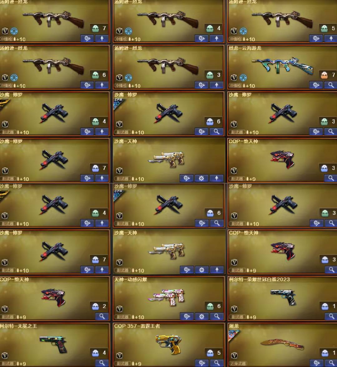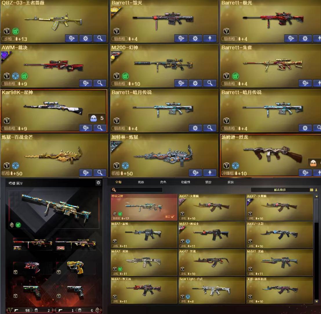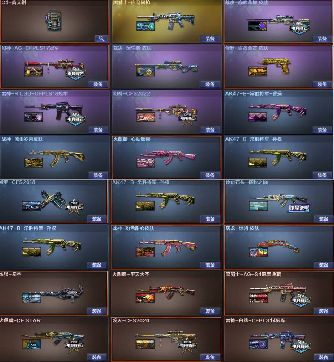 试炼挑战高伤: 9+3+168有擎天柱。群E角色 生化: 蝴蝶+7烈/裁决/炼狱+炼狱小刚。 爆破全装: 传说灵眸/13发子弹cop/无冕之王/柯尔特白鲨/雷霆王者cop+2堕天神cop/幻神+AG+2022/黑骑士+AG/雷神LGD+白鲨/王者蔷薇/白虎/星神/7套堕天神雷+堕天神全套,雷霆王者套;柯尔特-无冕之王,柯尔特-荣耀世冠白鲨2023,电竞教官-云悠悠,M200-幻神,Scar Light-白虎,传说灵眸,Kar98K-星神,