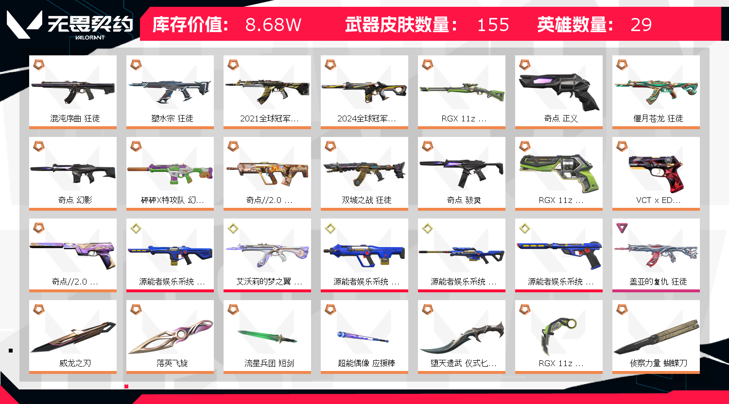 首页 > 租号大厅 > 无畏契约-wegame > wegame/wegame > 8.6w库存/2021-2024全球冠军赛全套/源能者全套/回火礼包:奇点礼包全套/双城之战/质量号