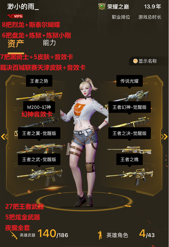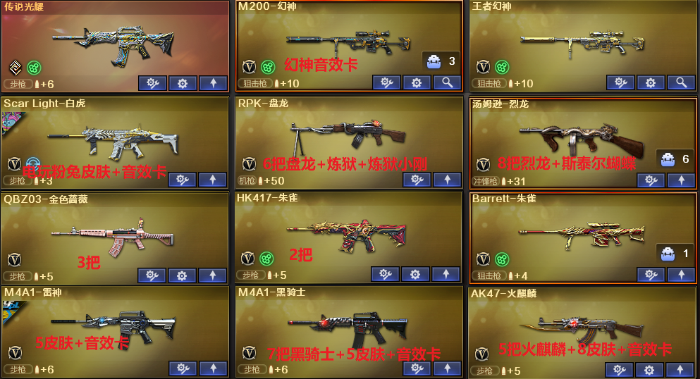 传说光耀|M200幻神音效|王者幻神|6烈斯太尔蝴蝶6盘炼狱|夜魔青龙朱雀白虎|9音效|生化爆破全装号 南部战区合区大区(江西一区、南方大区、湖南一区、湖南二区、湖北一区、湖北二区、广东一区、广西一区、广东二区、广东三区、广东四区)登录的时候选择湖北一区 【编号】:HB228 【角色】:凌霄、迷迭香、魅影、王者救赎主、王者葵貂蝉、王者瞳闭月羞花、王者玲珑、嘉年华灵狐、兰海滩派对、龙儿、女主播、木兰、烟雾保护头盔、双龙戒、双蛇戒、8周年戒 【主武】:传说光耀、幻神、王者幻神、6烈蝴蝶、6盘炼狱、青龙、白虎X(电玩粉兔)、朱雀X2、夜魔X2、Barrett朱雀、千变X2(孔明)、火麒麟X5(轻语、雷神)、黑龙、雷神(荣耀之魄、耀金、白鲨)、黑骑士X7(白马银枪、冠军之势、地狱火、耀金)、无影(耀金)、死神、黑武士X5、天启X2、龙血X3、QB金色蔷薇X3、烈火、黑武士网剧X6、天龙(70kg)、毁灭(AG)、激光、裁决(百城)、Barrett按月传说、AA12雷霆、冰龙粉碎者白马银枪、激光毁灭者3、巨龙咆哮者、乱世超越、神圣爆裂者末日3、斯泰尔恶棍、死亡之眼等活动武器 【副武】:修罗X2(星空、CFS2018)、天神、破空枪刃夜魔X2、天神网剧X5、COP平天大圣、皇家守卫、M66翔龙 【近身】:王者之啸X3、王者之击、屠龙X2、麒麟刺X3、尼泊尔雷霆、马来剑夜魔、擎天网剧X5、等离切割者、破天斩魔剑、斩神刀 【投掷】:雷霆套装、夜魔套装X7、迷你生化手雷 【道具】:毁灭音效卡、黑骑士音效卡、火麒麟音效卡、雷神音效卡、激光音效卡、裁决音效卡、幻神音效卡、白虎音效卡、黑龙音效卡、赛博猫猫玩偶、15周年玩偶、蝴蝶玩偶、兔女郎玩偶、CFS纪念版人偶、天使灵狐玩偶、梧桐玩偶、葵玩偶、魅影玩偶、王者刀锋玩偶、14个背包、超级背包、炫彩背包、AC(防弹头盔+防弹衣)、C4工具钳、手雷包、防化服、夺命之镰、变异宝贝、挑战弹匣;RPK-盘龙,QBZ03-金色蔷薇,M200-幻神,Scar Light-白虎,