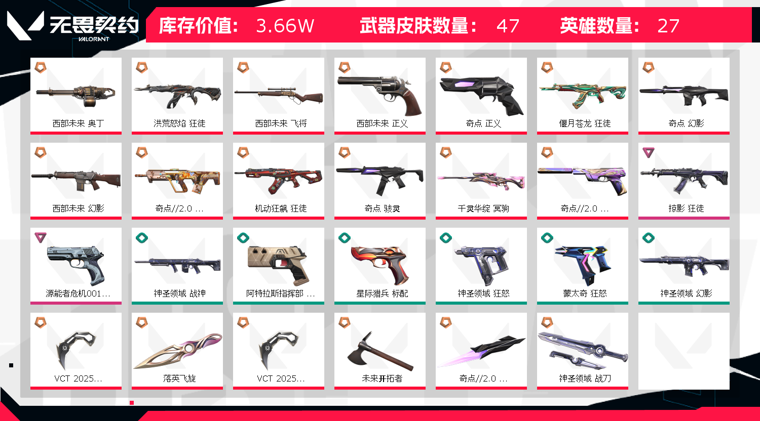 恭祝各位老板新的一年学业有成,事业有成,幸福美满,请勿开挂,请勿挂机谢谢,到时可继续游戏 尽量完成每一把;西部未来 奥丁,VCT 2025 爪刀,洪荒怒焰 狂徒,掠影 狂徒,西部未来 飞将,西部未来 正义,奇点 正义,