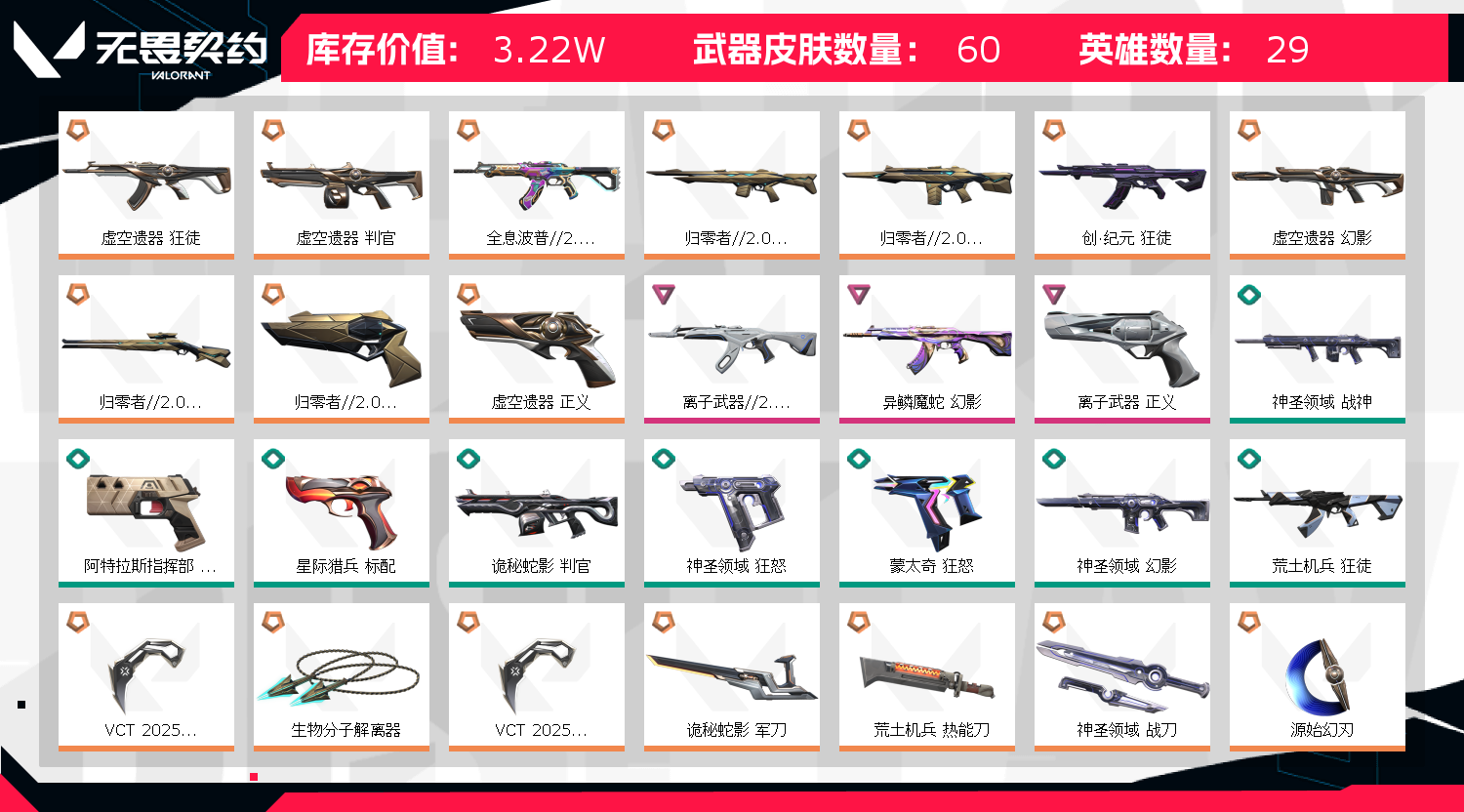 可排位 英雄22 武器皮肤数量55;VCT 2025 爪刀,虚空遗器 狂徒,异鳞魔蛇 幻影,离子武器//2.0 狂徒,离子武器 正义,