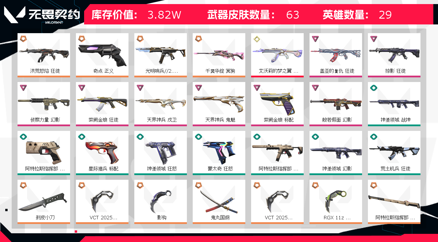 ⚡提示冻结的话麻烦等5分钟!号主会马上解冻!⚡ ⚡上不去号的重启上号器⚡ ⚡如有频繁登录,关闭 Wegame,重新登录上号器⚡ 本账号已经在公安局做了虚以 财产登记。若是因为外挂行为导致账号被封。租号玩实 ming制的。还有游戏ip登录记录,不管你在哪都能抓住 你,最后造成的财产损失,不是你承担就是你家人承 担。切勿以身犯法。文明游戏, 会第1时间更新新套 装喜欢可以收藏,店铺内更多游戏账号挑选 挂机永 久拉黑,不要挂机不要开G谢谢好兄弟配合,超时会自动 下线请合理安排时间。 最后 各位老板轻点炸!感谢!;剥皮小刀,VCT 2025 爪刀,盖亚的复仇 狂徒,洪荒怒焰 狂徒,掠影 狂徒,侦察力量 幻影,紫阙金琅 狂徒,