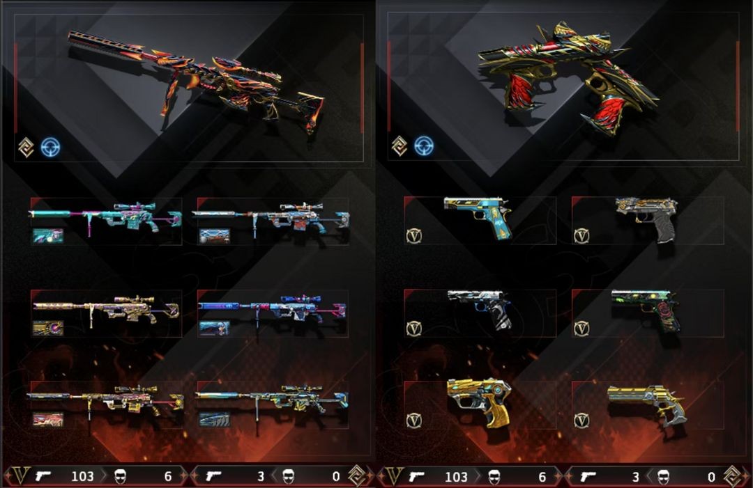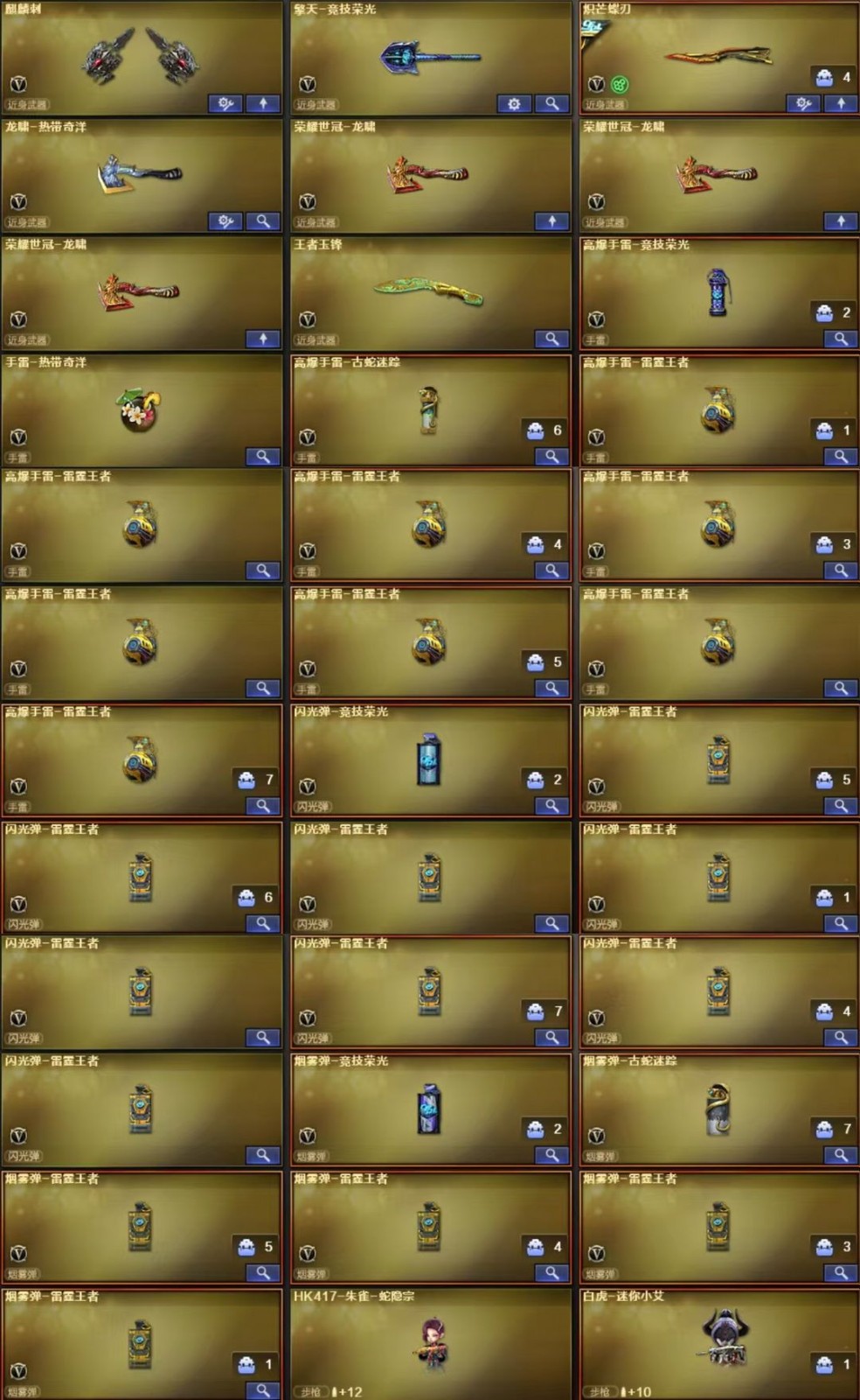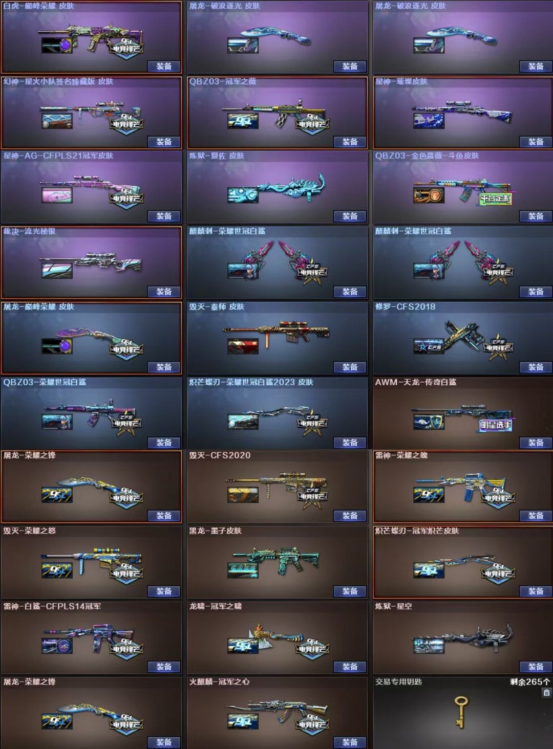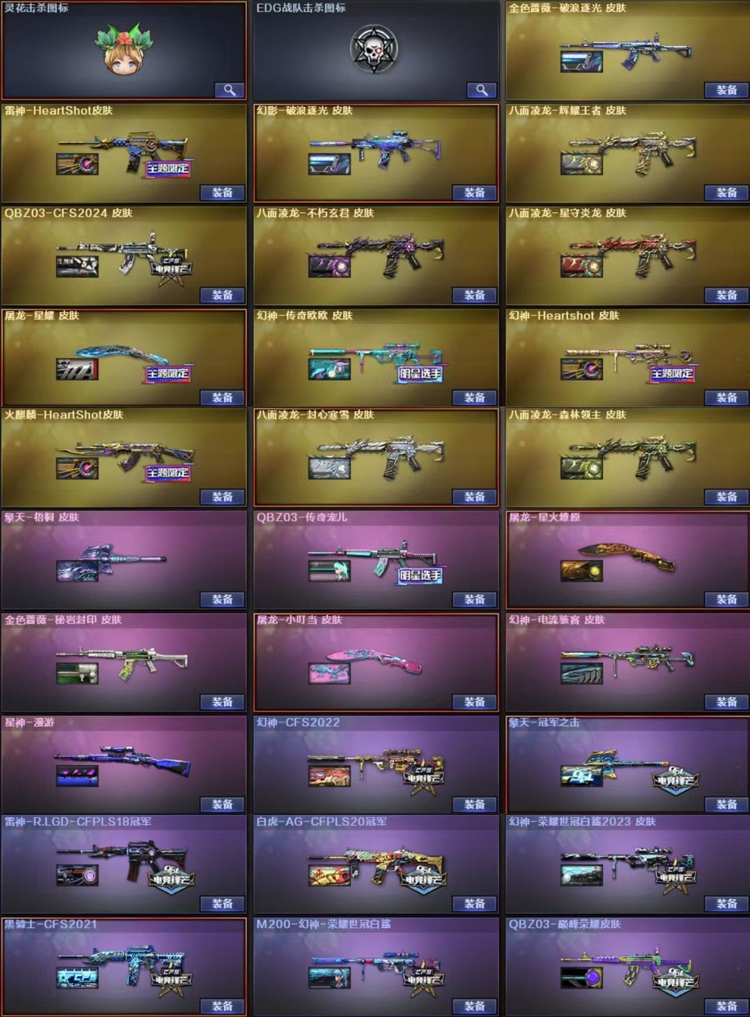 AWM-天龙、柯尔特-荣耀世冠白鲨2023、M200-幻神、AN94-超新星、Kar98K-星神、麒麟刺、M4A1-黑龙、Scar Light-白虎、USP-雷暴、M4A1-雷神、高爆手雷-竞技荣光、闪光弹-竞技荣光、擎天-竞技荣光、柯尔特-竞技荣光、M200-竞技荣光、烟雾弹-竞技荣光、加特林-炼狱、M4A1-黑骑士、AK47-火麒麟、荣耀世冠-龙啸、荣耀世冠-火麒麟、荣耀世冠-柯尔特、荣耀世冠-雷神、AA-12-雷霆、Barrett-毁灭、QBZ03-金色蔷薇、COP 357-雷霆王者-觉醒版、炫金雷神、王者破空枪刃、王者玉锋、王者幻神-觉醒版、炫金火麒麟、王者白虎-觉醒版、雷霆王者之锋、COP 357-雷霆王者、高爆手雷-雷霆王者、王者霜心、关小雨、王者-魅影、圣诞潘多拉-X、生化弹匣、Kar98K-星神音效卡、Scar Light-白虎音效卡、QBZ03-天罚音效卡、QBZ03-金色蔷薇音效卡、M14EBR-玄武音效卡、Barrett-毁灭音效卡、M200-幻神音效卡、M4A1-雷神音效卡、AWM-裁决音效卡、八面凌龙音效卡、M4A1-黑骑士音效卡、星神古蛇迷踪音效卡;USP-雷暴,柯尔特-无冕之王,荣耀世冠-柯尔特,柯尔特-荣耀世冠白鲨2023,传说幽冥,柯尔特-冠军之特,炽芒蝶刃,