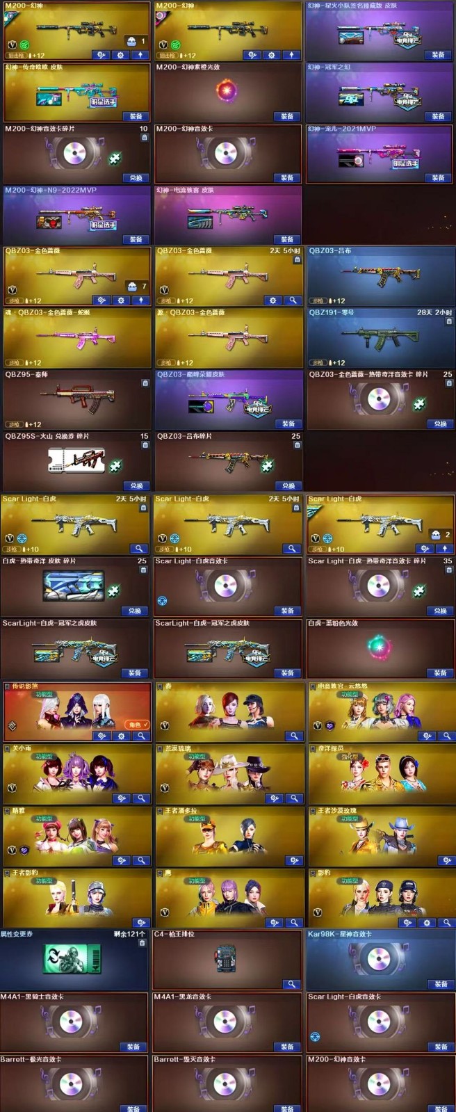 王者武器:王者之锋-觉醒版;王者之心-觉醒版;王者之霆;炫金毁灭;凤吟之魄;炼狱-悦蓝-觉醒版;炫金无影;炫金武士;王者星霆;王者之击-觉醒版;王者之势;炫金雷神 英雄武器:AK47-黑鲨;烟雾弹-幻灵;COP 357-幻灵;闪光弹-幻灵;黑武士-锦绣游龙;高爆手雷-幻灵;擎天;高爆手雷-雷暴;传说破晓;M14EBR-玄武;炽芒蝶刃;烟雾弹-雷暴;闪光弹-雷暴;AK47-火麒麟;M4A1-幻灵;M4A1-黑骑士;Scar Light-白虎;柯尔特-冠军之特;麒麟刺;手雷-云海游龙;擎天-云海游龙;Barrett-毁灭;烈龙-云海游龙;RPK-盘龙;QBZ03-金色蔷薇;G36C-幻影;AA-12-雷霆;AWM-裁决;龙啸;M200-幻神;沙鹰-修罗;手雷-热带奇洋;M4A1-雷神;龙啸-烈火龙威;超新星-热带奇洋;龙啸-热带奇洋;传说灵眸;汤姆逊-烈龙;M4A1-龙血;烟雾弹-竞技荣光;雷霆之锋;闪光弹-雷霆;雷霆之怒;高爆手雷-竞技荣光;烟雾弹-雷霆;M4A1-雷霆;闪光弹-竞技荣光;斩神刀-雷暴;雷霆之契;Barrett-极光;M4A1-青龙;M4A1-黑龙;AN94-超新星;幻灵;USP-雷暴,柯尔特-冠军之特,炽芒蝶刃,Knife-冠军之刃,传说影煞,传说星骇,隼,